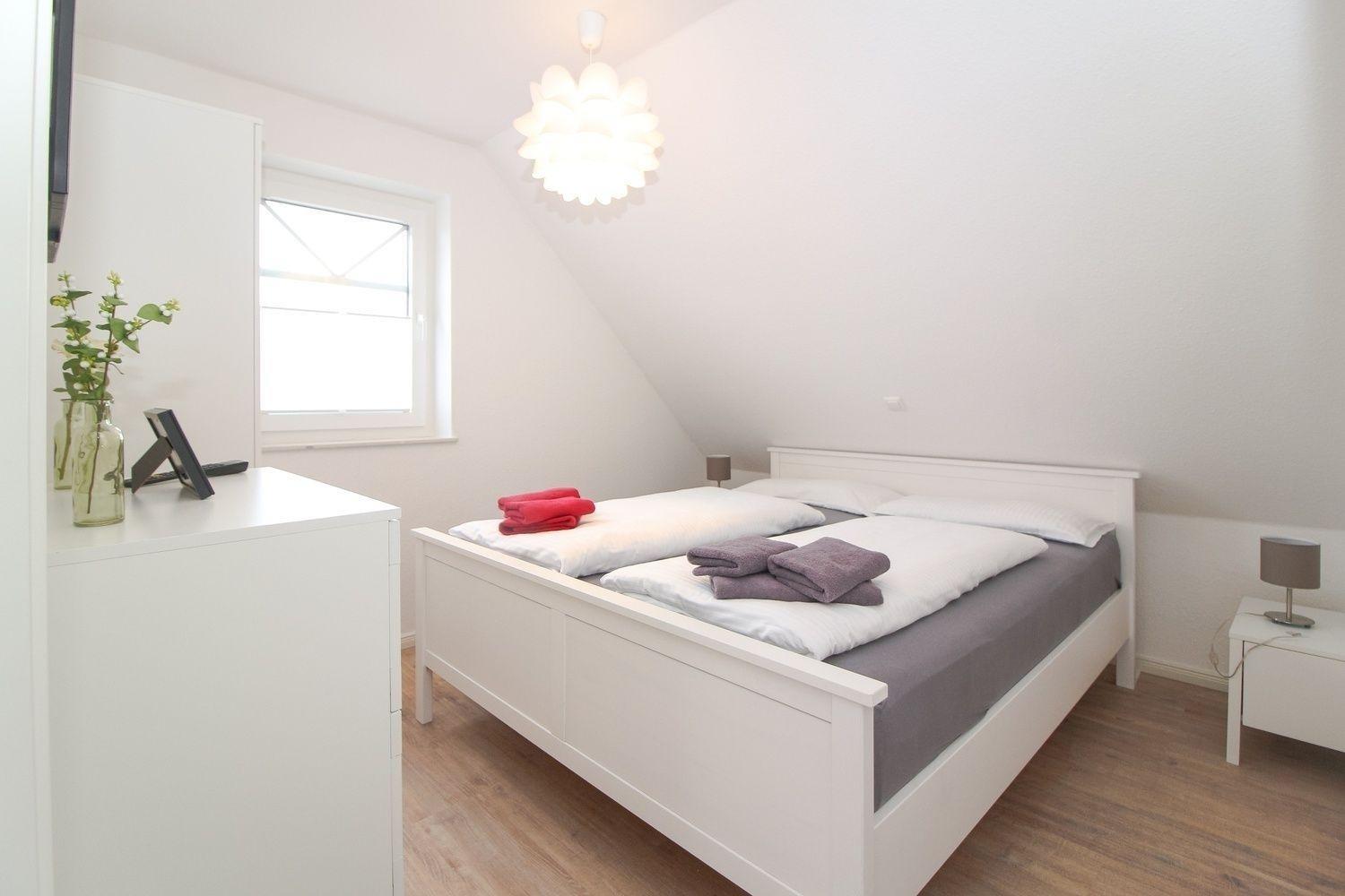 Es sind 2 Schlafräume vorhanden; 1x mit Doppelbett und zweitem Flachbild-TV und 1x mit Einzelbett. Beide Schlafräume haben ausreichend Stauraum für Kleidung u.a.