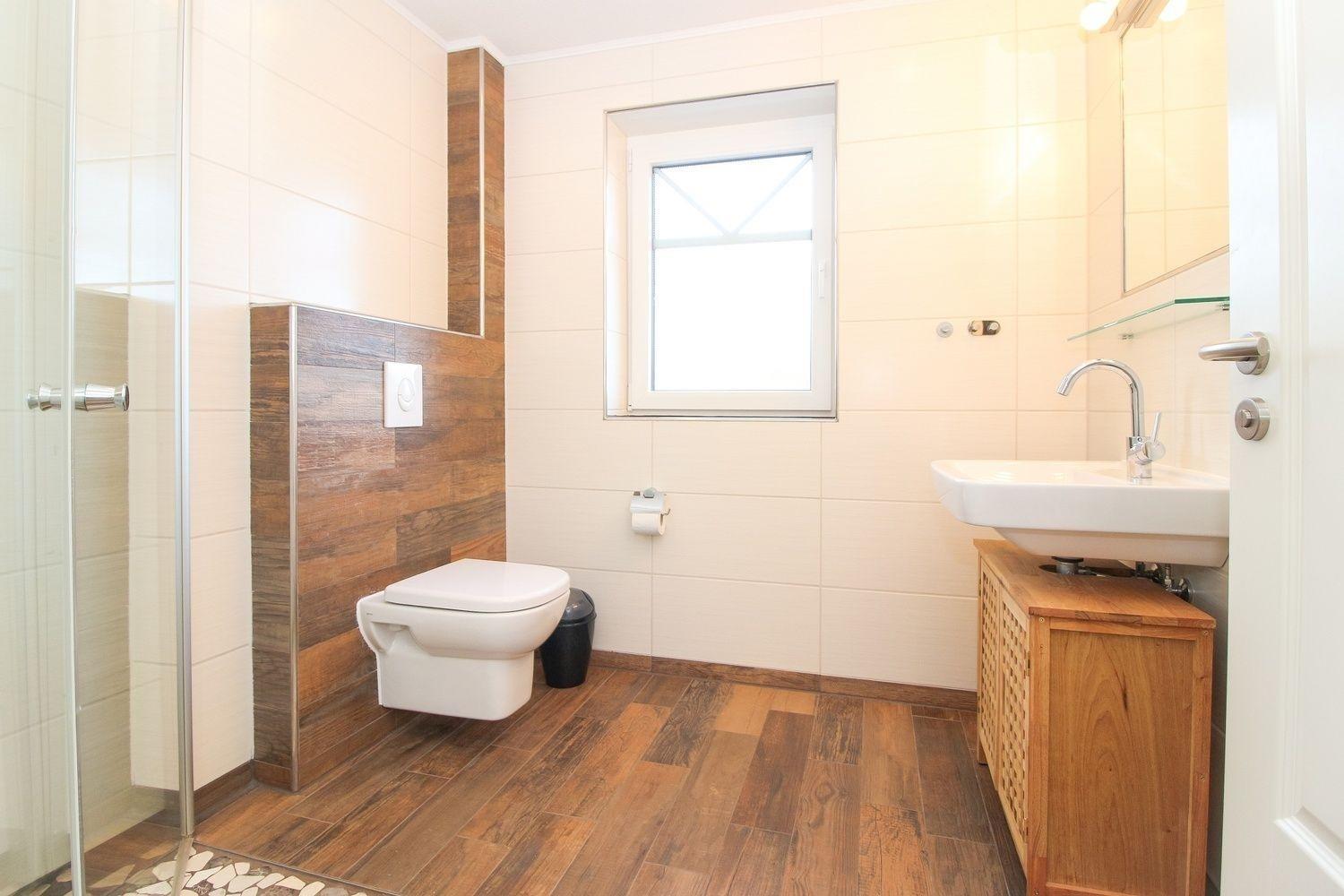 Die Fußböden erhielten einen Designboden in Holzoptik, der auch für Allergiker geeignet ist. Das Bad ist gefliest. Die meisten Fenster haben elektrische Außenrollläden, Plissees sowie Fliegengitter.