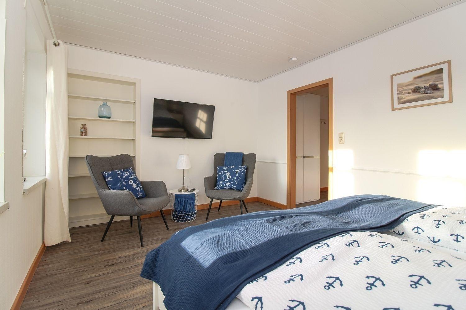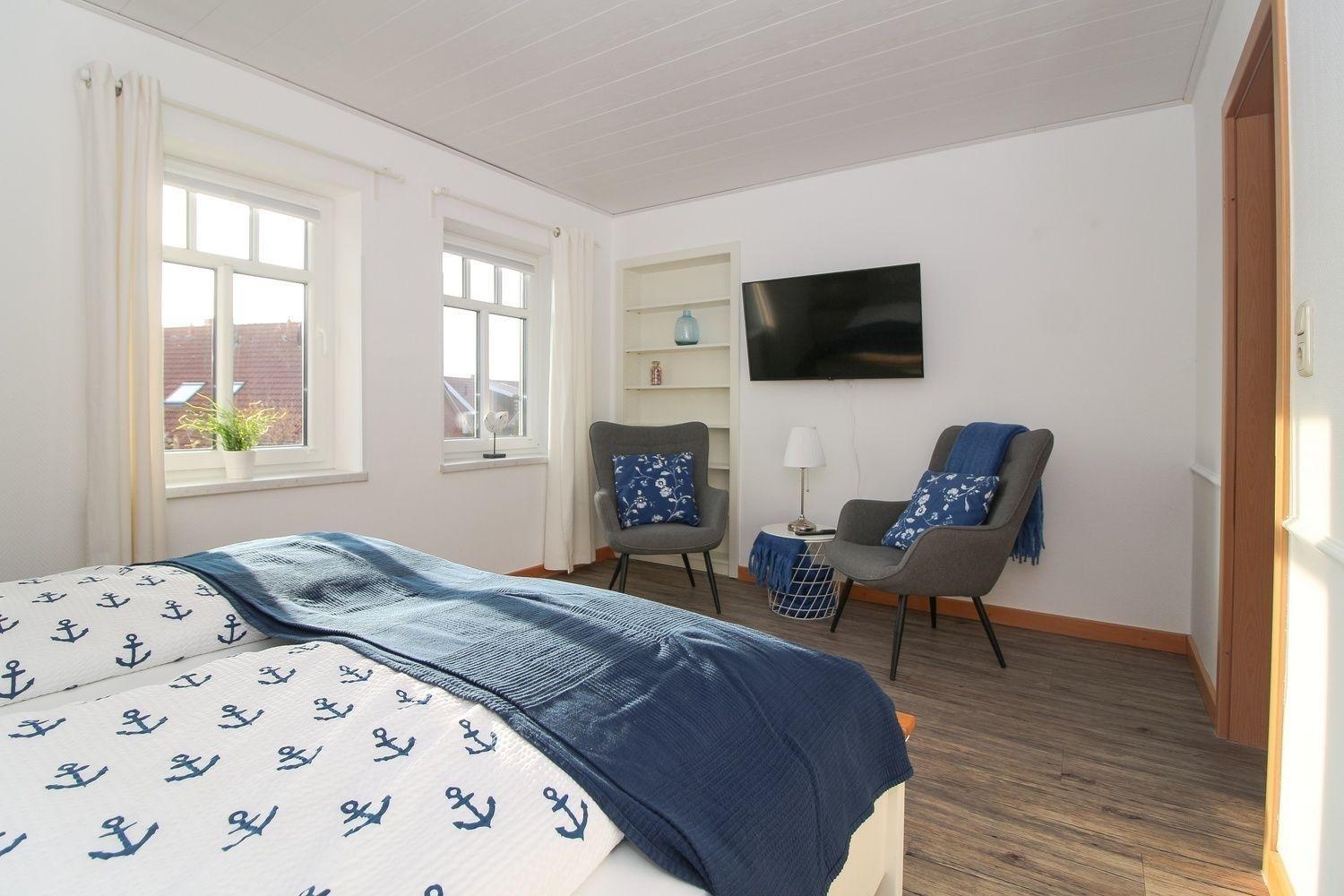 Gemütliches Doppelzimmer mit TV, WLAN und Fahrradgarage in Greetsiel, ideal für Radfahrer und Naturfreunde.