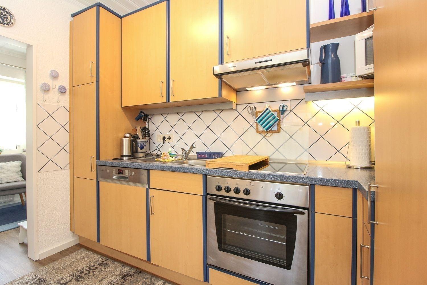 Der Wohn- Essbereich ist sehr gemütlich und ansprechend eingerichtet, Stressless-Sitzmöbel und Vollholzmöbel, sowie mit allem notwendigen Zubehör ausgestattet. Großer Fernseher (SAT), Musikanlage/CD und WLAN sind selbstverständlich. Die integrierte Küche verfügt über alle notwendigen Elektrogeräte und natürlich auch über einen Geschirrspüler. Vom großzügigen hellen Wohnbereich haben Sie direkten Zugang auf die Terrasse (mit Markise) und den, die ganze Wohnung umgebenden Gartenbereich mit bequemen Gartenmöbeln sowie einem Strandkorb.