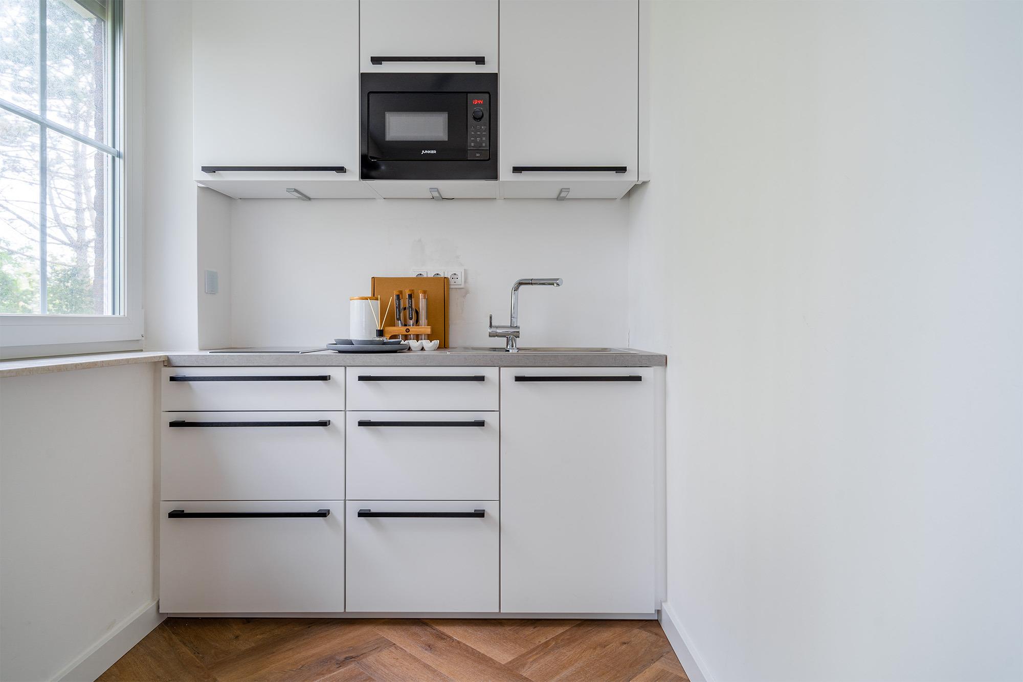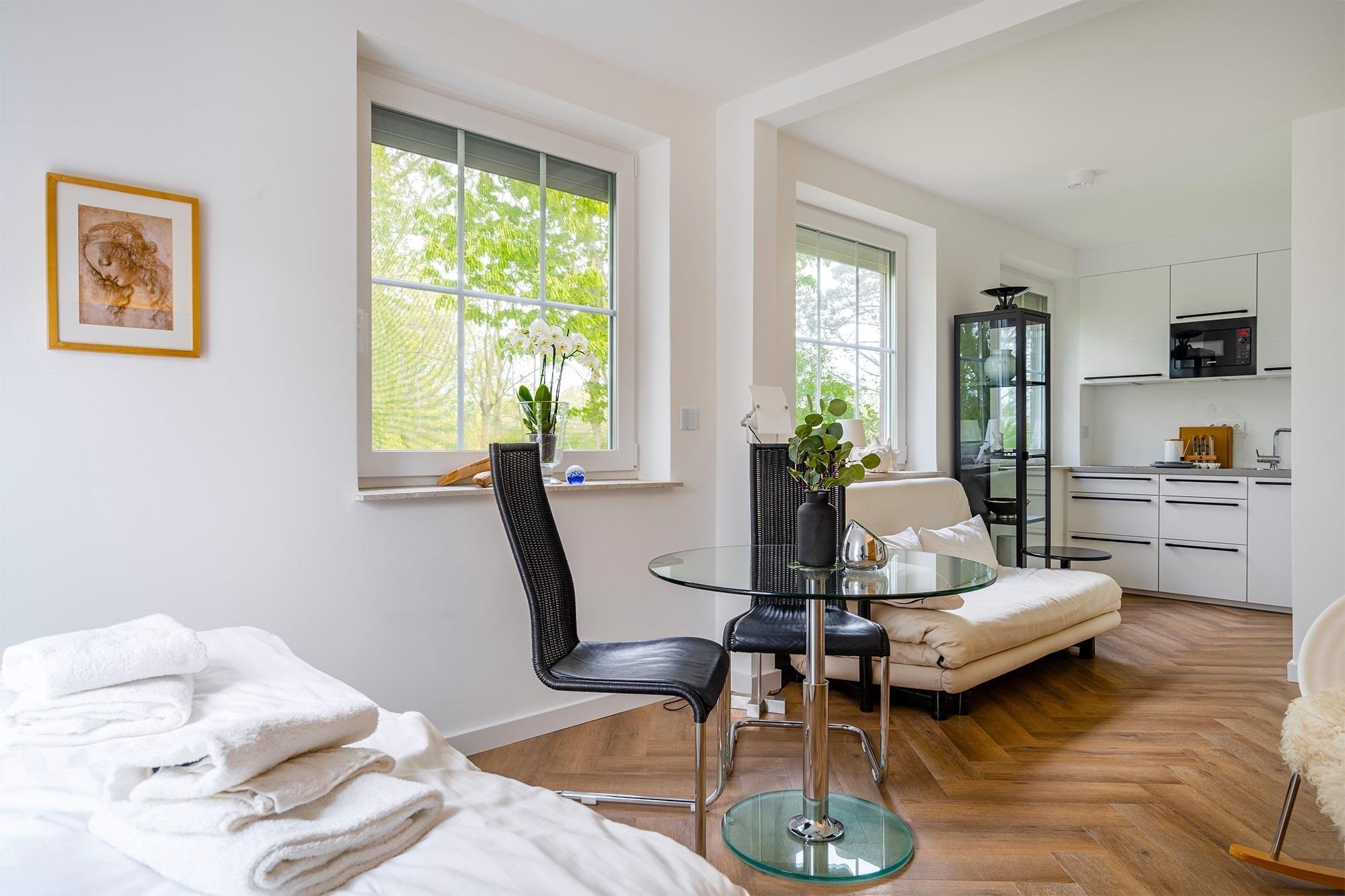 Unser neues Design-Apartment "Chilly-Breeze 2" finden Sie in ruhiger Lage unweit des Deichs mitten im Grünen am Ortsrand von Greetsiel. Auf etwa 35qm verfügt diese Wohnung über einen lichtdurchfluteten und offen gestalteten Wohn-Schlafraum mit voll ausgestatteter kleinen Küchenzeile, einem Esstisch, einem bequemem Boxspringbett, sowie einem Tageslichtbad mit ebenerdiger Dusche. Die Wohnung wurde besonders hochwertig und mit viel Liebe zum Detail ausgestattet, sodass Sie hier das ein oder andere Designobjekt finden und sich wohl fühlen können. Genießen Sie die Sonnenstunden beispielsweise in dem Strandkorb in dem natürlichen, parkähnlichen Gemeinschaftsgarten der alten Greetsieler Villa, der auch eine kleine Sitzecke bietet. Bei "Schietwetter" bietet sich eine Trainingseinheit im kleinen gemeinschaftlichen Fitnessraum an. Neben einem PKW-Parkplatz stehen natürlich Abstellmöglichkeiten für Fahrräder zur Verfügung.