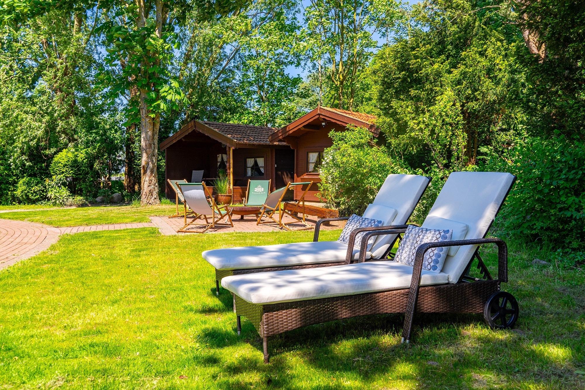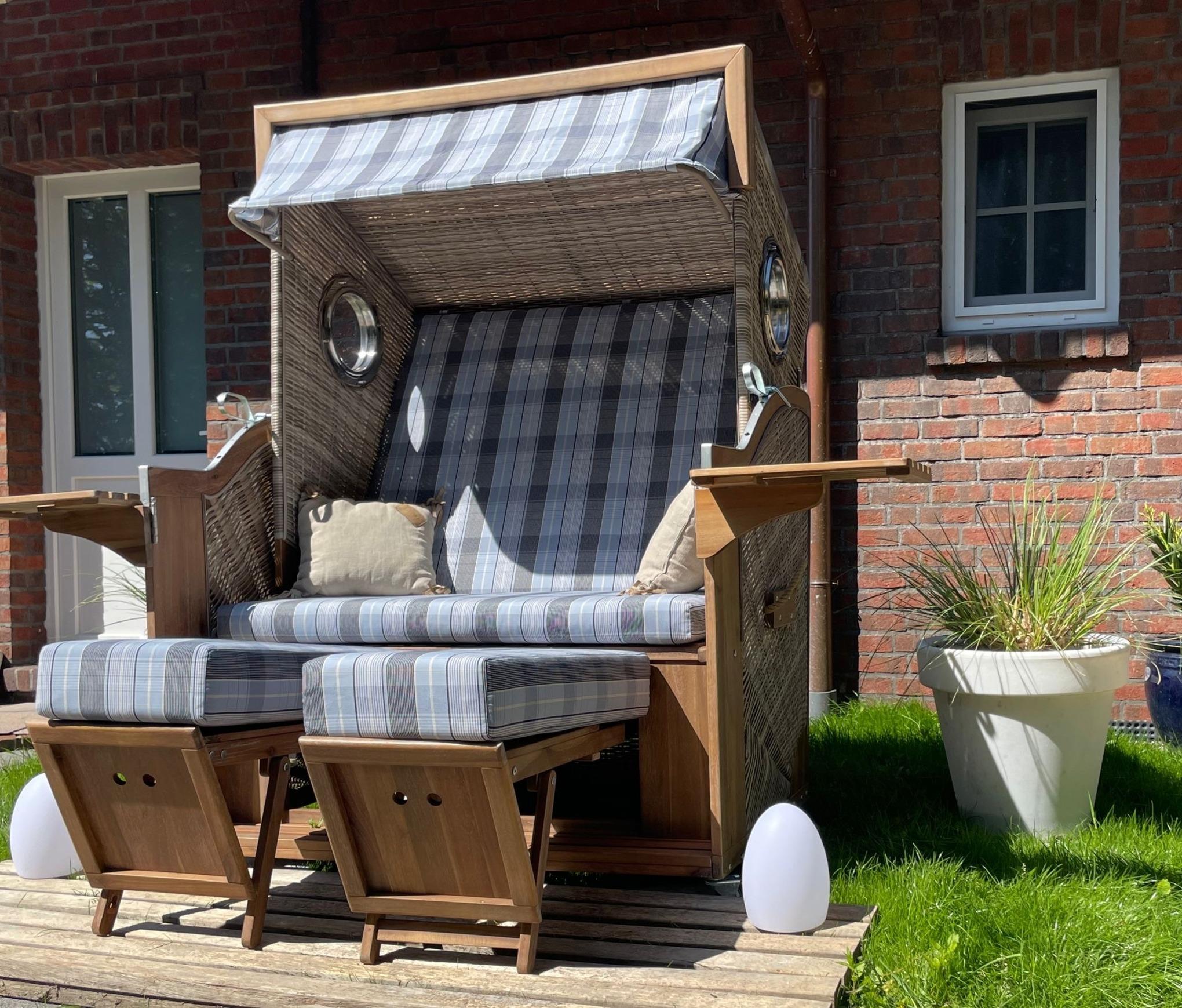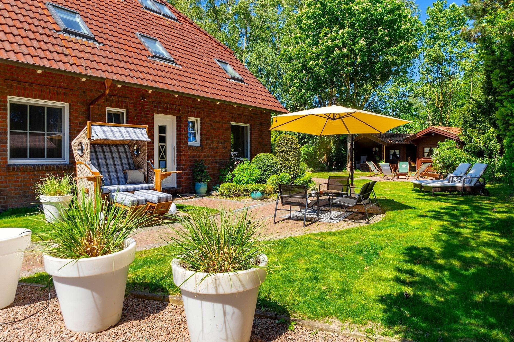 Modernes Design-Apartment in Greetsiel mit Garten, Fitnessraum und Strandkorb, ideal für einen entspannten Urlaub im Grünen.