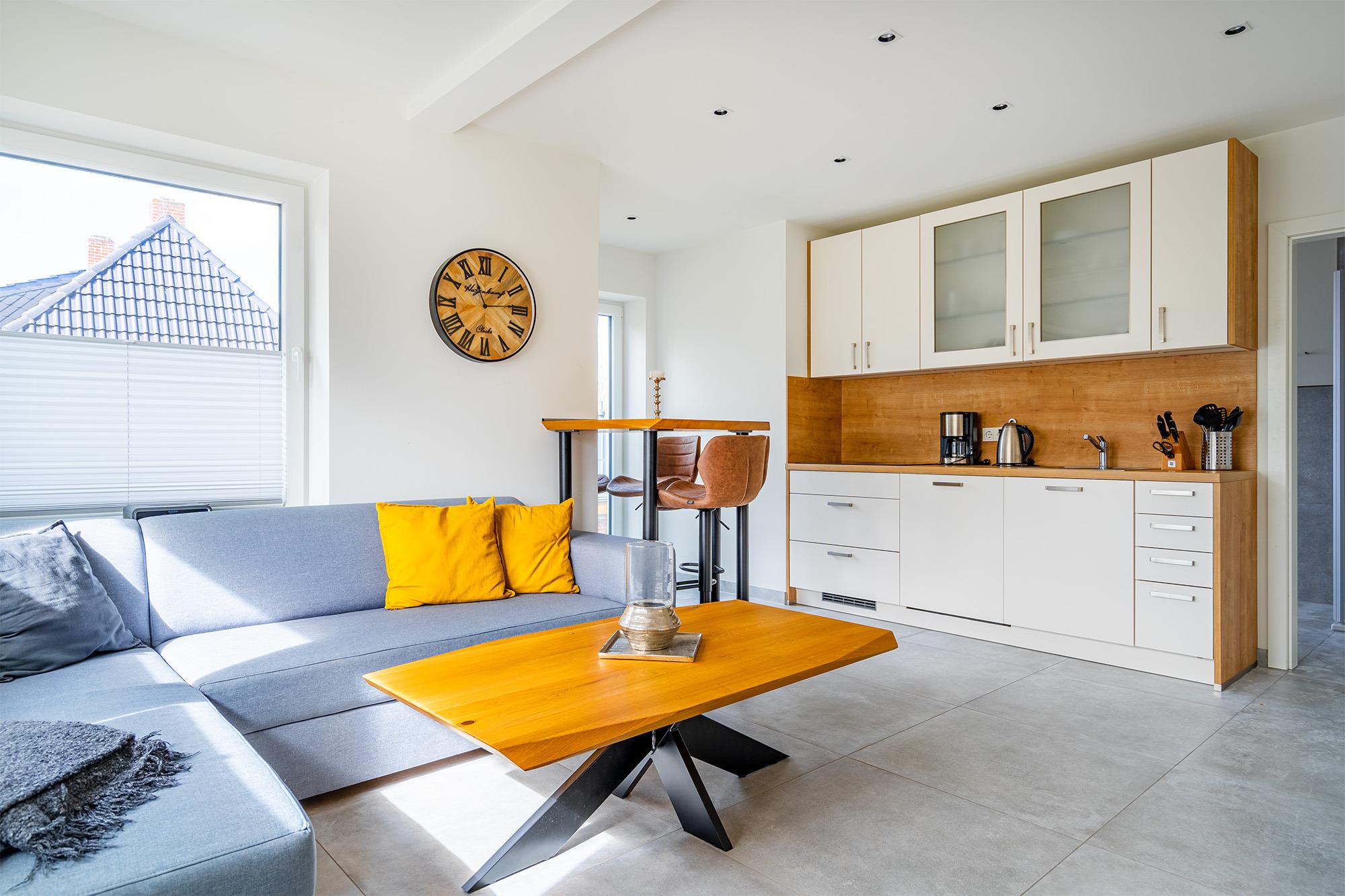 Unsere Wohnung "Die Zimmerei 2" bietet sich mit ihren etwa 70qm als perfektes Urlaubsdomizil an. Sehr zentral und dennoch ruhig in einer durchfahrtsbeschränkten Straße gelegen bietet sie einen hellen und modernen Wohn-Ess-Bereich mit einer großzügigen und voll ausgestatteten Küchenzeile, sowie einen Esstisch (Hochtisch). Sie finden außerdem zwei Schlafzimmer mit bequemen und hochwertigen Boxpspringbetten sowie ein geräumiges Tageslichtbad. Auch ein Abstellraum mit einem Waschtrockner ist vorhanden. Trotz der Lage im Obergeschoss bietet die Wohnung außerdem eine Sonnenterrasse, die sie über den Hauseingang und eine Treppe im Garten erreichen. Selbstverständlich steht Ihnen ein eigener Parkplatz am Haus zur Verfügung. Sollten Sie mit einem E-Auto anreisen, verfügt das Objekt auch über eine Ladesäule, die Sie hinzu buchen können.
