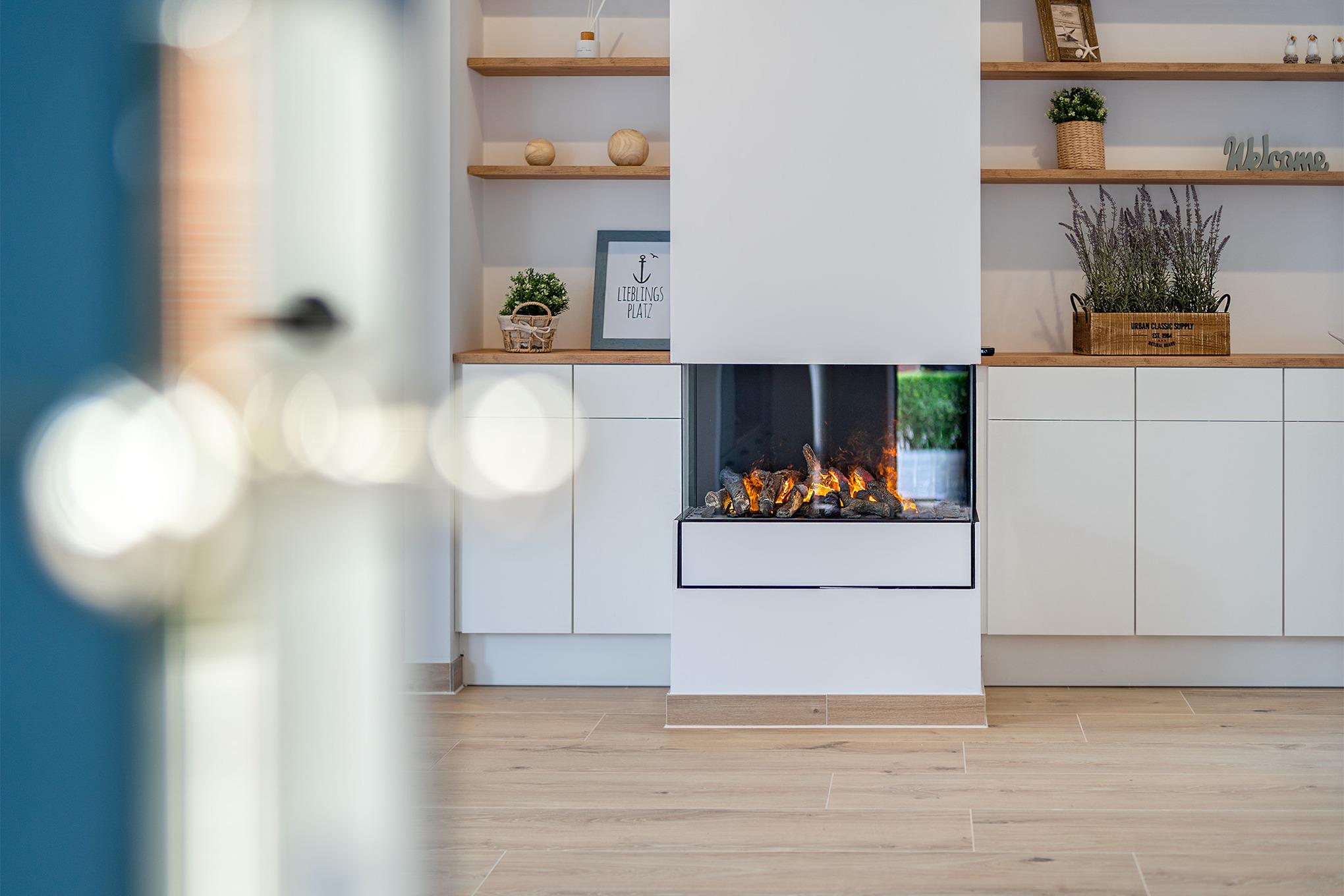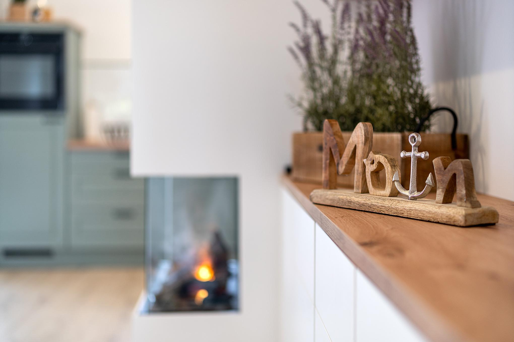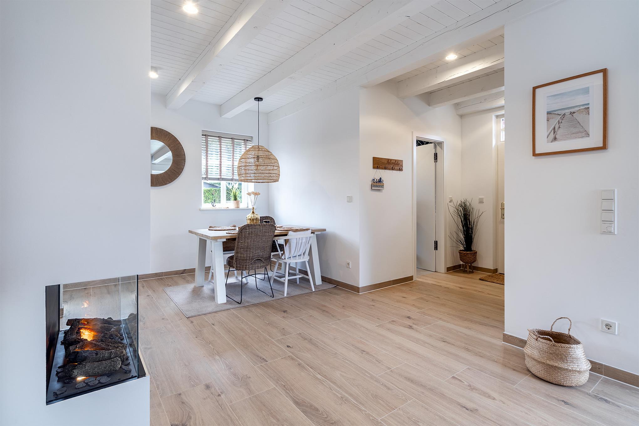 Im Erdgeschoss verfügt das hochwertige Ferienhaus über eine voll ausgestattete Küche, einen Essbereich und ein Wohnzimmer mit Elektro-Kamin. Hier befindet sich auch das großzügige Tageslichtbad mit bodengleicher Dusche und Doppelwaschtisch.