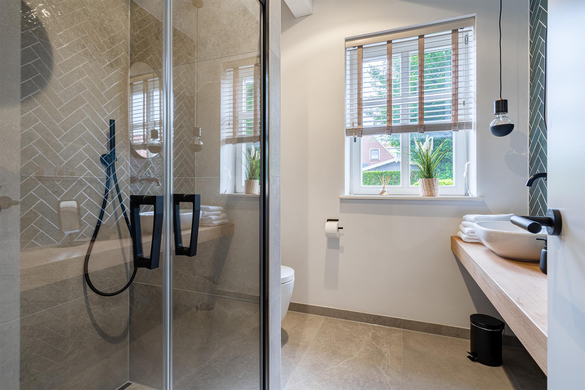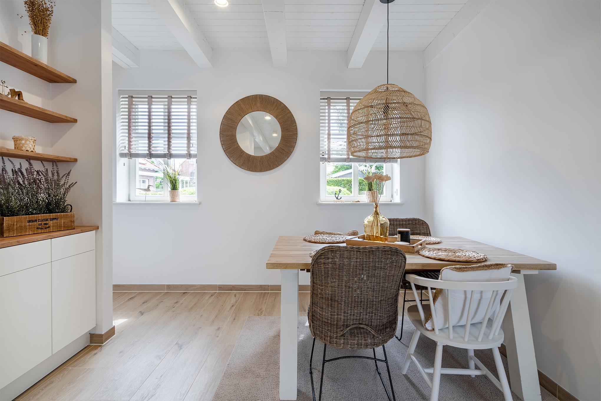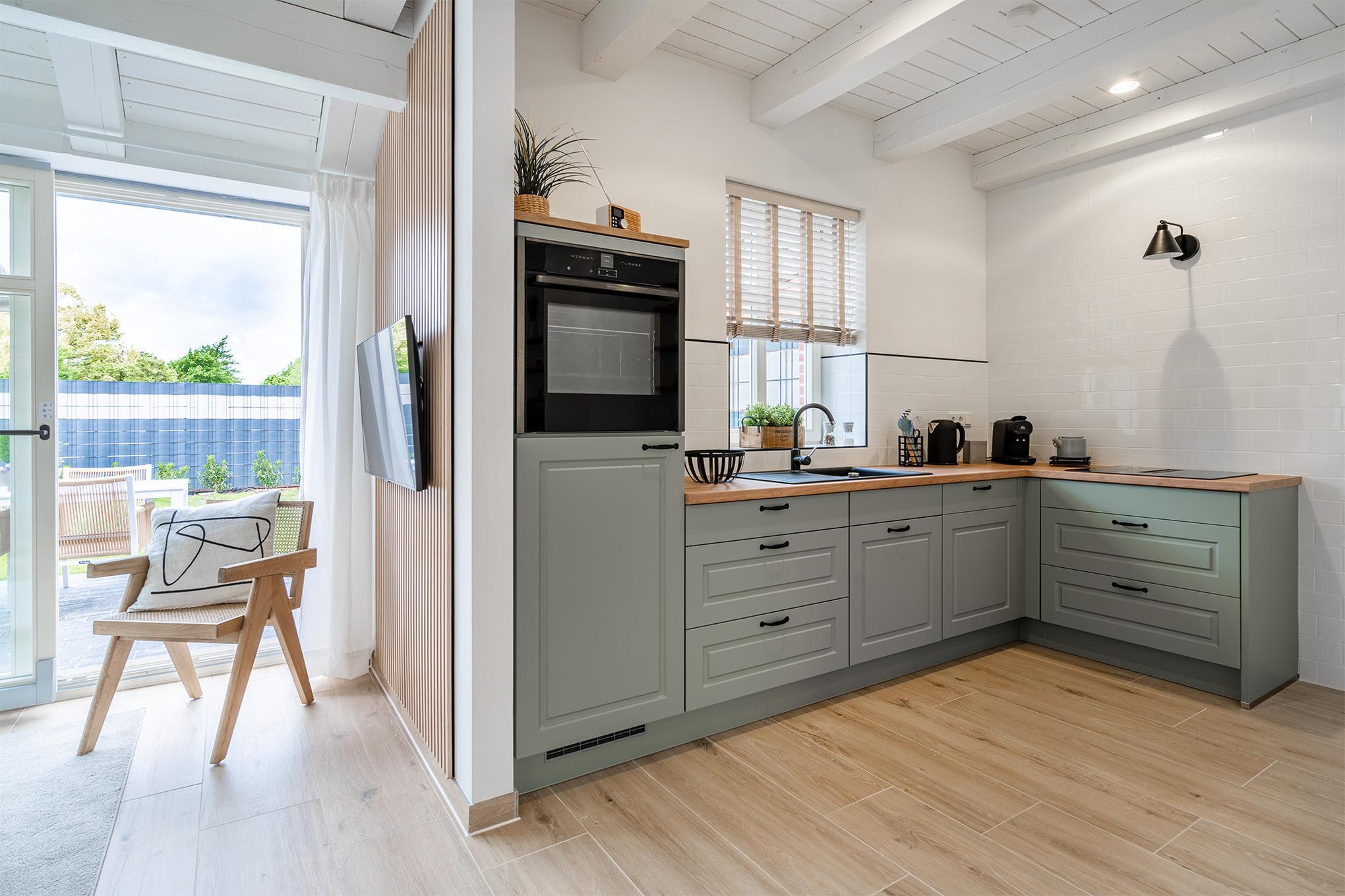 Im Erdgeschoss verfügt das hochwertige Ferienhaus über eine voll ausgestattete Küche, einen Essbereich und ein Wohnzimmer mit Elektro-Kamin. Hier befindet sich auch das großzügige Tageslichtbad mit bodengleicher Dusche und Doppelwaschtisch.