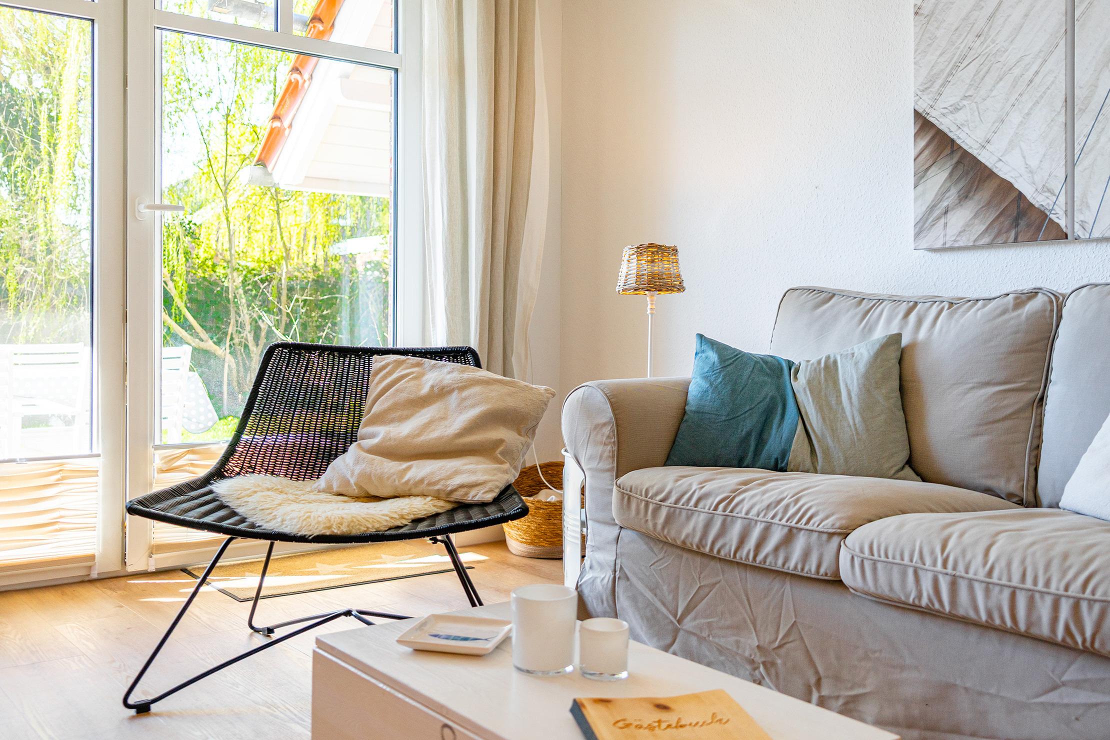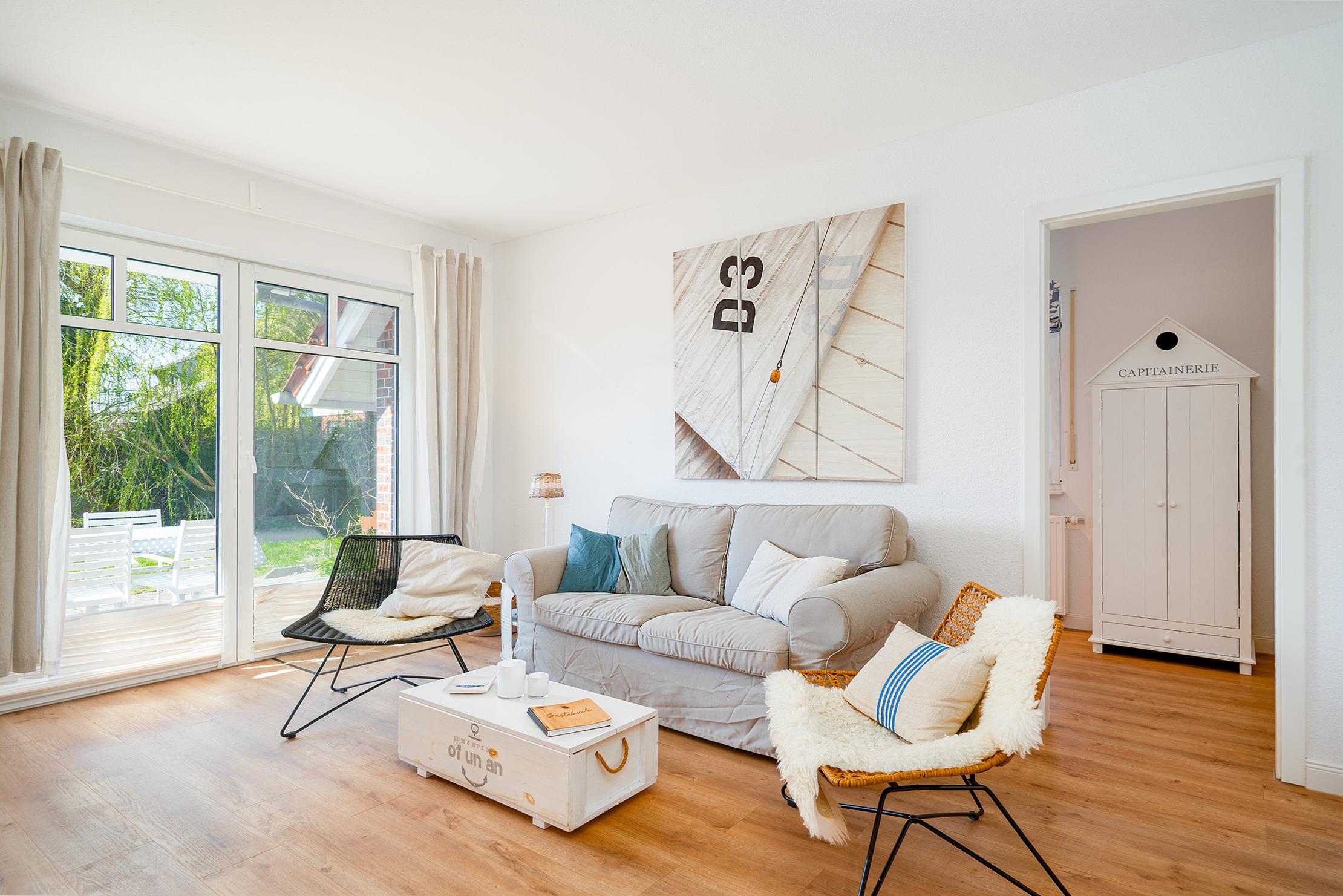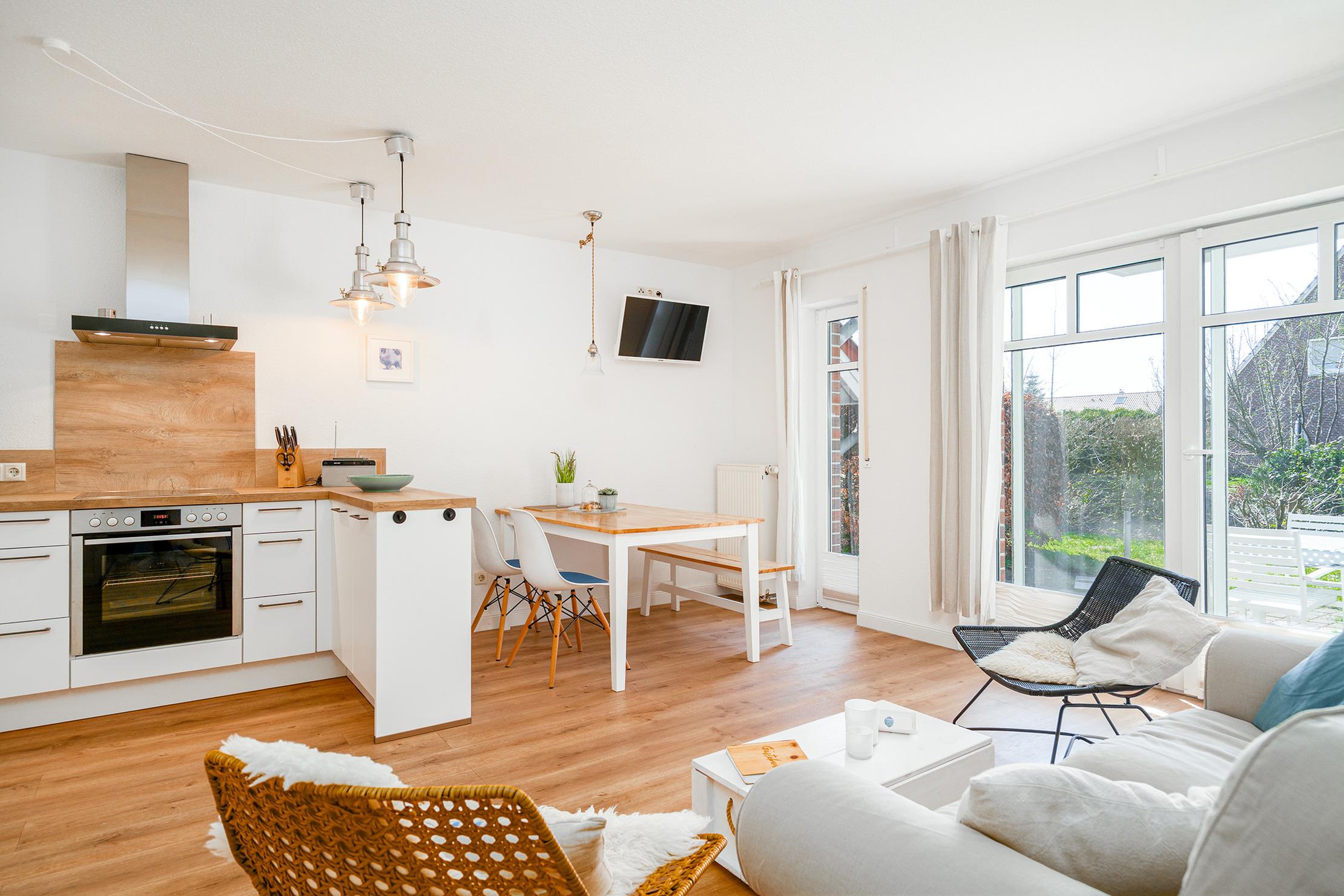 Unsere ebenerdige Ferienwohnung "of und an" wurde erst kürzlich vollständig renoviert und befindet sich in zentraler Lage direkt hinter dem Deich. Mit ihrer nordischen Einrichtung in sanften Natur- und Weißtönen schafft die Wohnung eine gemütliche Atmosphäre. Auf etwa 70qm bietet sie einen hellen und hochwertig eingerichteten Wohnbereich mit einer großen und voll ausgestatteten Küchenzeile, einen Essbereich sowie eine einladende Sofaecke für gemeinsame Abende. Neben einem Tageslichtbad mit ebenerdiger Dusche verfügt die Wohnung über zwei Schlafzimmer mit Doppelbetten. Auch ein Abstellraum steht zur Verfügung. Die großzügige Terrasse mit Garten erreichen Sie bequem durch den Wohnbereich, hier lässt sich die frische Nordseeluft bestens genießen. Am Haus steht Ihnen ein reservierter Parkplatz zur Verfügung. Besonders hervorzuheben bei dieser Wohnung ist die Kombination aus ruhiger und zentraler Lage, denn den Hafen mit seinen zahlreichen Restaurants und kleinen Geschäften erreichen Sie über den Deich in nur wenigen hundert Metern zu Fuß und dennoch bietet die Wohnung mit ihrer Außenanlage den perfekten Rückzugsort.