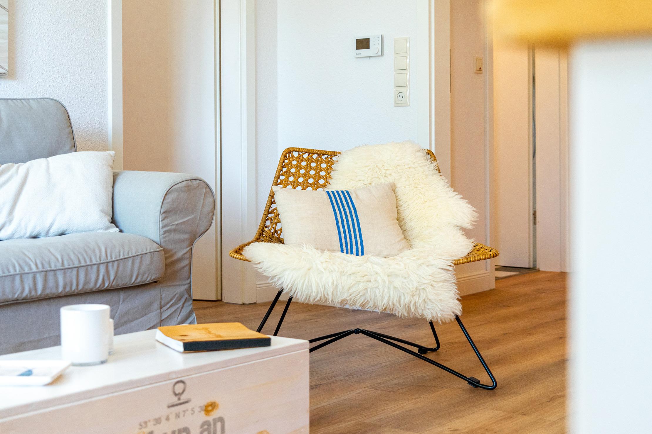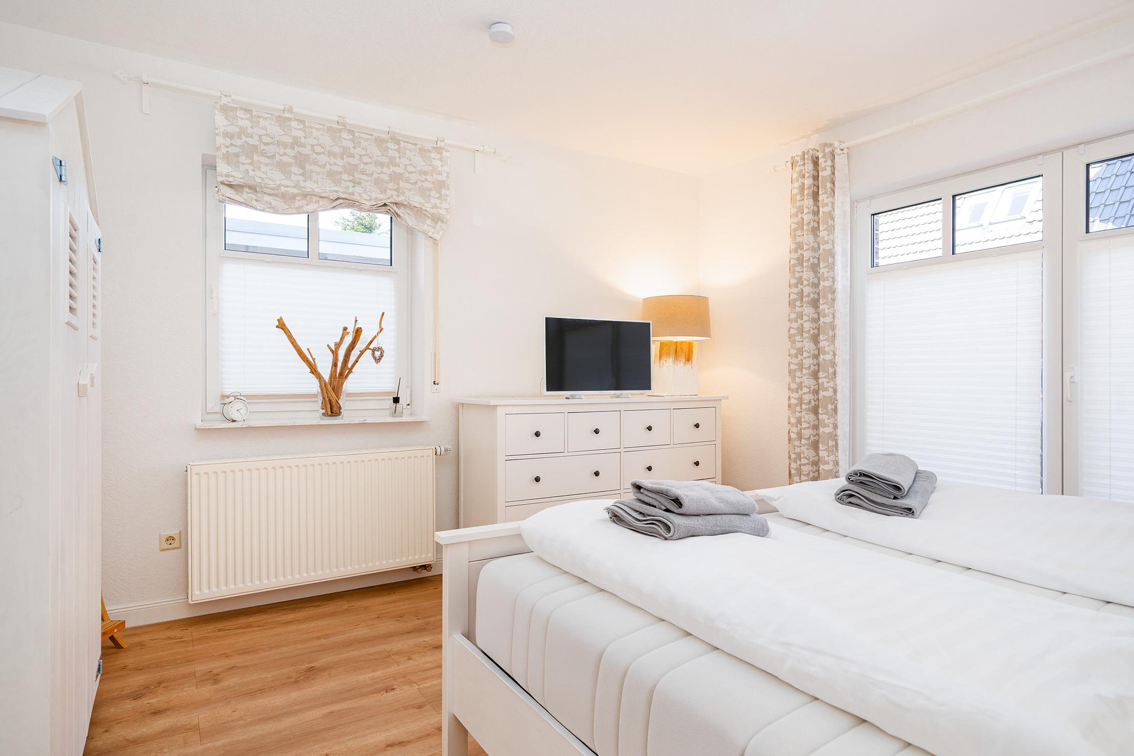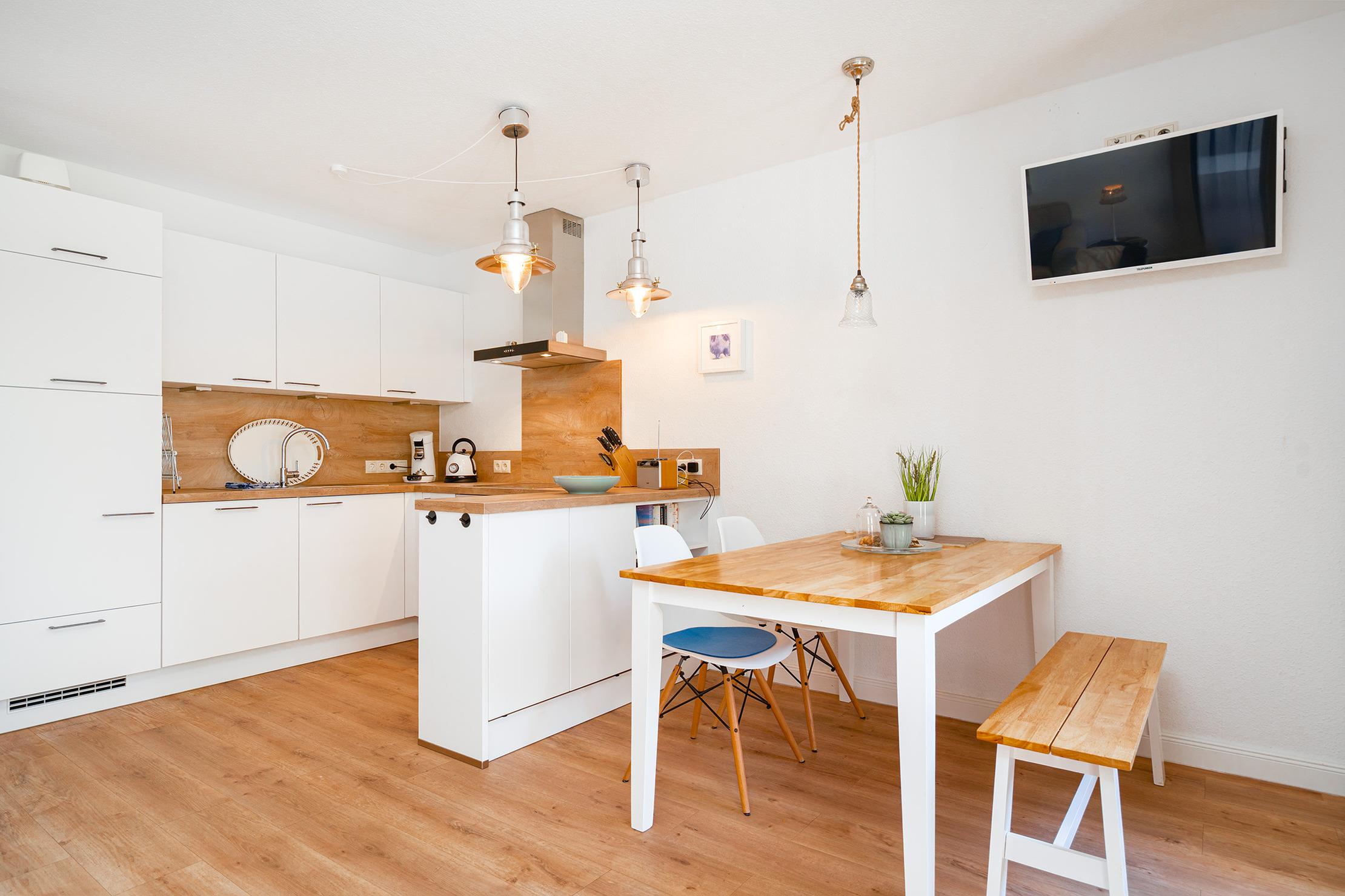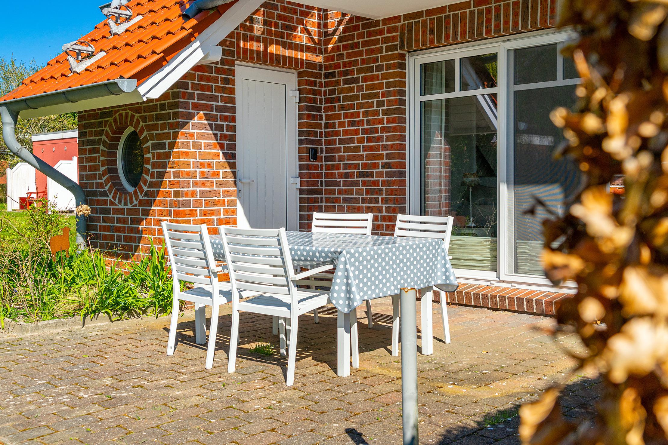 Unsere ebenerdige Ferienwohnung "of und an" wurde erst kürzlich vollständig renoviert und befindet sich in zentraler Lage direkt hinter dem Deich. Mit ihrer nordischen Einrichtung in sanften Natur- und Weißtönen schafft die Wohnung eine gemütliche Atmosphäre. Auf etwa 70qm bietet sie einen hellen und hochwertig eingerichteten Wohnbereich mit einer großen und voll ausgestatteten Küchenzeile, einen Essbereich sowie eine einladende Sofaecke für gemeinsame Abende. Neben einem Tageslichtbad mit ebenerdiger Dusche verfügt die Wohnung über zwei Schlafzimmer mit Doppelbetten. Auch ein Abstellraum steht zur Verfügung. Die großzügige Terrasse mit Garten erreichen Sie bequem durch den Wohnbereich, hier lässt sich die frische Nordseeluft bestens genießen. Am Haus steht Ihnen ein reservierter Parkplatz zur Verfügung. Besonders hervorzuheben bei dieser Wohnung ist die Kombination aus ruhiger und zentraler Lage, denn den Hafen mit seinen zahlreichen Restaurants und kleinen Geschäften erreichen Sie über den Deich in nur wenigen hundert Metern zu Fuß und dennoch bietet die Wohnung mit ihrer Außenanlage den perfekten Rückzugsort.