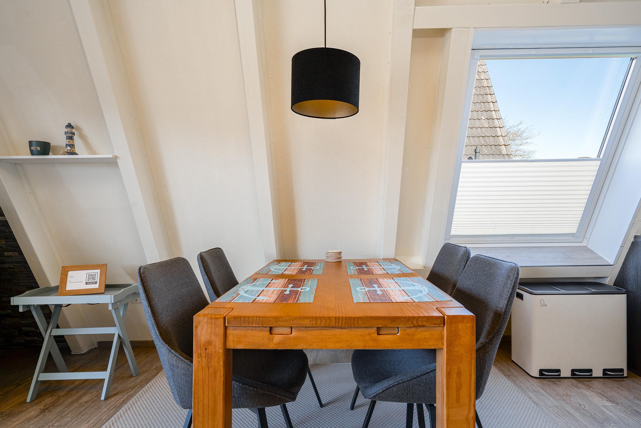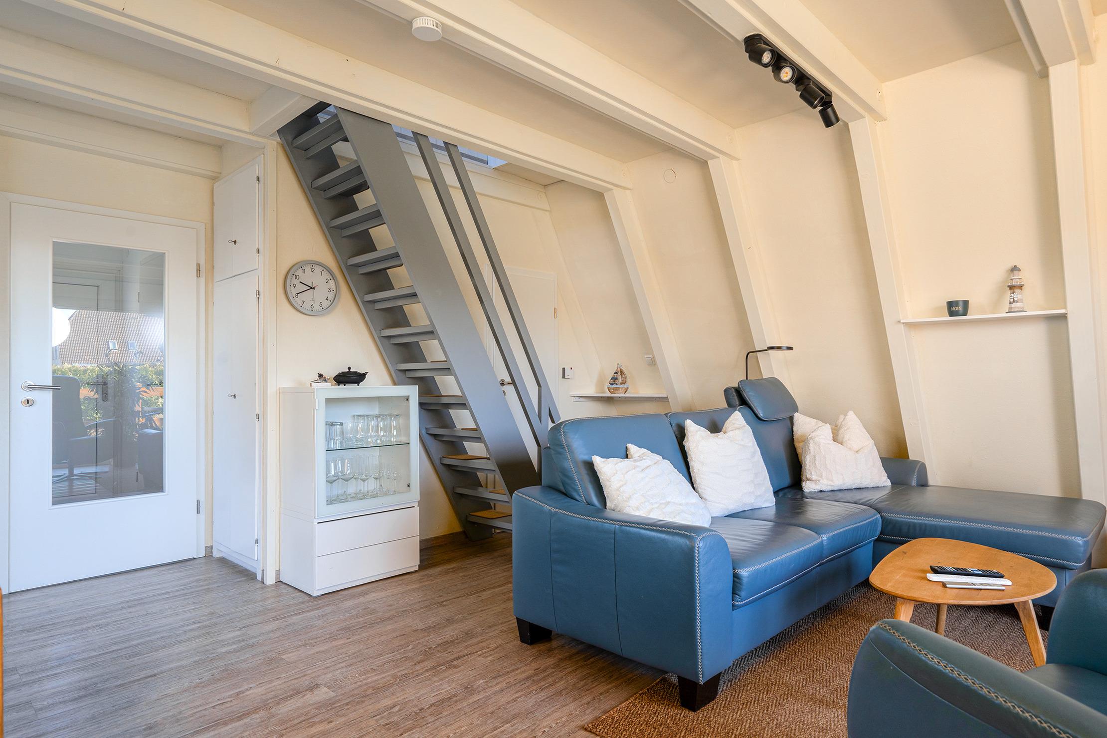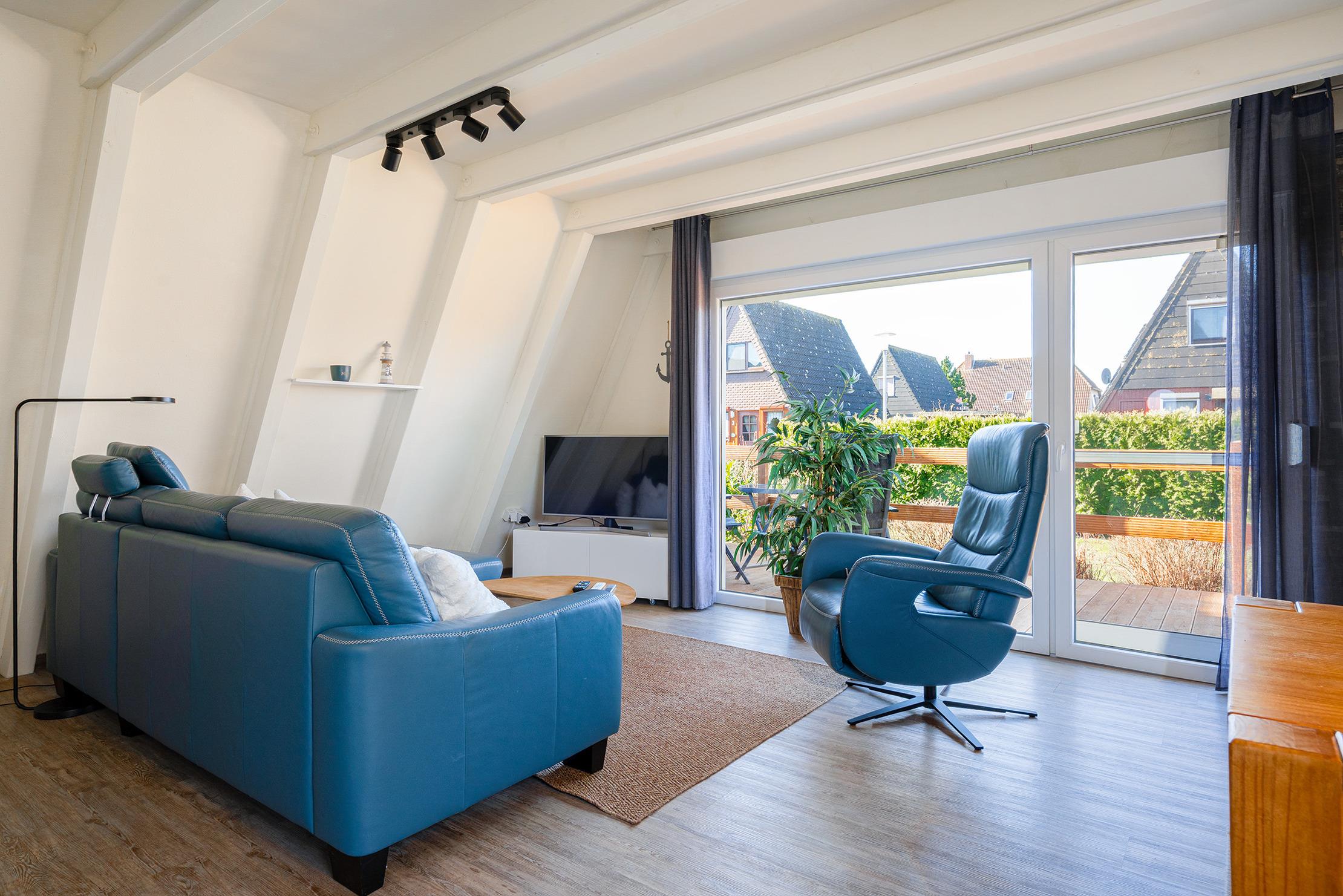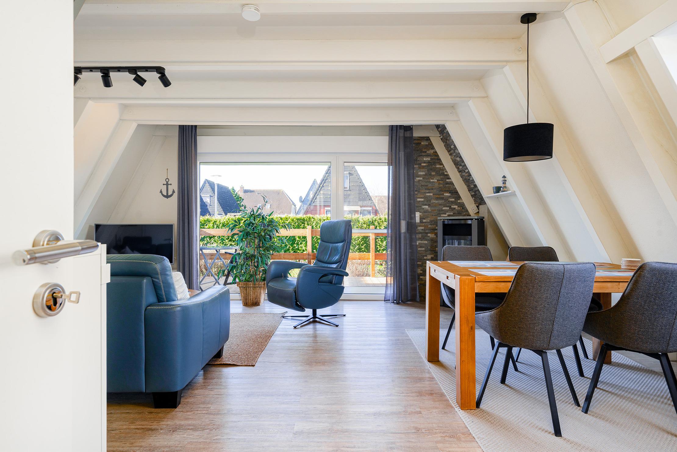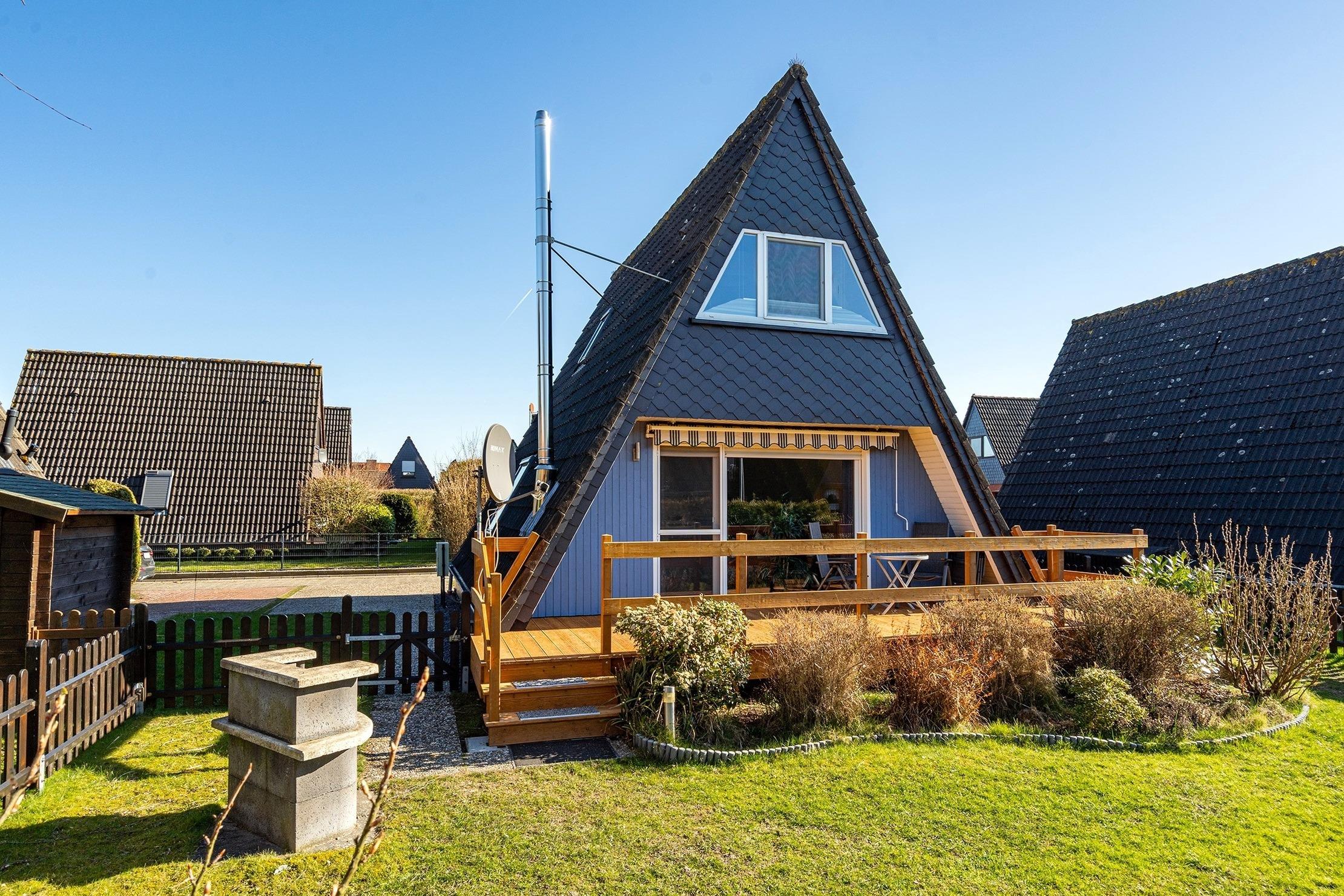 Das charmante Nurdach-Ferienhaus "Spitzhus" bietet auf 60qm eine gemütliche Unterkunft für erholsame Tage an der Nordseeküste. Das Haus besticht durch seine besondere Architektur und seinen einladenden und modernen Wohnbereich mit Sofa und Lesesessel im Erdgeschoss. Zur entspannten Atmosphäre trägt besonders der Gaskamin bei. Sie finden hier im Erdgeschoss außerdem eine voll ausgestattete Einbauküche, sowie ein helles Tageslichtbad, das alles bietet, was man für den täglichen Komfort benötigt. Im Obergeschoss befinden sich zwei Schlafzimmer, eines mit Doppelbett und eines mit zwei Einzelbetten, die ausreichend Platz für bis zu vier Personen bieten. Ein weiteres Highlight dieses Ferienhauses ist der große eingezäunte Garten mit Holzterrasse und Markise, in dem Sie die norddeutsche Luft in vollen Zügen genießen können. Ein reservierter Parkplatz gehört selbstverständlich auch zur Ausstattung des Hauses, ebenso eine Ladesäule für E-Autos.