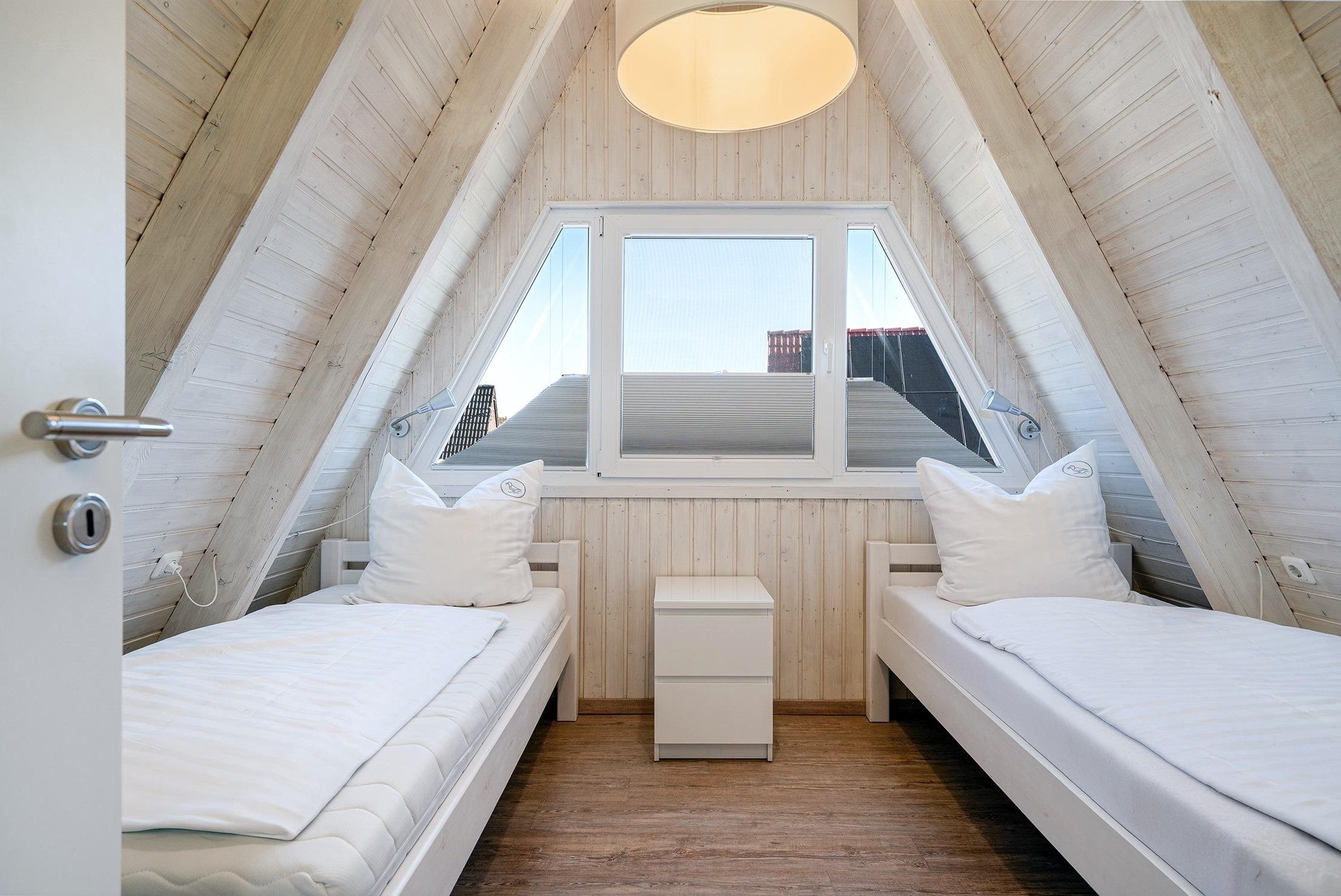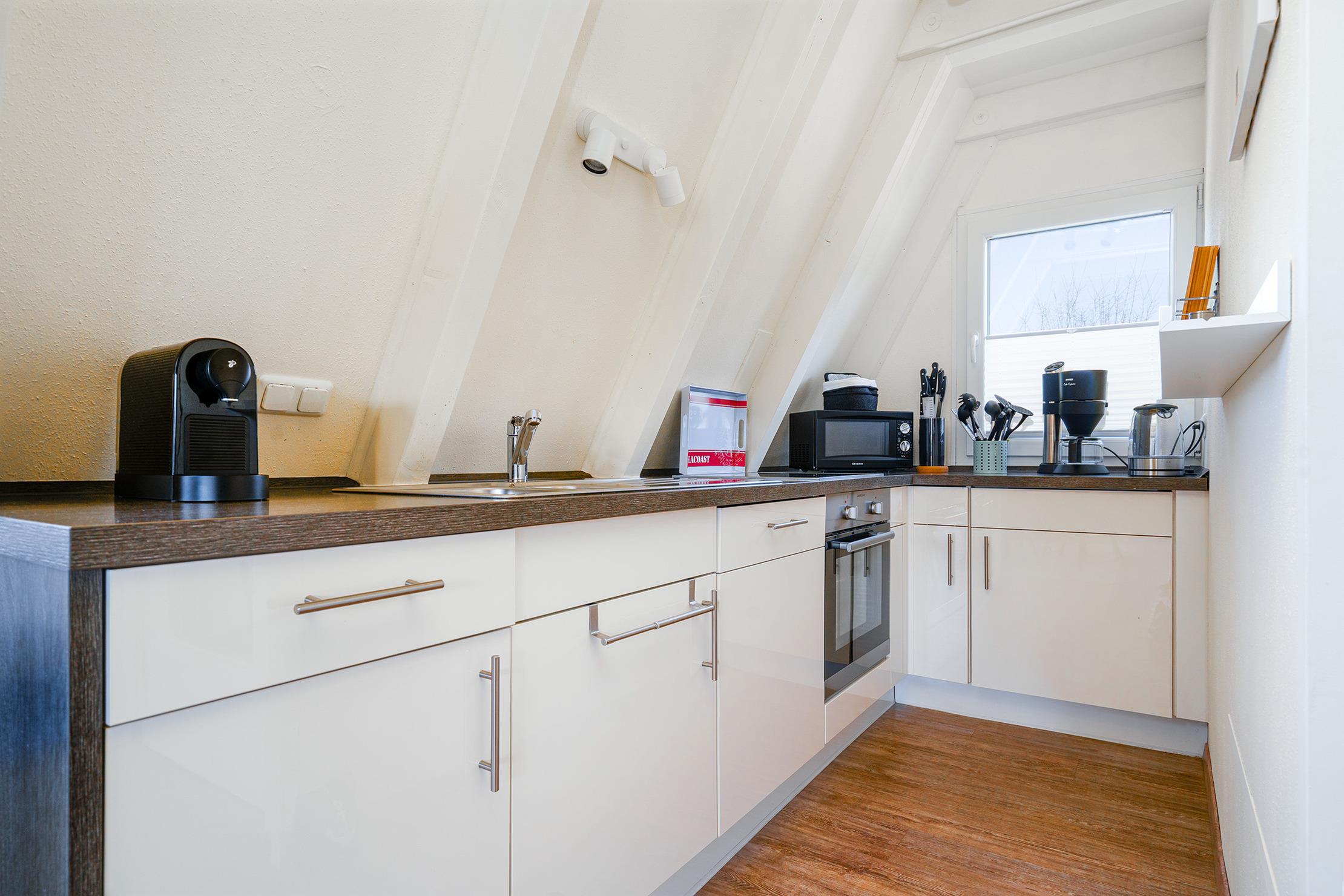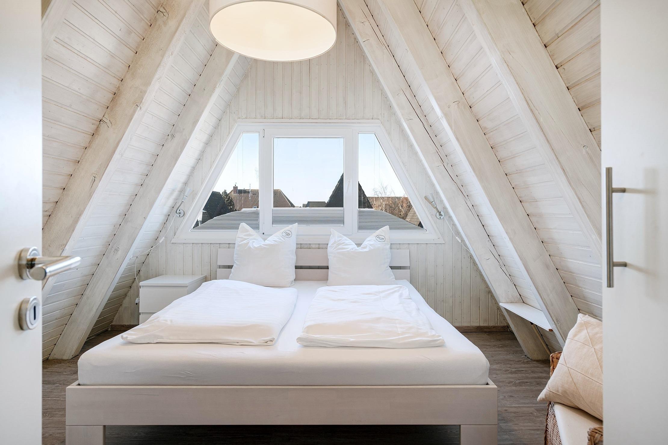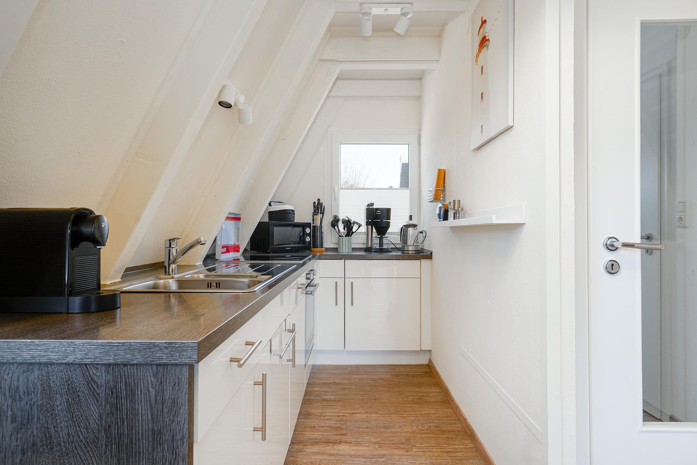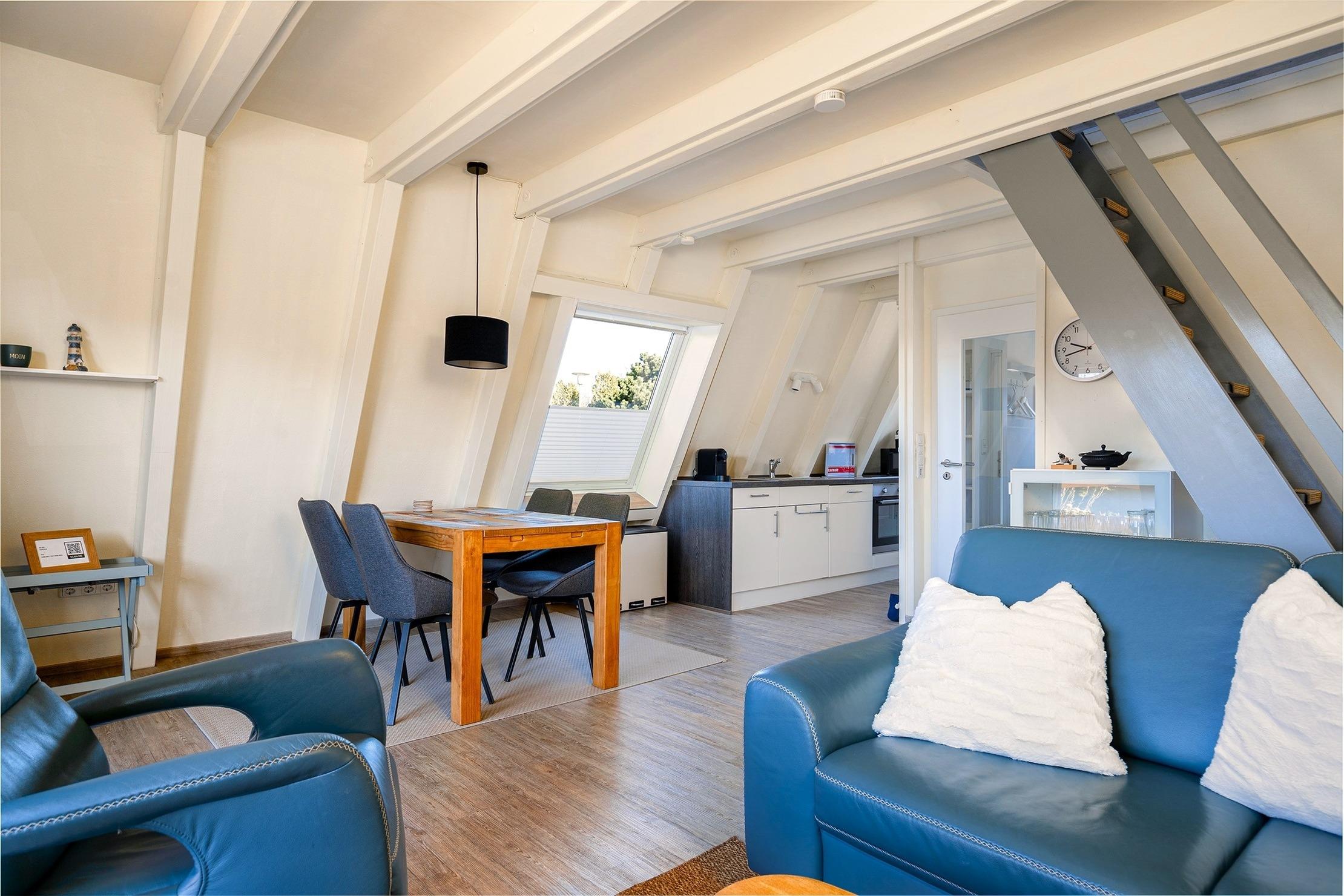 Das charmante Nurdach-Ferienhaus "Spitzhus" bietet auf 60qm eine gemütliche Unterkunft für erholsame Tage an der Nordseeküste. Das Haus besticht durch seine besondere Architektur und seinen einladenden und modernen Wohnbereich mit Sofa und Lesesessel im Erdgeschoss. Zur entspannten Atmosphäre trägt besonders der Gaskamin bei. Sie finden hier im Erdgeschoss außerdem eine voll ausgestattete Einbauküche, sowie ein helles Tageslichtbad, das alles bietet, was man für den täglichen Komfort benötigt. Im Obergeschoss befinden sich zwei Schlafzimmer, eines mit Doppelbett und eines mit zwei Einzelbetten, die ausreichend Platz für bis zu vier Personen bieten. Ein weiteres Highlight dieses Ferienhauses ist der große eingezäunte Garten mit Holzterrasse und Markise, in dem Sie die norddeutsche Luft in vollen Zügen genießen können. Ein reservierter Parkplatz gehört selbstverständlich auch zur Ausstattung des Hauses, ebenso eine Ladesäule für E-Autos.