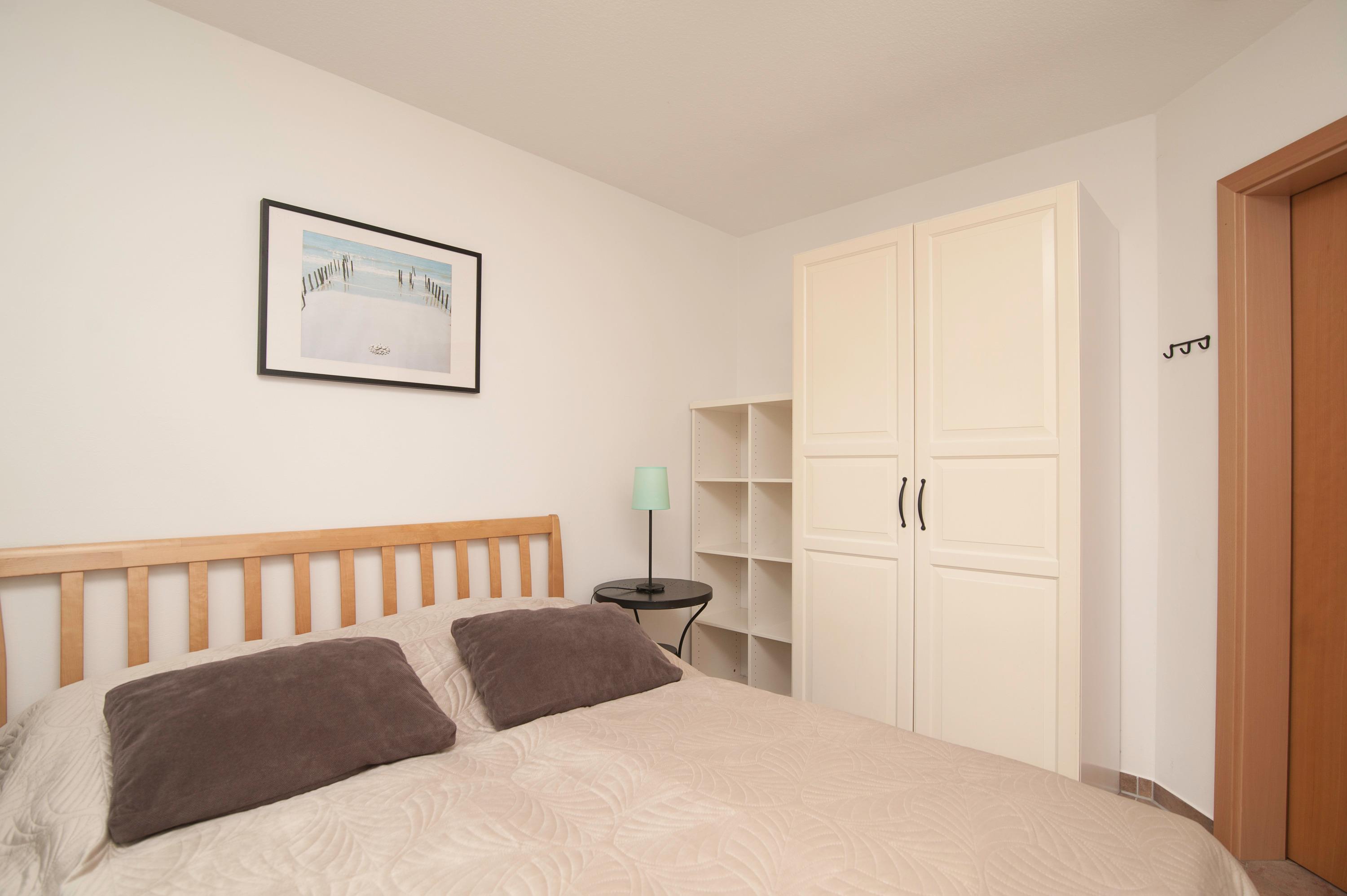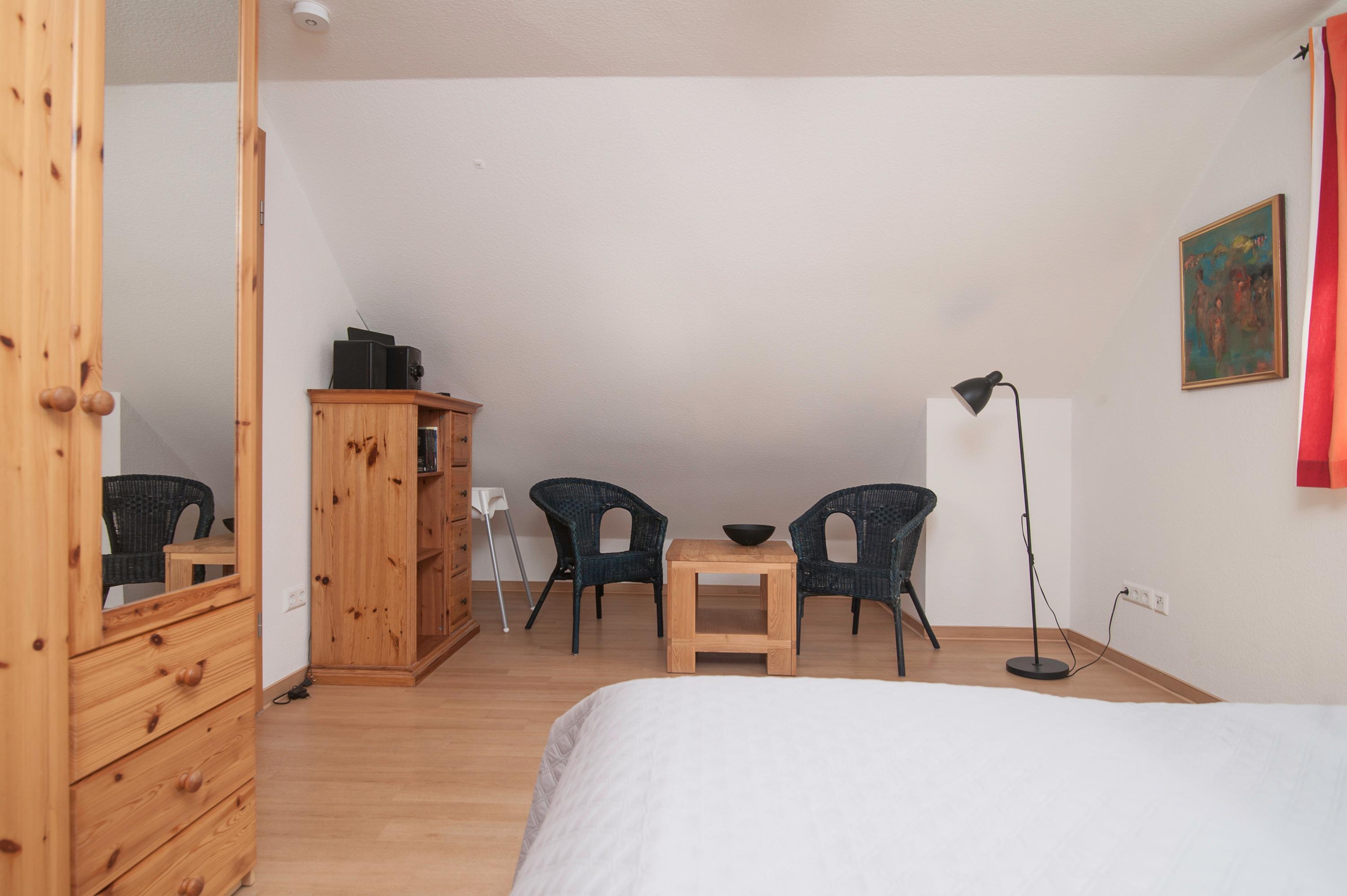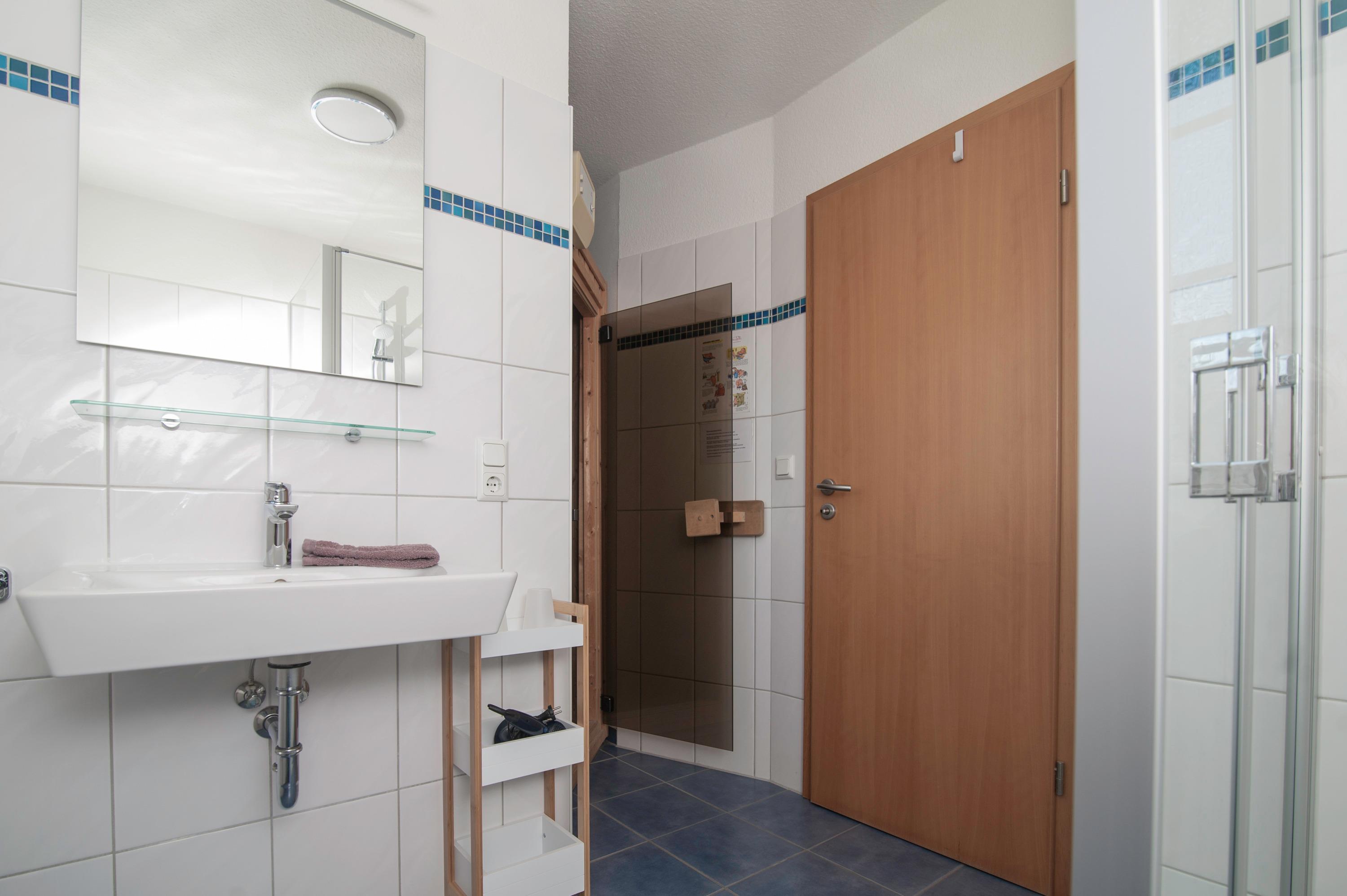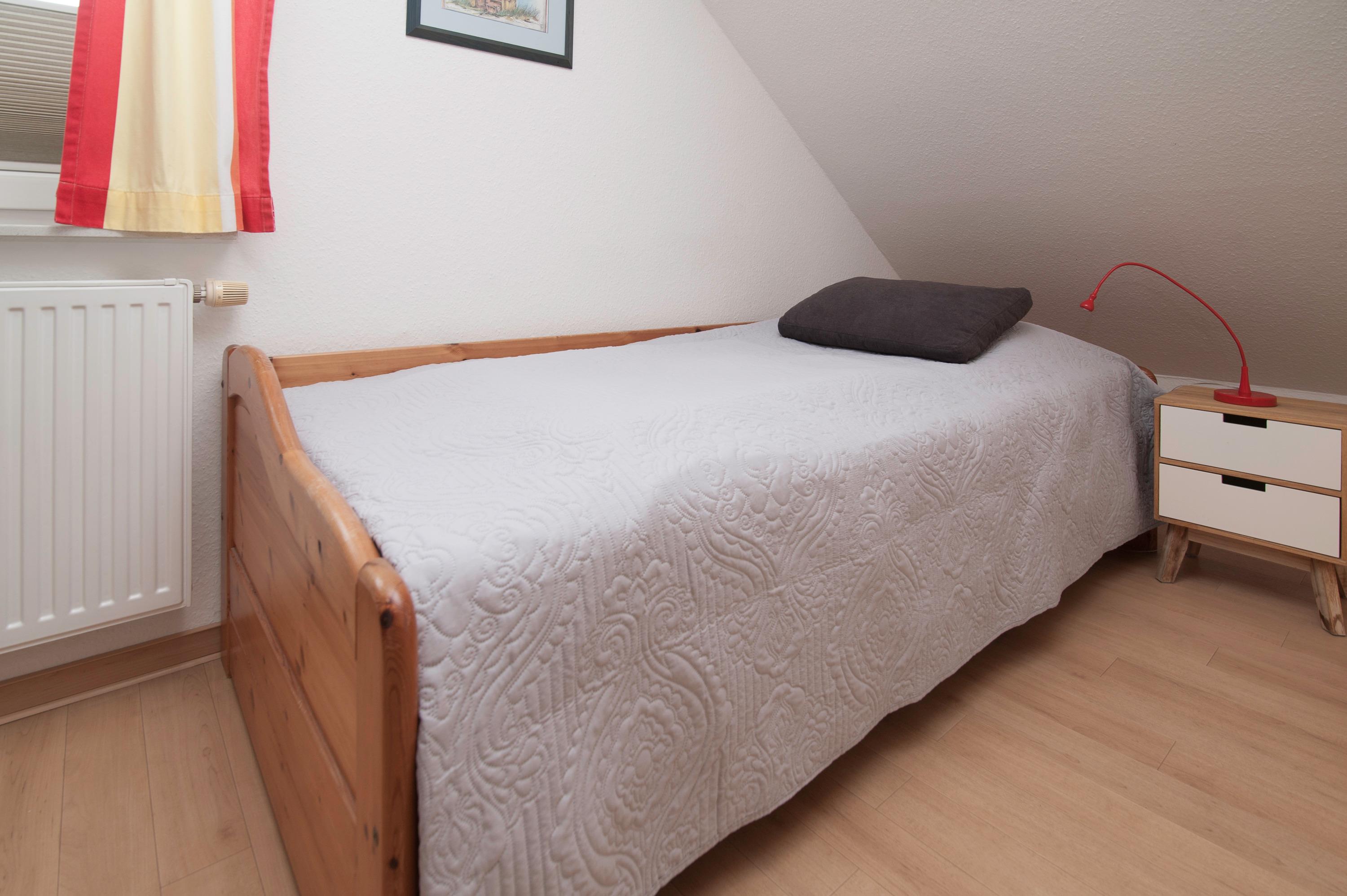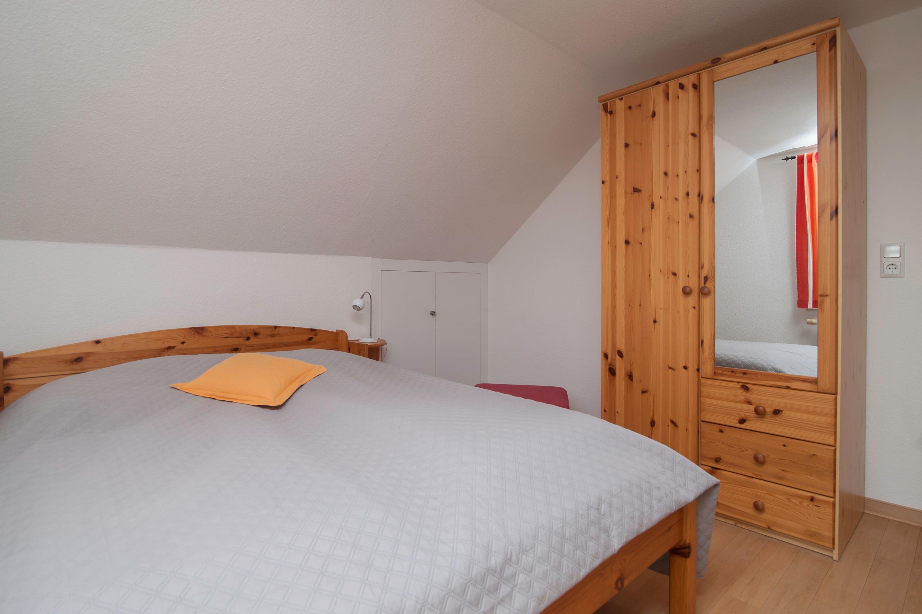 Ein zusätzliches Bad im Obergeschoß mit Dusche, WC, Waschbecken, Ein Schlafzimmer im Obergeschoß (Deichblick), Ein zweites Schlafzimmer im Obergeschoß, beide mit Plissee und Vorhang, mit einem Doppelbett und 2 x 80 x 200cm, mit zwei Einzelbetten 90 x 200cm