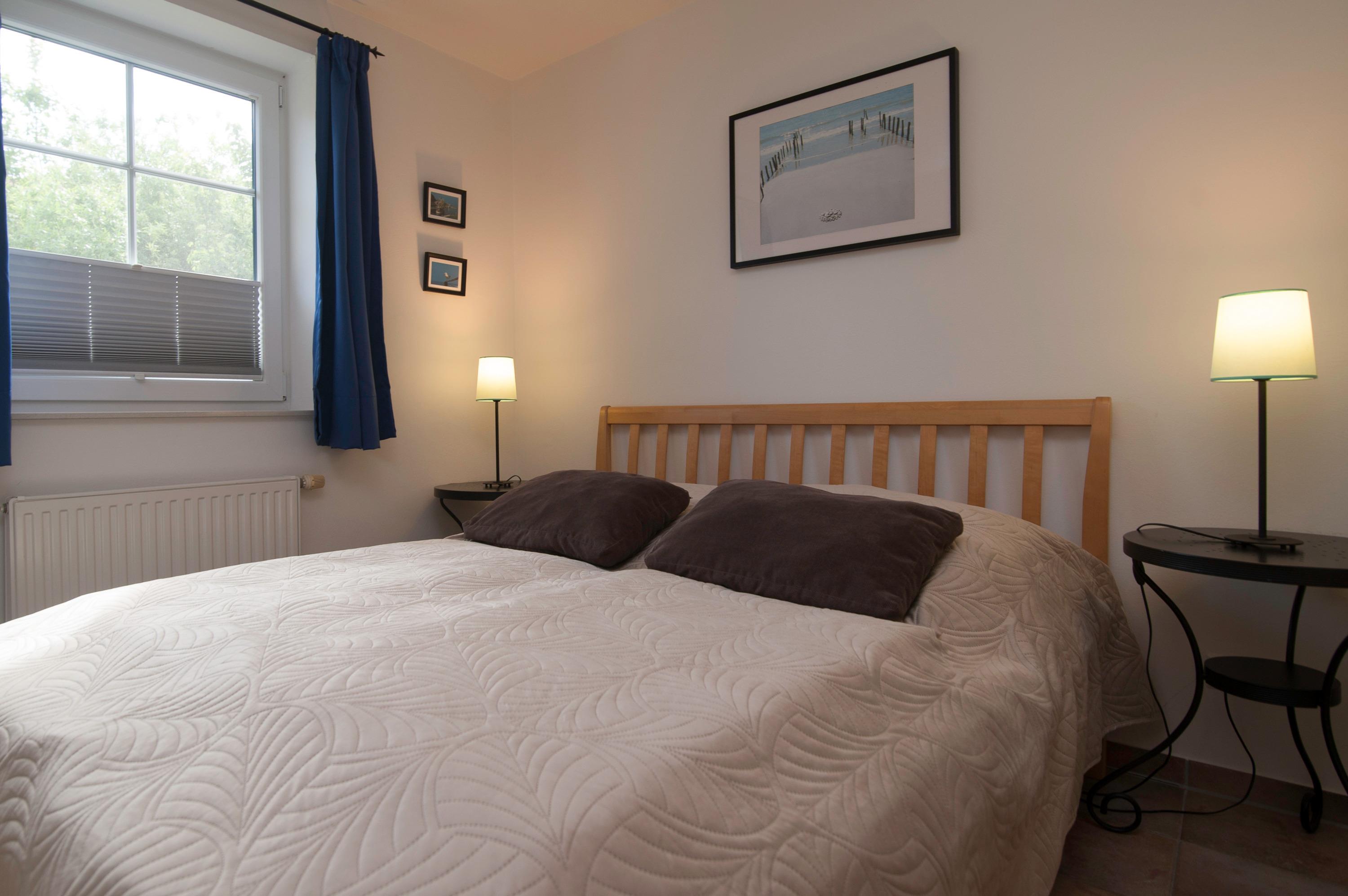 Schlafzimmer im Erdgeschoß mit einem Doppelbett und 2 x 80 x 200cm, Verdunkelung durch Plissee und Vorhang, Bad im Erdgeschoß mit Dusche, WC, Sauna, Waschbecken.