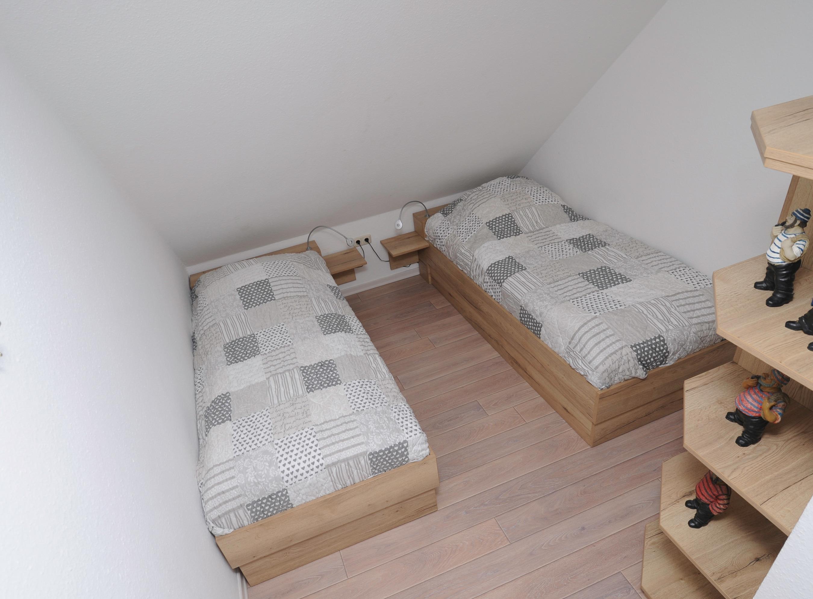 1 Schlafraum mit zwei Einzelbetten (90 x 200cm) mit verstellbaren Lattenrosten, Verdunkelung durch Plissees