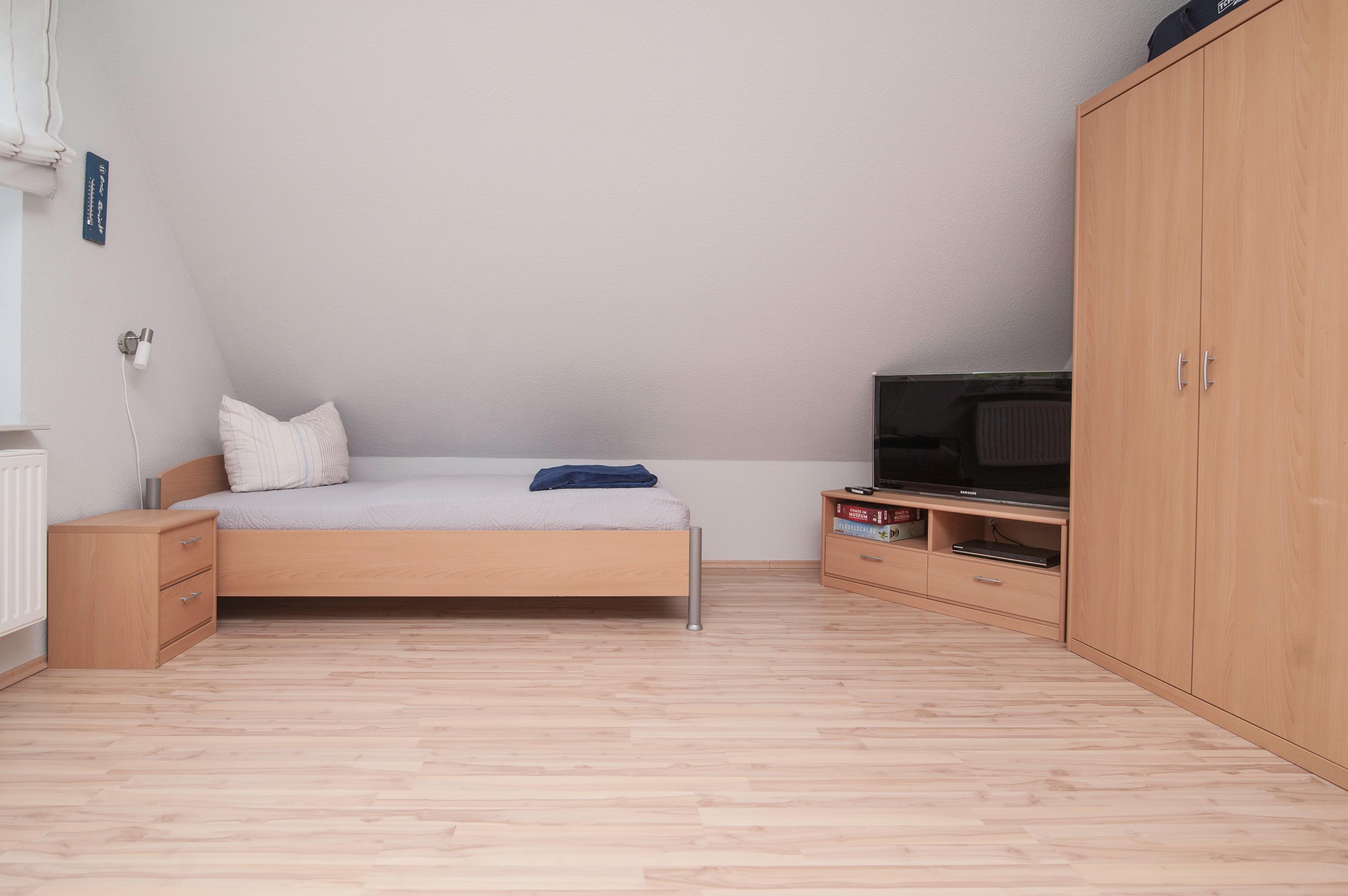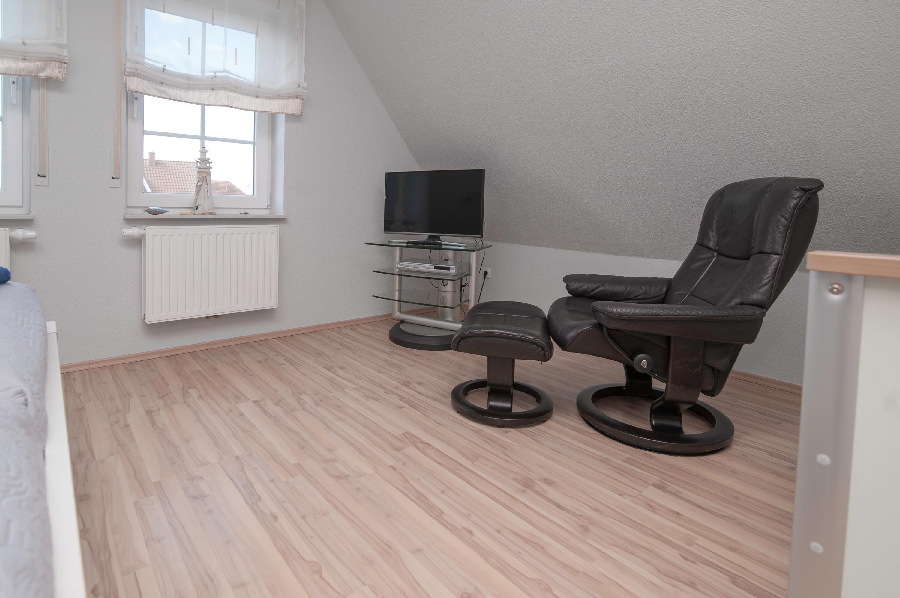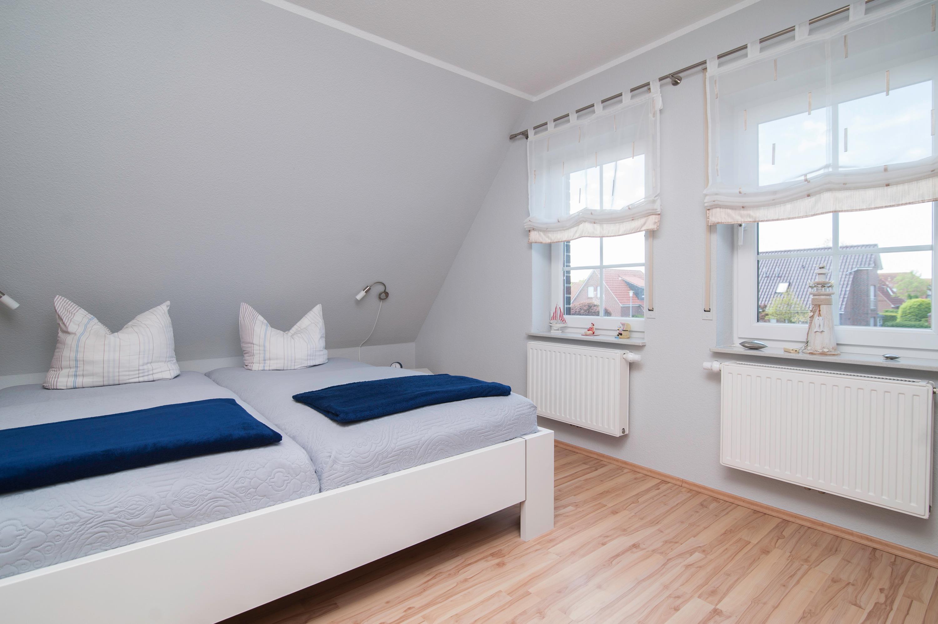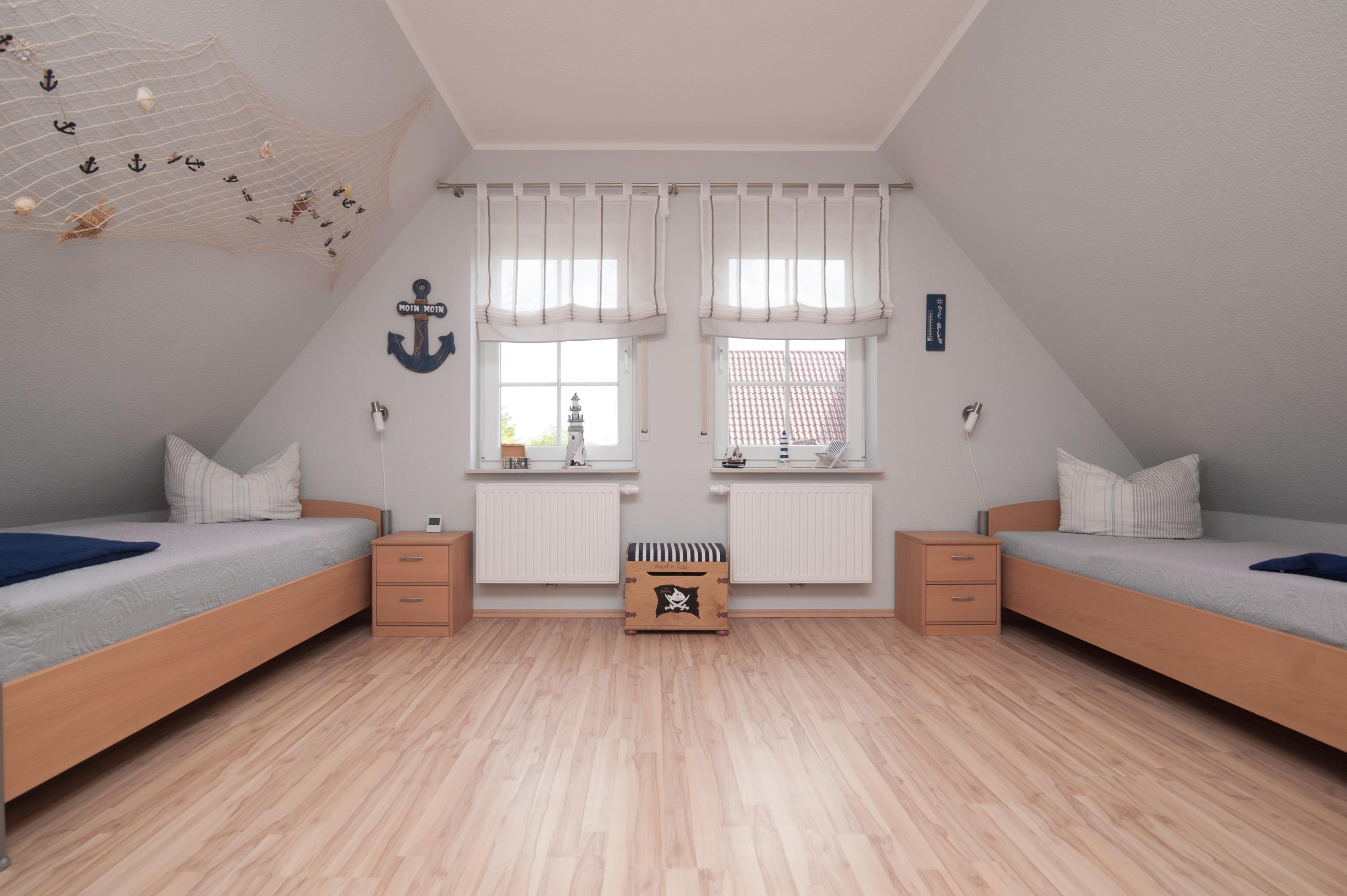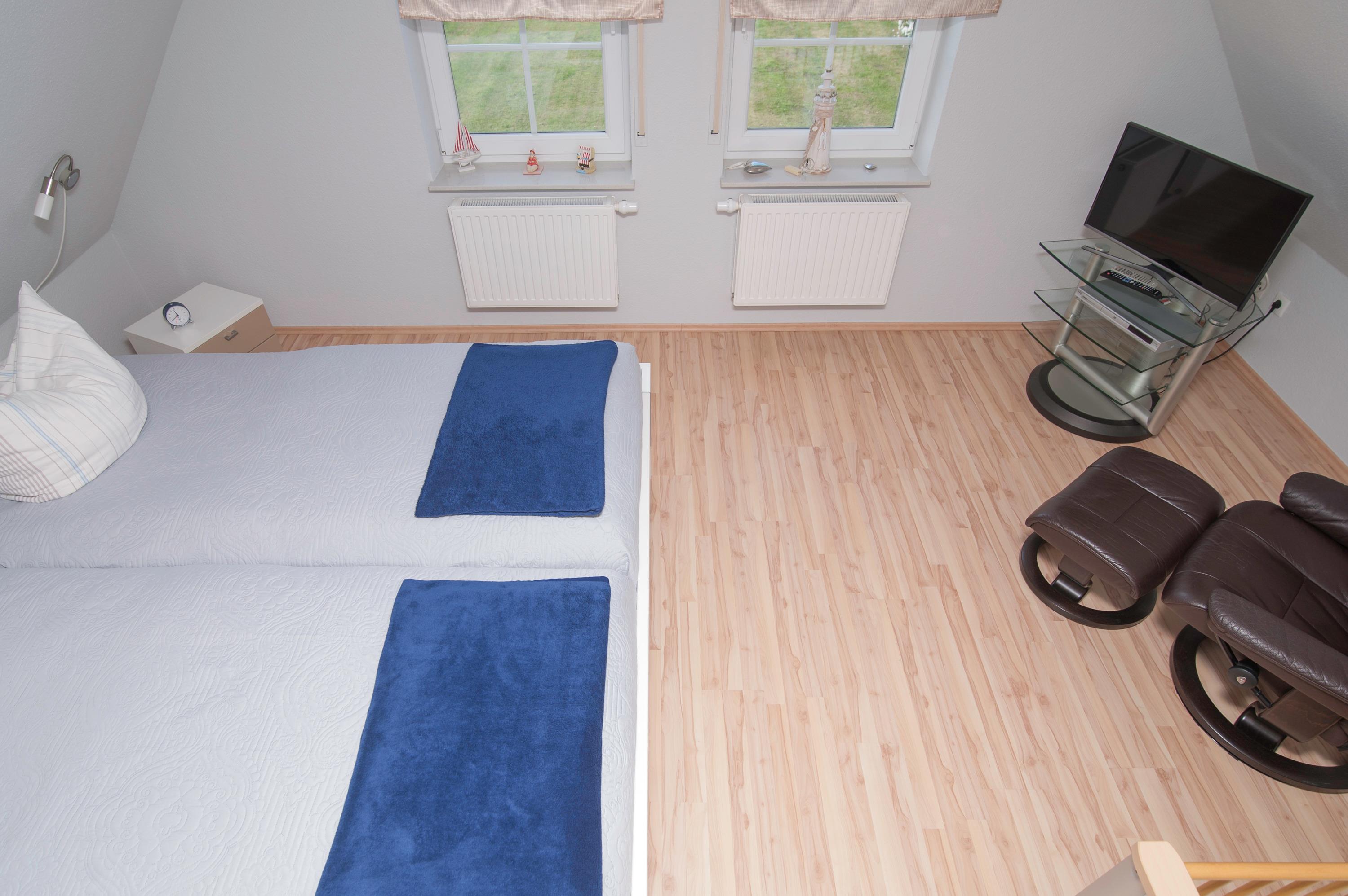 Das Haus hat 3 Schlafräume, ein Schlafraum im Erdgeschoss mit Doppelbett (2 x 90 x 200cm), nebenan befindet sich das Bad mit Dusche (niedriger Einstieg), Waschtisch, Föhn und WC. Ein zweiter Schlafraum im Obergeschoss (Deichblick) mit einem Doppelbett (2 x 100 x 200cm) und stabilem Kinderbett, ein 32"Samsung Full-HD LCD-TV und einen Stressless Lesesessel komplettieren die Ausstattung. Ein Kinderhochstuhl ist vorhanden. Ein dritter Schlafraum oben mit 2 Einzelbetten (90 x 200cm), Kinderschreibtisch mit Stuhl, Spielzeugtruhe und für "Schlechtwettertage" gibt es auch dort einen 37"Samsung Full-HD LCD-TV mit DVD-Player, Kinderfilme, Bücher und Spiele. Alle Betten im Haus verfügen über verstellbare Lattenroste. Im Obergeschoss befindet sich ein zweites Bad mit Dusche, Waschtisch, Föhn und einem zweiten WC.