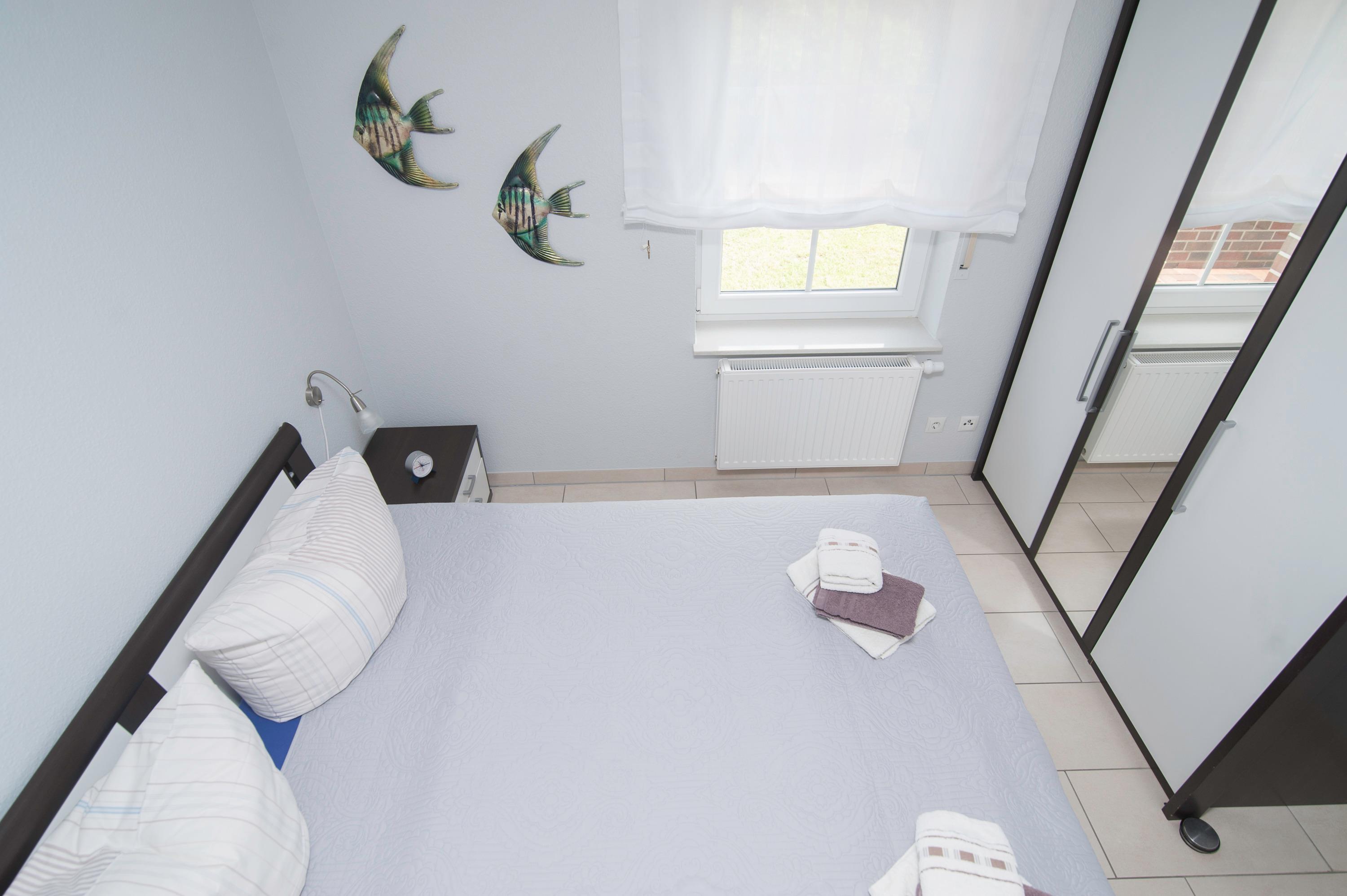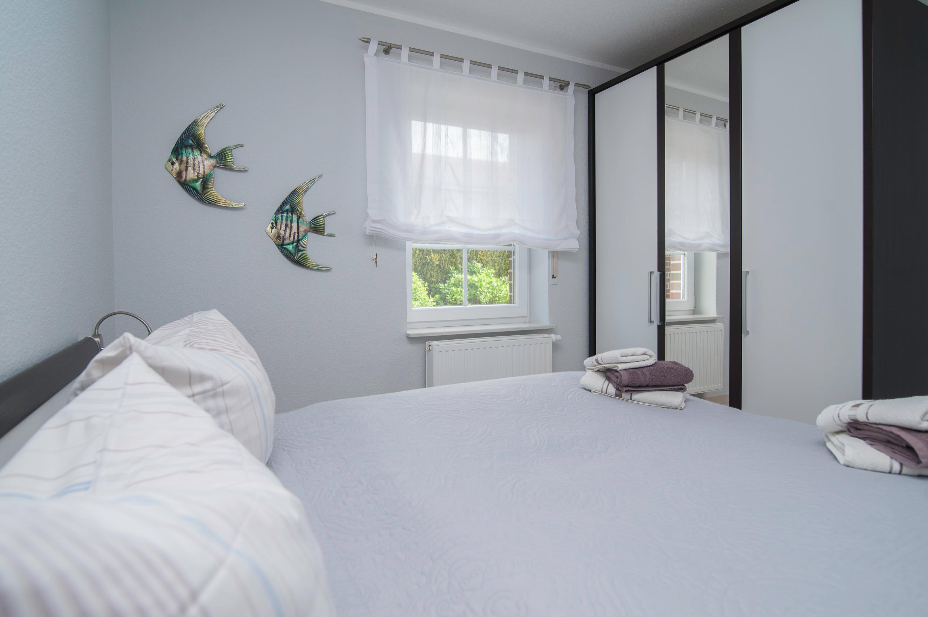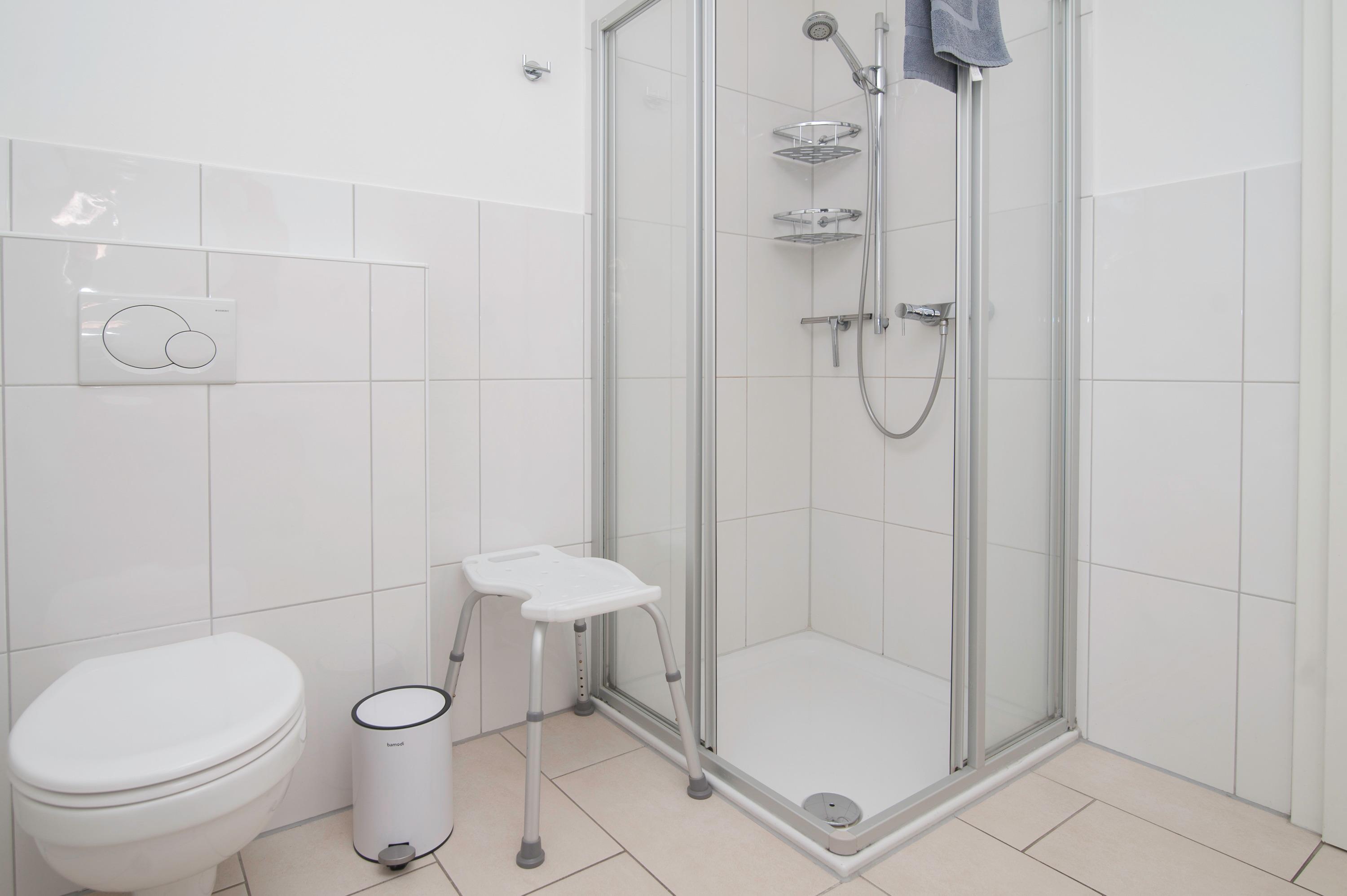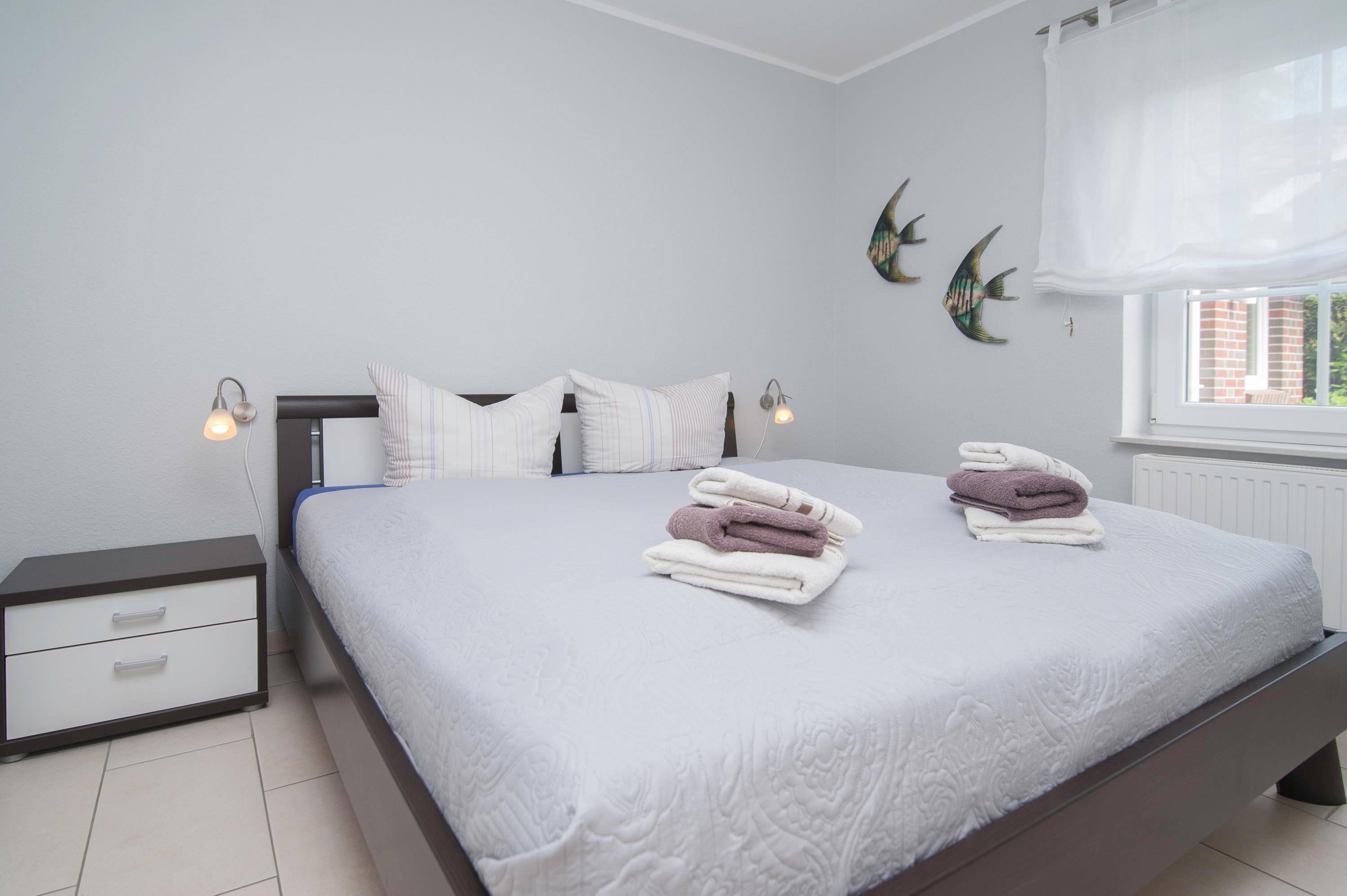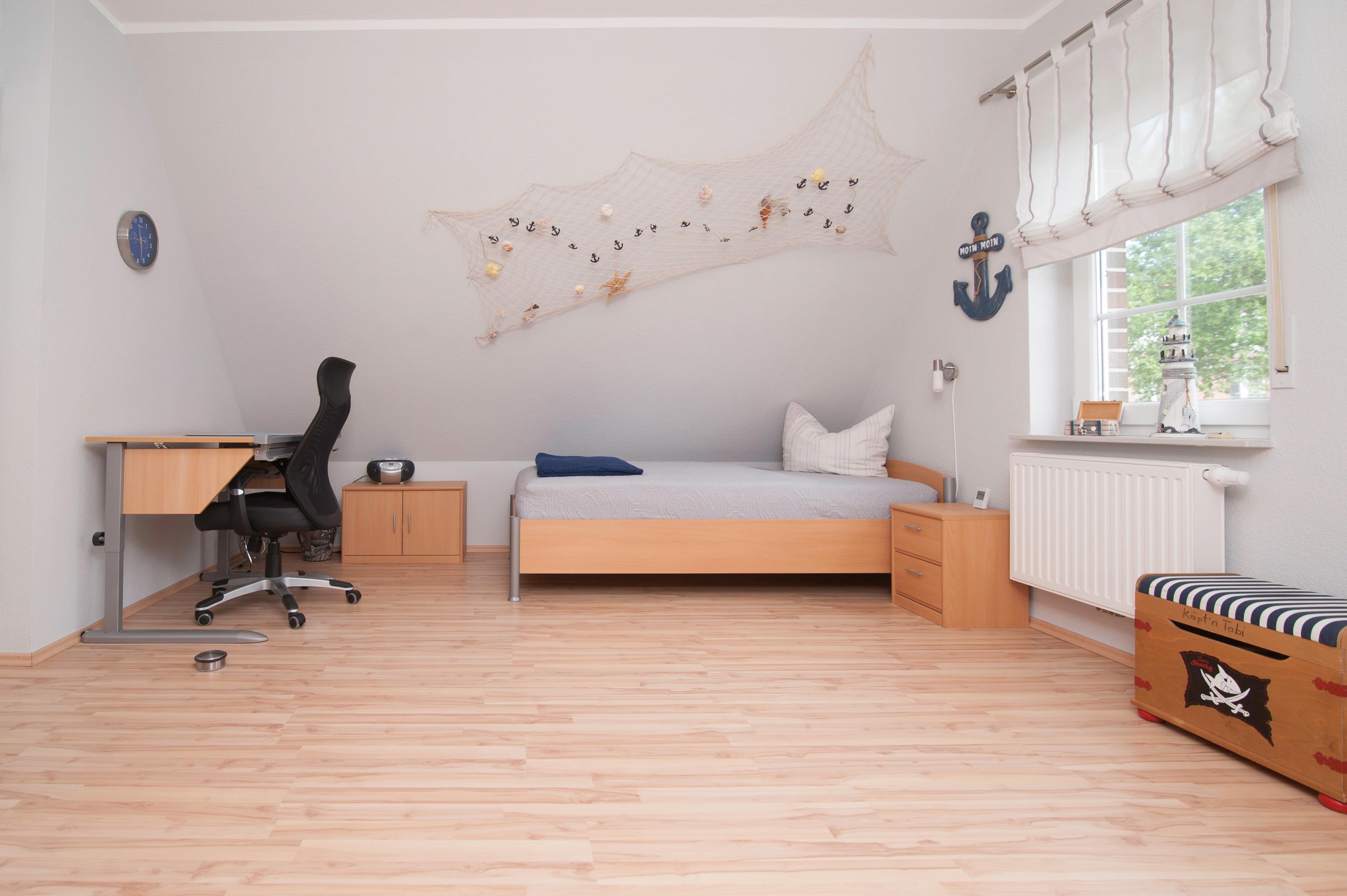 Das Haus hat 3 Schlafräume, ein Schlafraum im Erdgeschoss mit Doppelbett (2 x 90 x 200cm), nebenan befindet sich das Bad mit Dusche (niedriger Einstieg), Waschtisch, Föhn und WC. Ein zweiter Schlafraum im Obergeschoss (Deichblick) mit einem Doppelbett (2 x 100 x 200cm) und stabilem Kinderbett, ein 32"Samsung Full-HD LCD-TV und einen Stressless Lesesessel komplettieren die Ausstattung. Ein Kinderhochstuhl ist vorhanden. Ein dritter Schlafraum oben mit 2 Einzelbetten (90 x 200cm), Kinderschreibtisch mit Stuhl, Spielzeugtruhe und für "Schlechtwettertage" gibt es auch dort einen 37"Samsung Full-HD LCD-TV mit DVD-Player, Kinderfilme, Bücher und Spiele. Alle Betten im Haus verfügen über verstellbare Lattenroste. Im Obergeschoss befindet sich ein zweites Bad mit Dusche, Waschtisch, Föhn und einem zweiten WC.