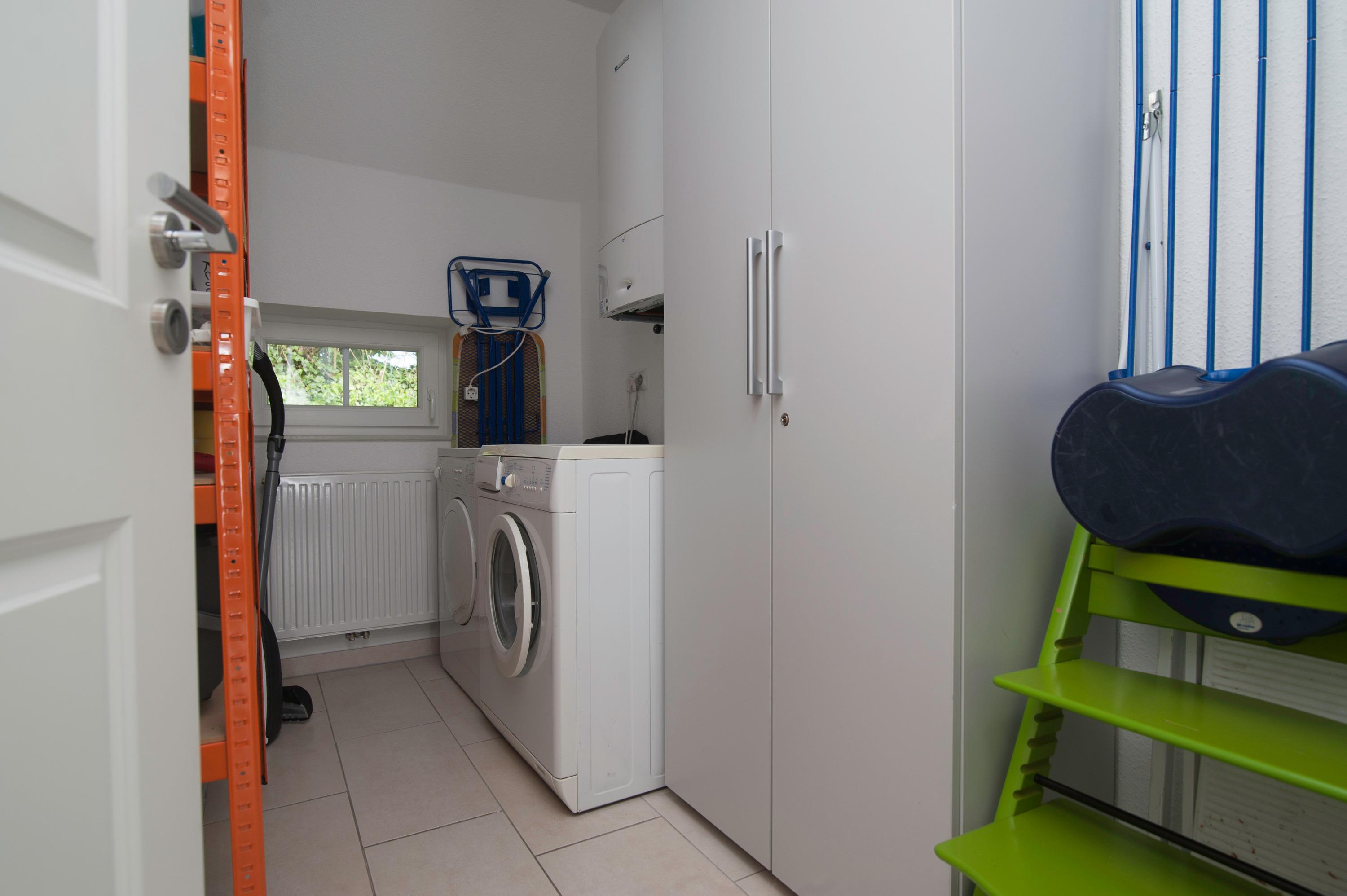 Waschmaschine (5kg) und Ablufttrockner, Wäscheständer, Bügelbrett und Bügeleisen im Abstellraum. Es gibt ein Gerätehaus mit Stromanschluss zum Abstellen von Fahrrädern.
