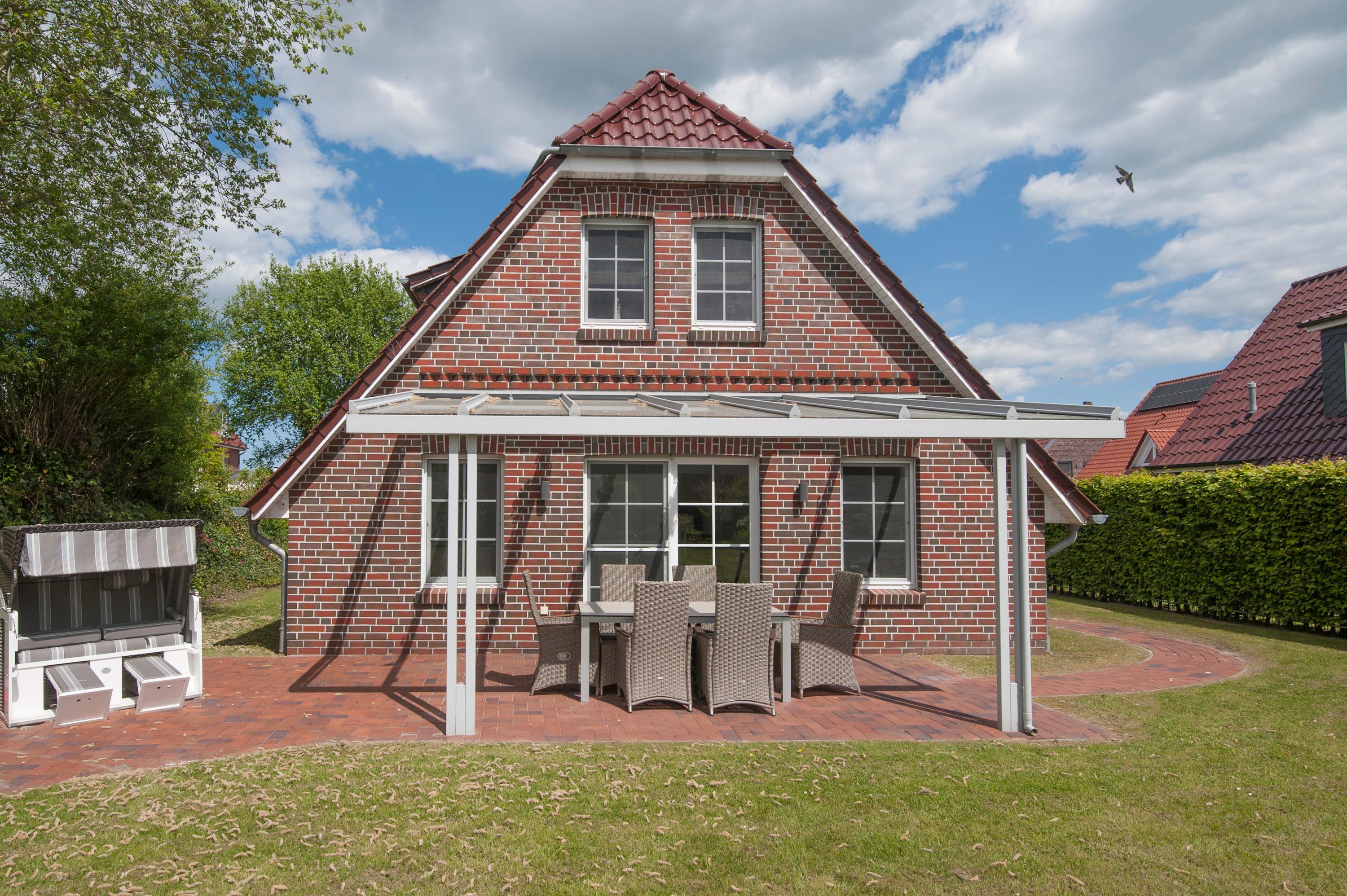 Eine sonnige überdachte Terrasse mit Gartenmöbeln und ein großer Garten stehen zur Verfügung.