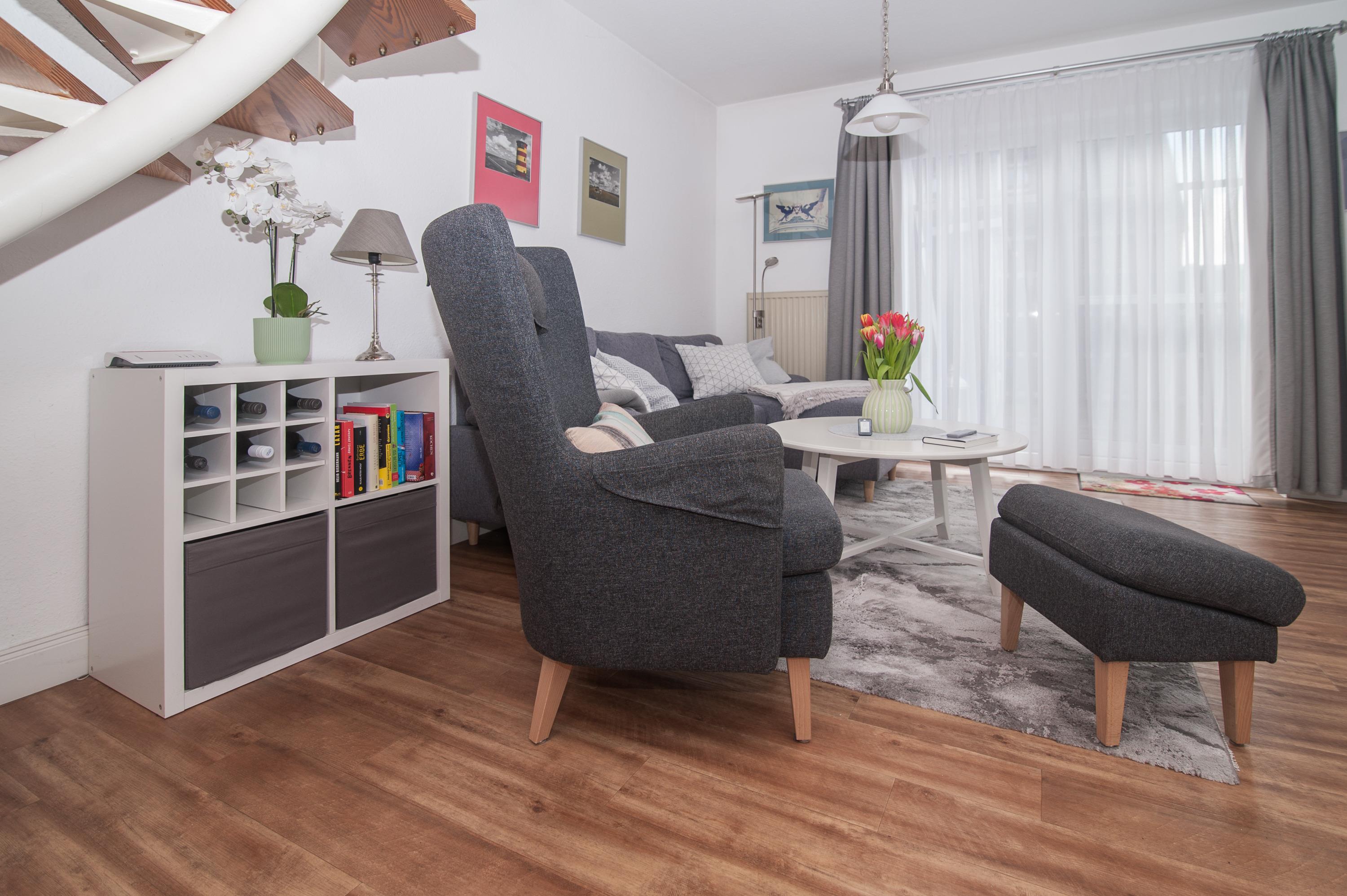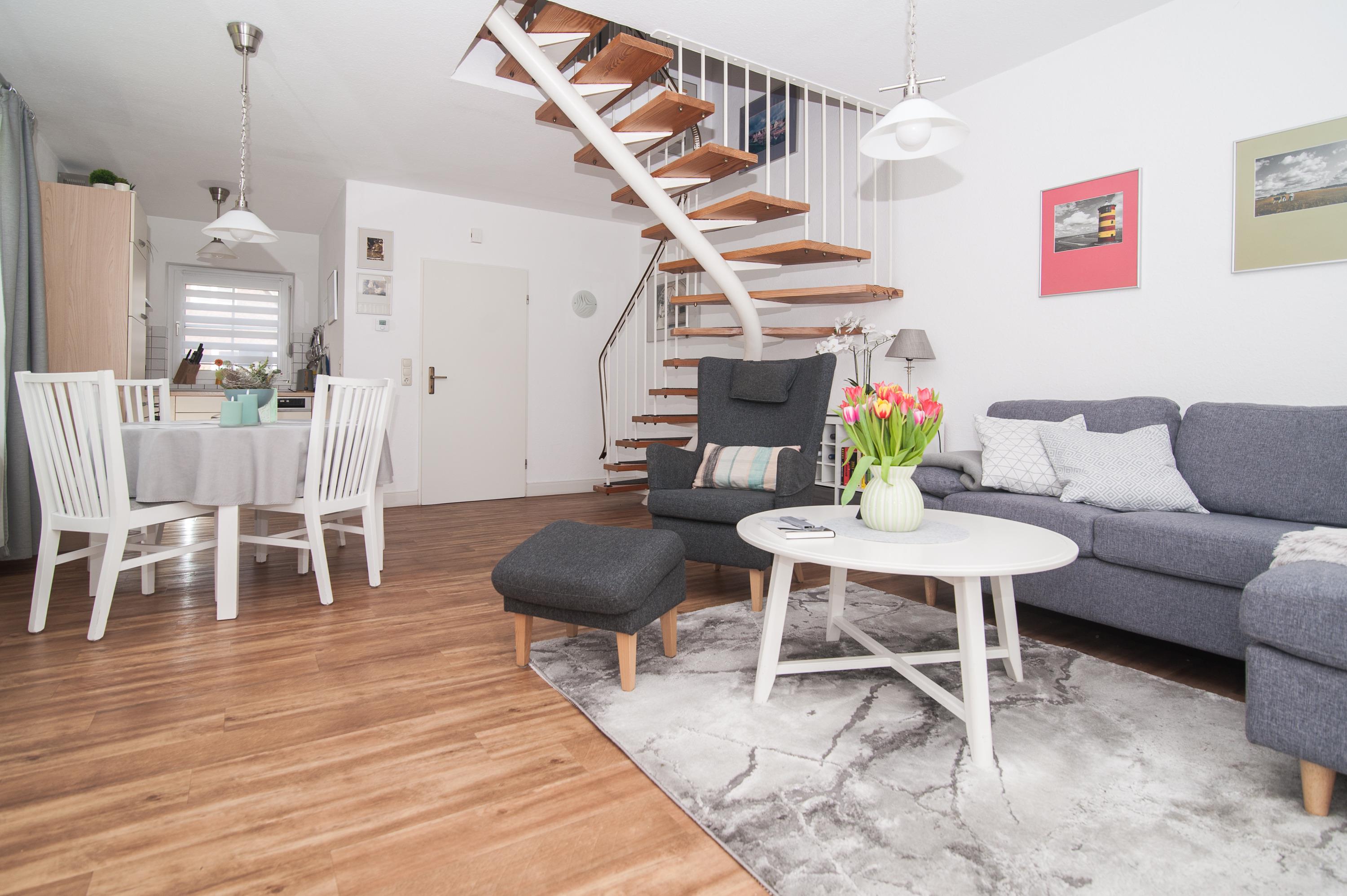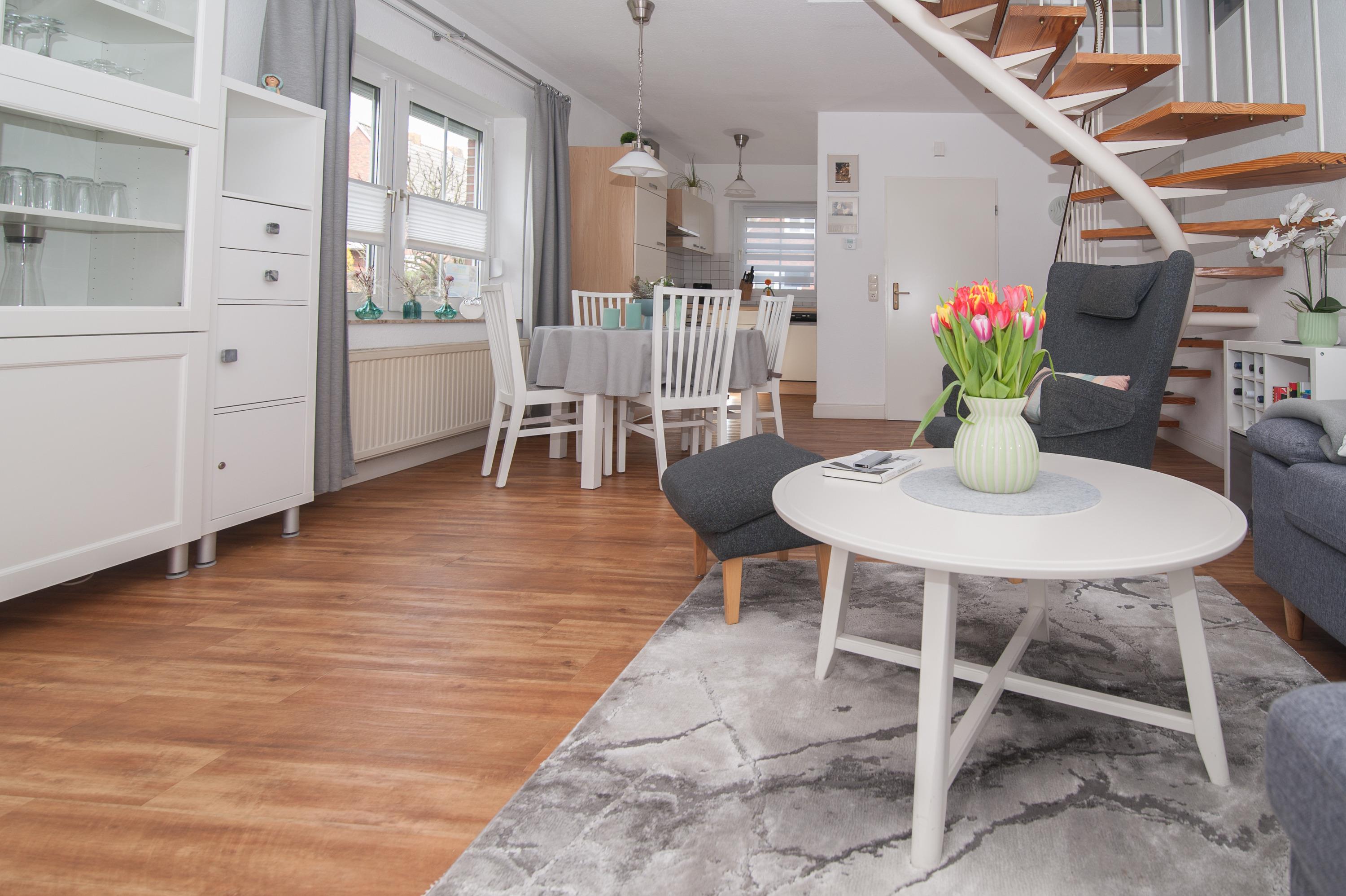Schöner Wohnraum mit 40"Panasonic Full HD LED-SmartTV, Sitzgruppe, Stereoanlage, Videorecorder, CD-Player gemütlicher Essplatz für 4 Personen, ein DSL WLAN-Gastzugang ist vorhanden, für Lesefreunde sind zahlreiche Bücher im Haus.