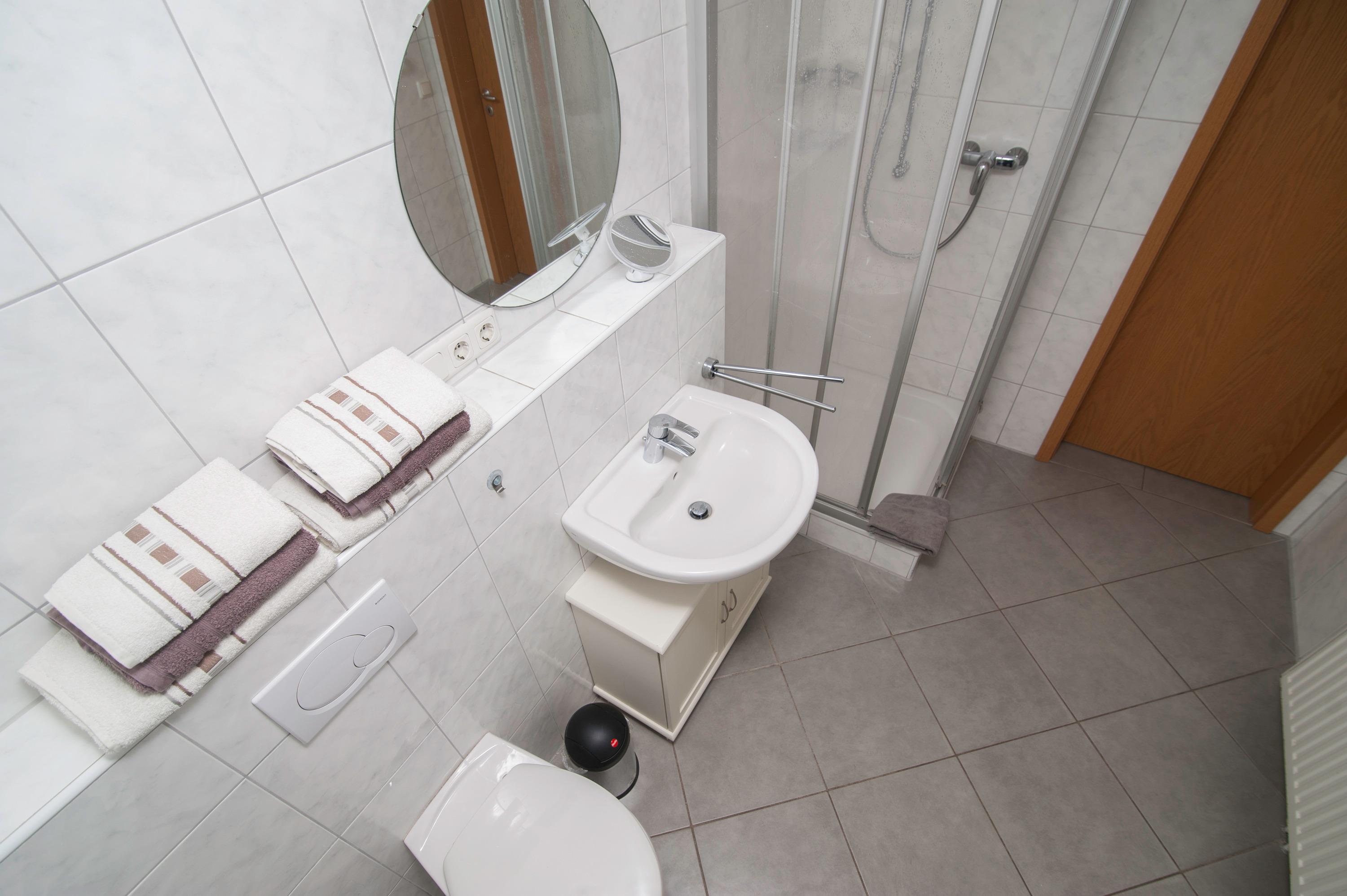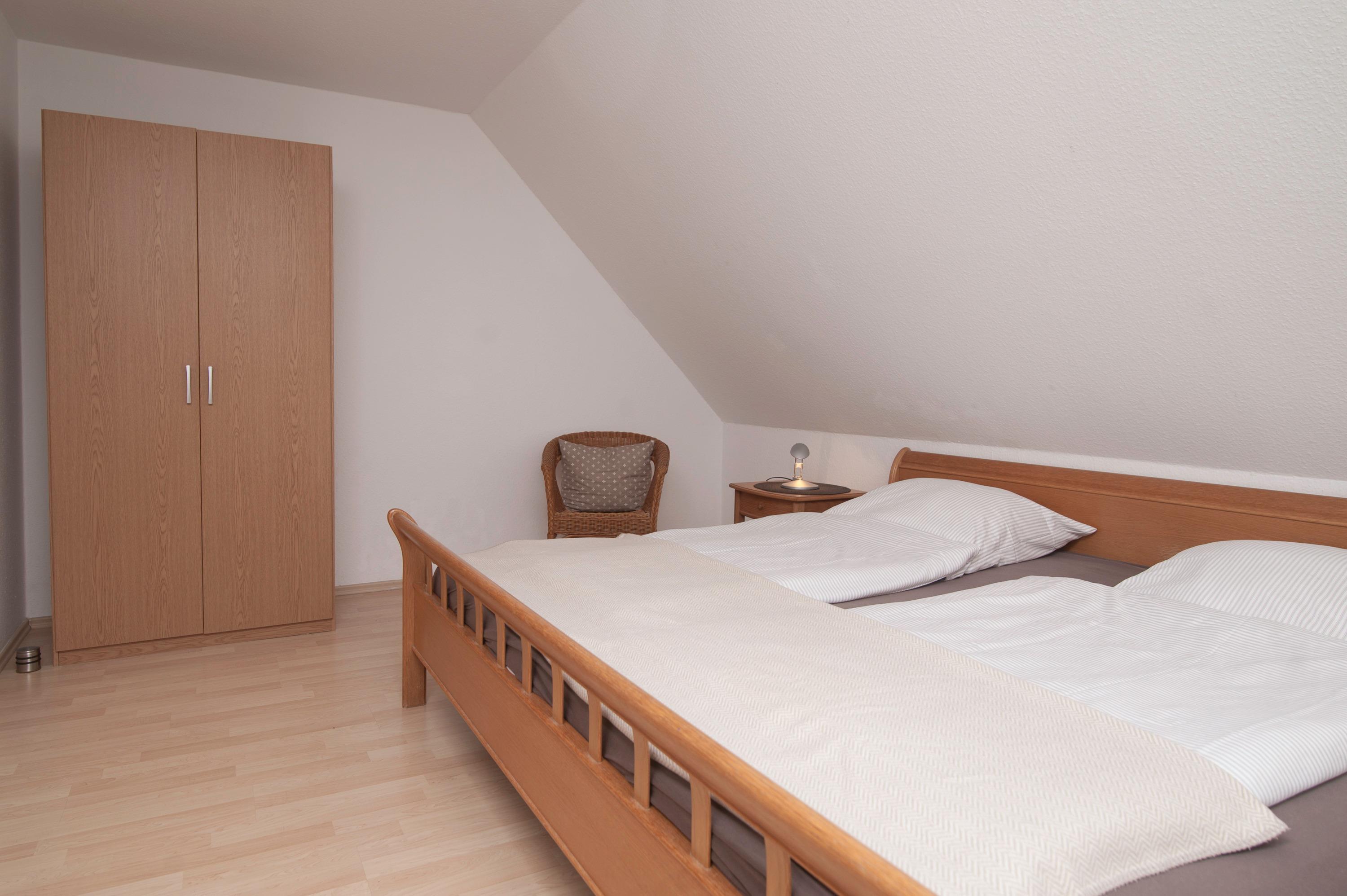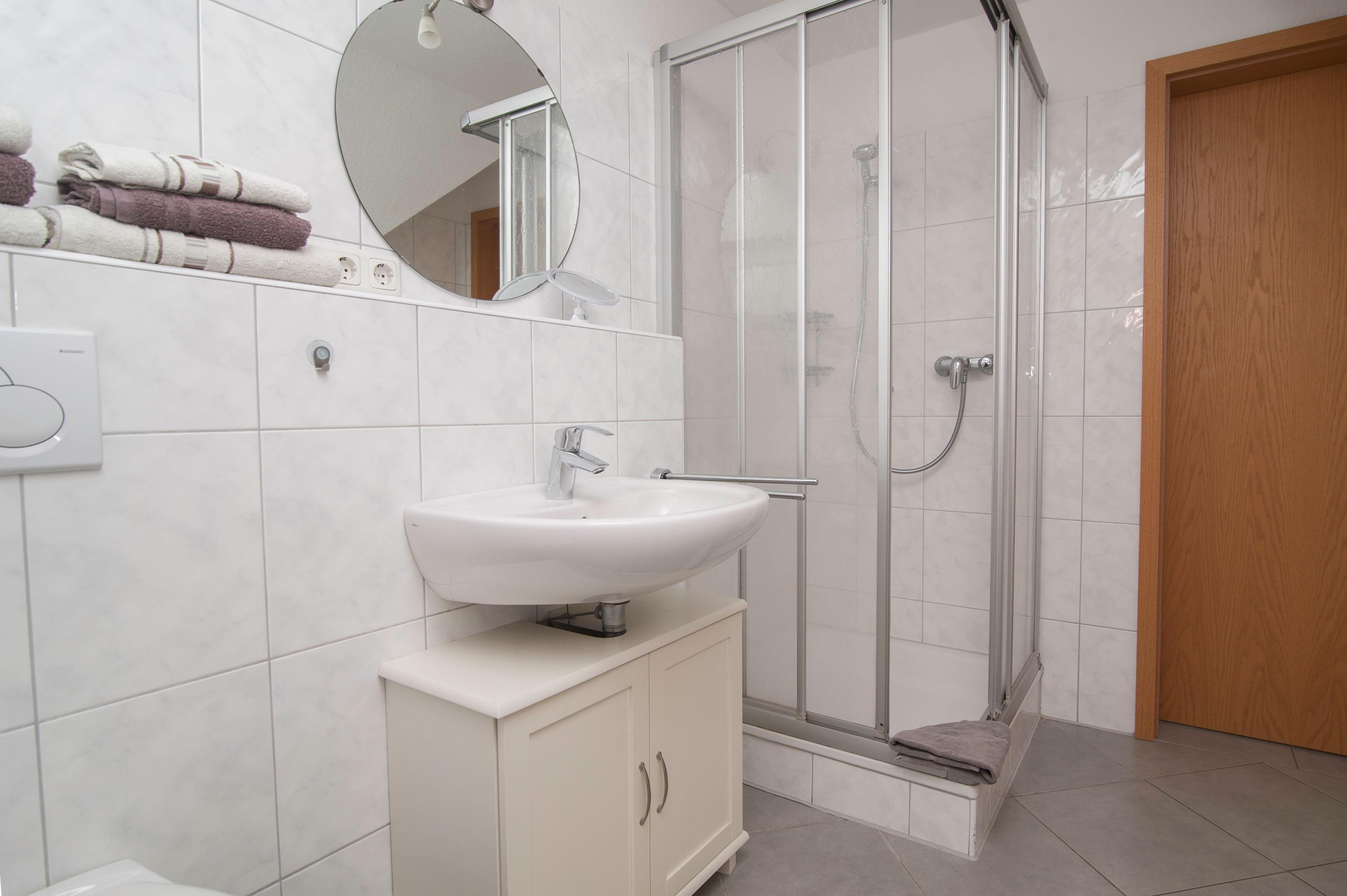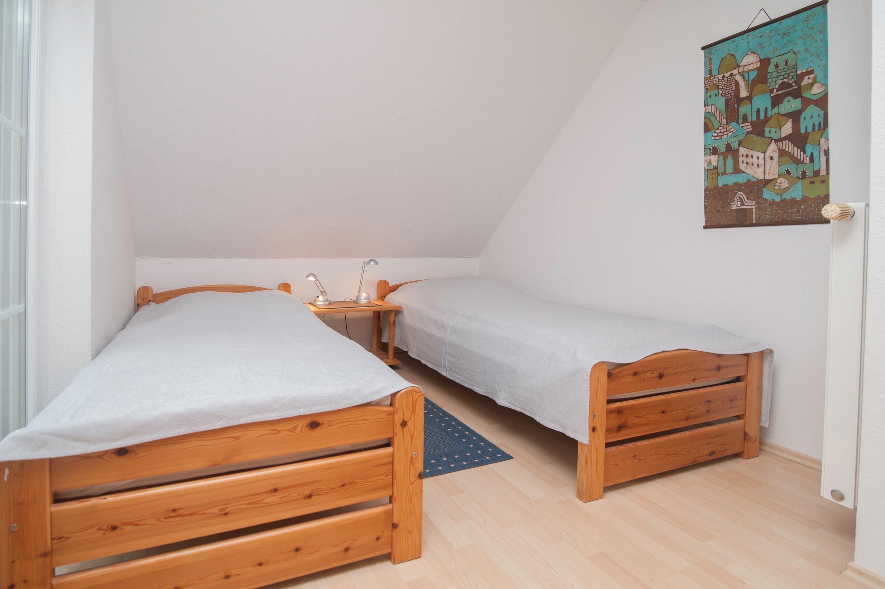 Badezimmer mit Dusche, Waschbecken, WC, Waschmaschine (5kg) und Föhn im Obergeschoß, Schlafraum mit einem Doppelbett (2 x 100 x 200 cm) und Kinderreisebett im Obergeschoß dort befindet sich auch das zweite Schlafraum mit zwei Einzelbetten (90 x 200 cm)