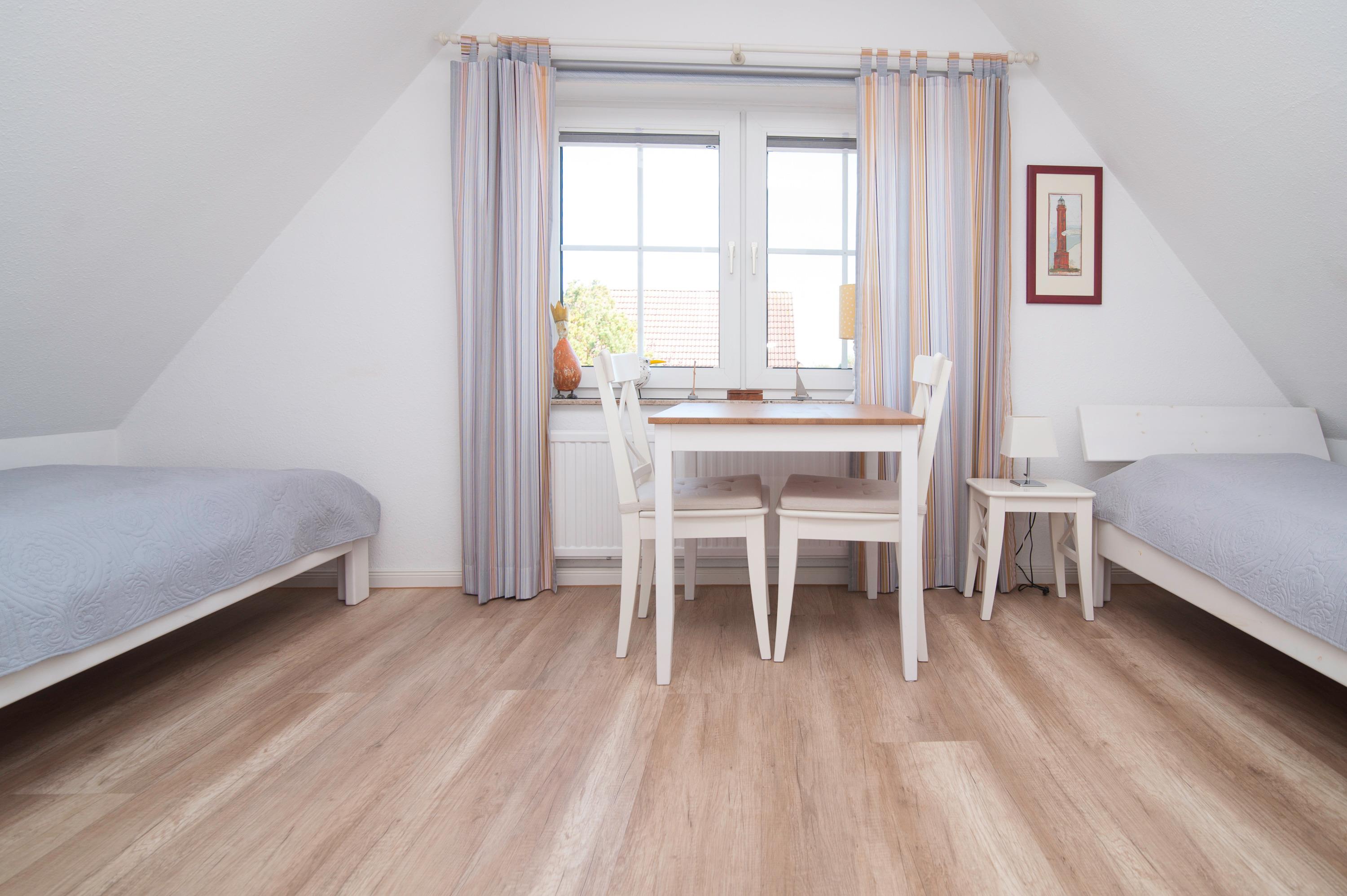 Badezimmer mit Dusche, Waschbecken und WC im Obergeschoss, sowie ein Schlafzimmer mit einem Doppelbett im Obergeschoß (2 x 90 x 200cm) und ein zusätzliches Schlafzimmer mit zwei Einzelbetten[nbsp] (90 x 200cm).