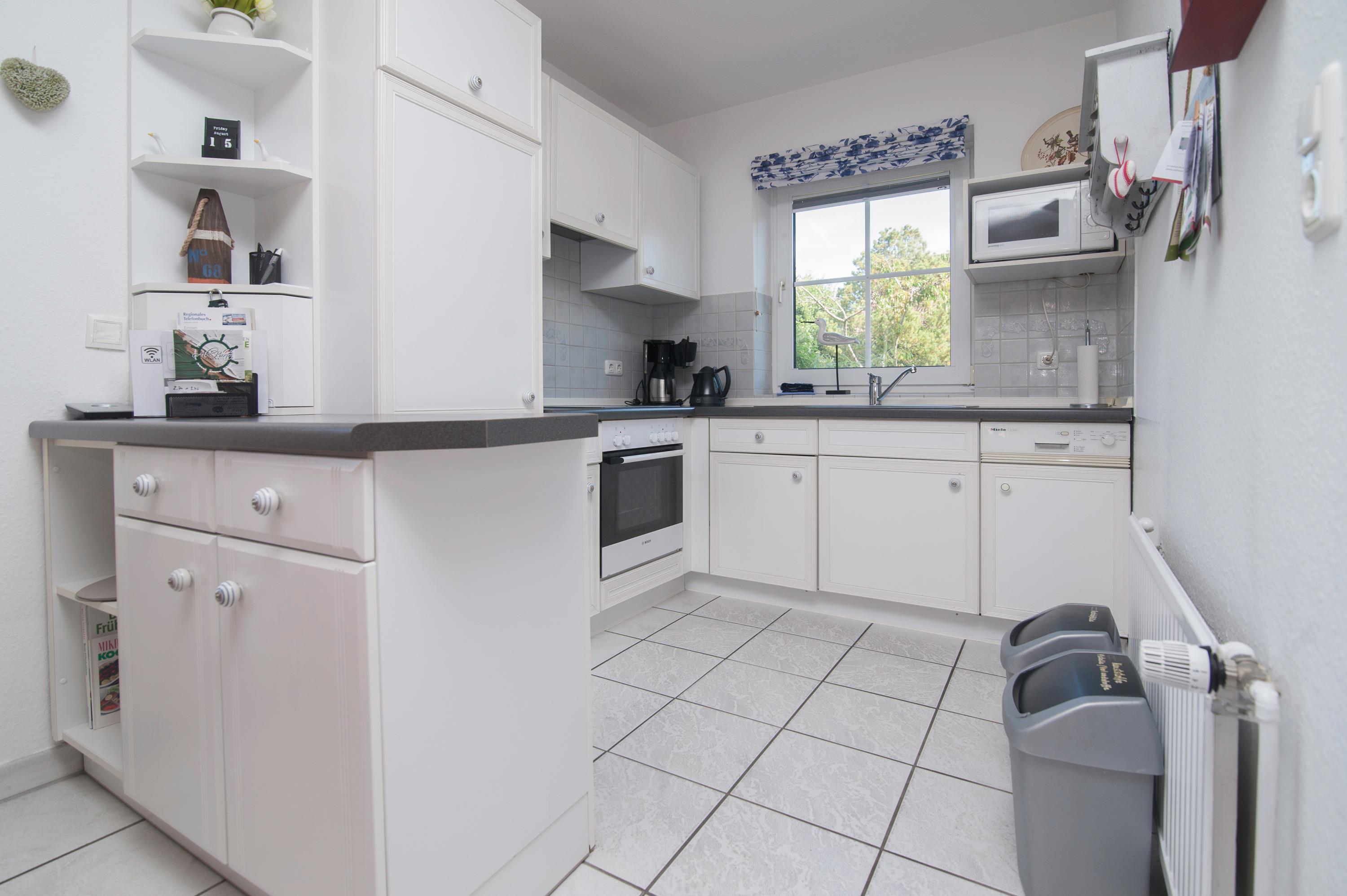 Einbauküche komplett ausgestattet, Herd mit Cerankochfeld, Dunstabzugshaube, Mikrowelle, Geschirrspüler, Kühlschrank mit Gefrierfach, Filterkaffeemaschine, Toaster Wasserkocher und vielem mehr.