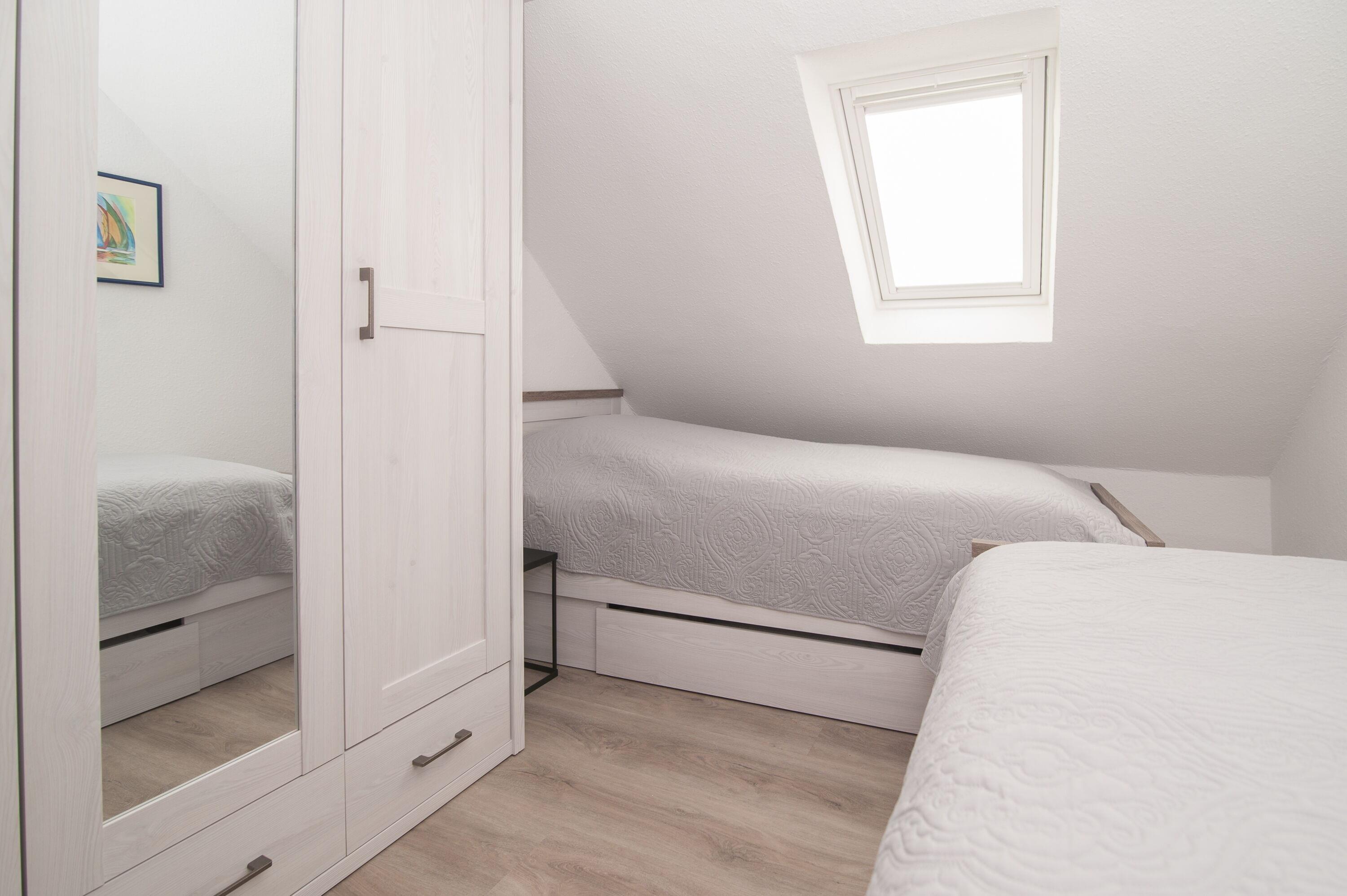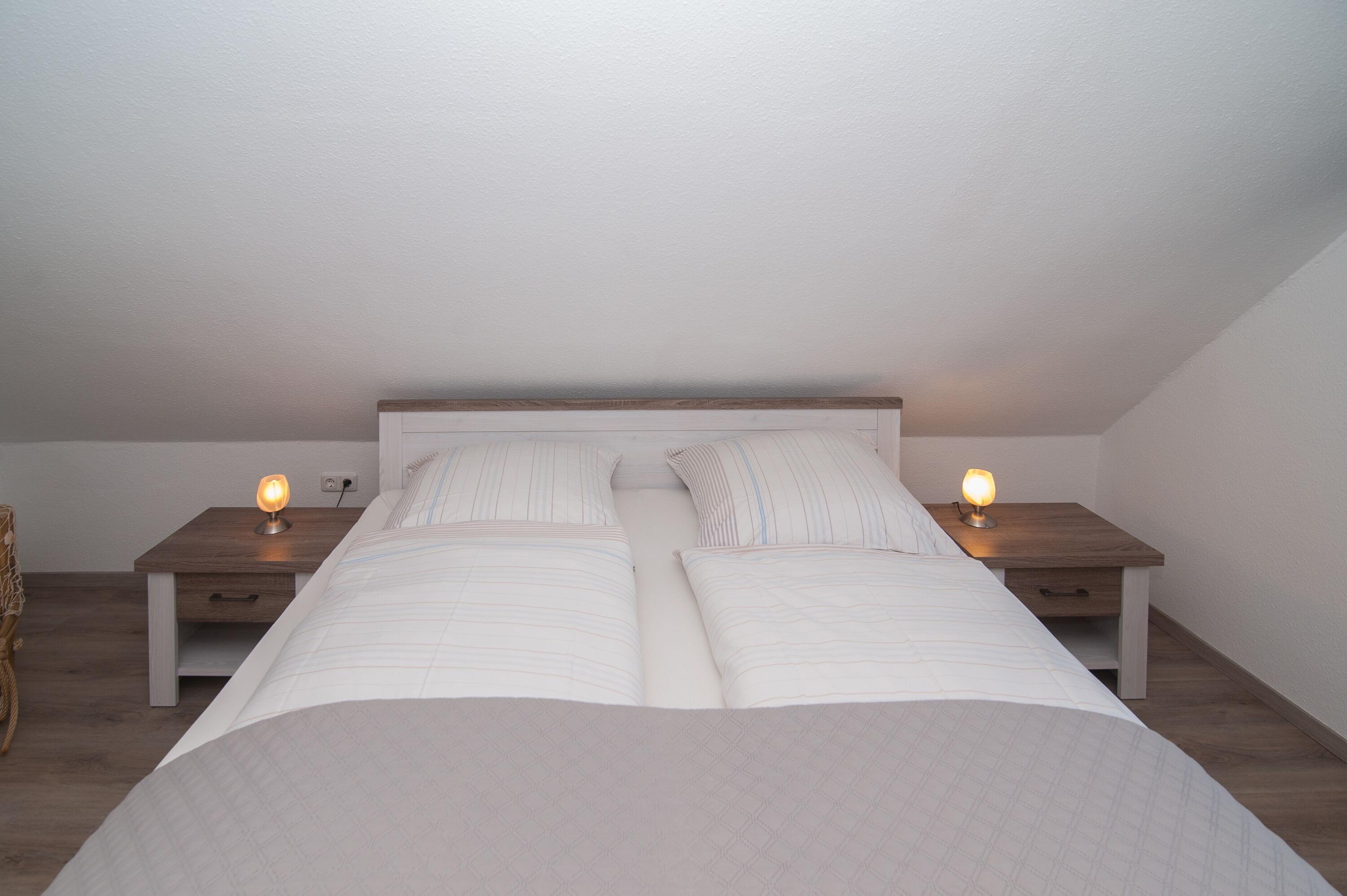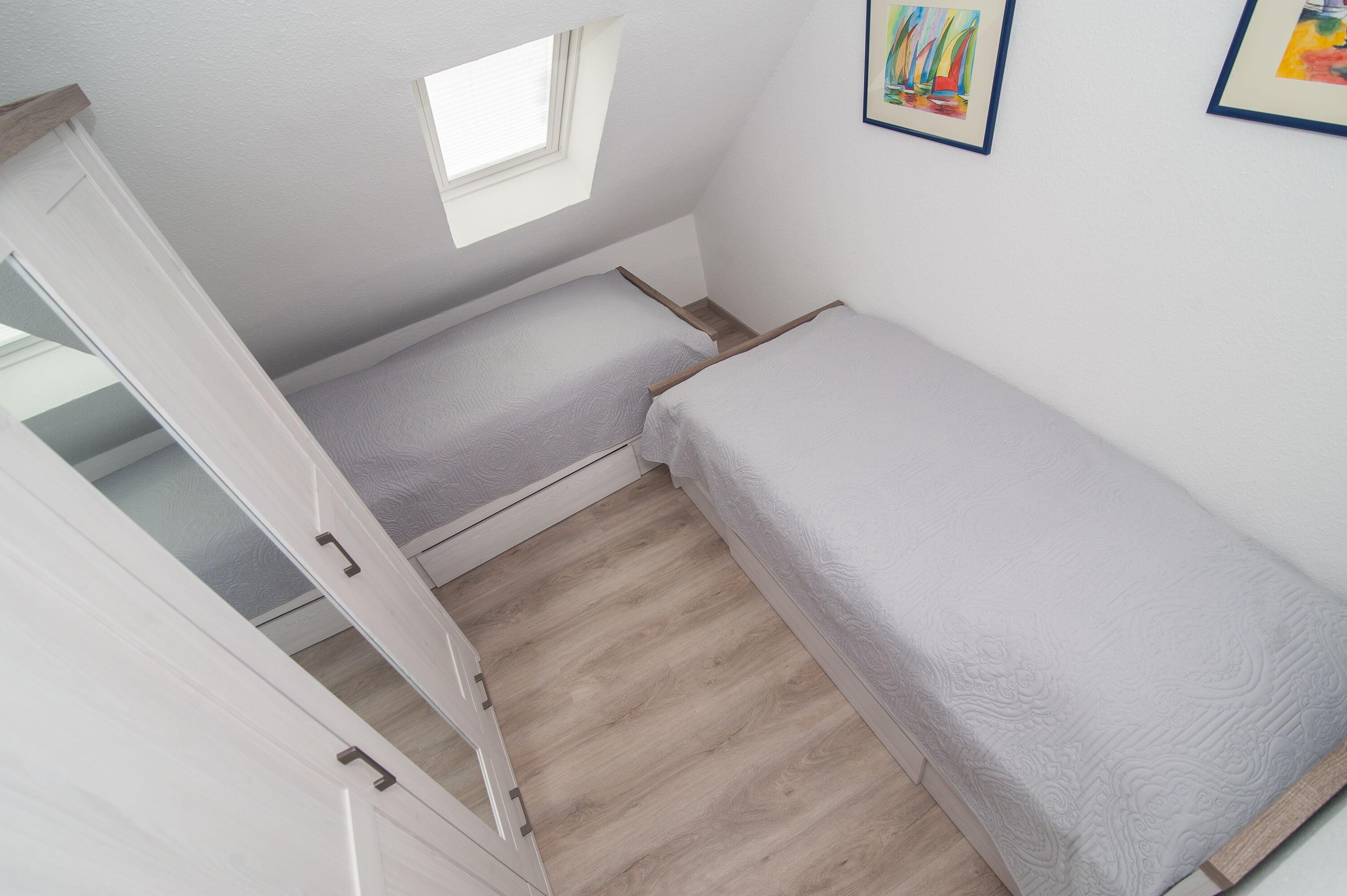 Im Obergeschoss befinden sich das Badezimmer mit Dusche, Waschbecken und WC, ein Schlafzimmer mit einem Doppelbett (2 x 100 x 200 cm) und ein Schlafzimmer mit zwei Einzelbetten (90 x 200 cm), jeweils mit Verdunkelungsplissees und Vorhang.