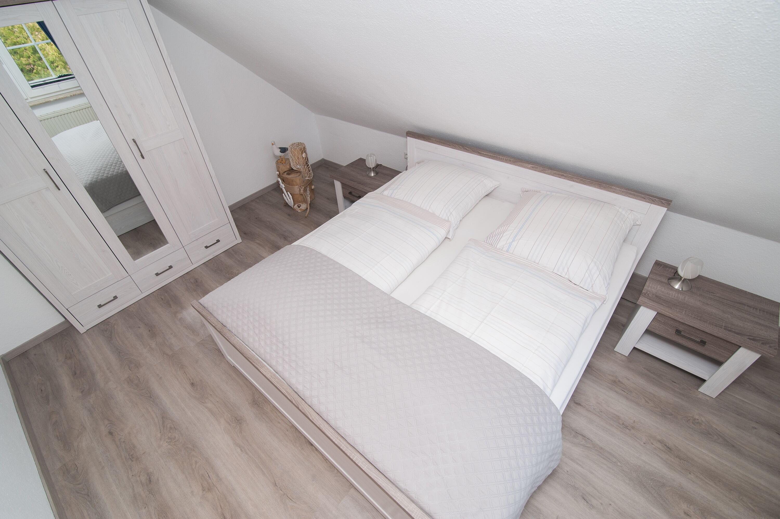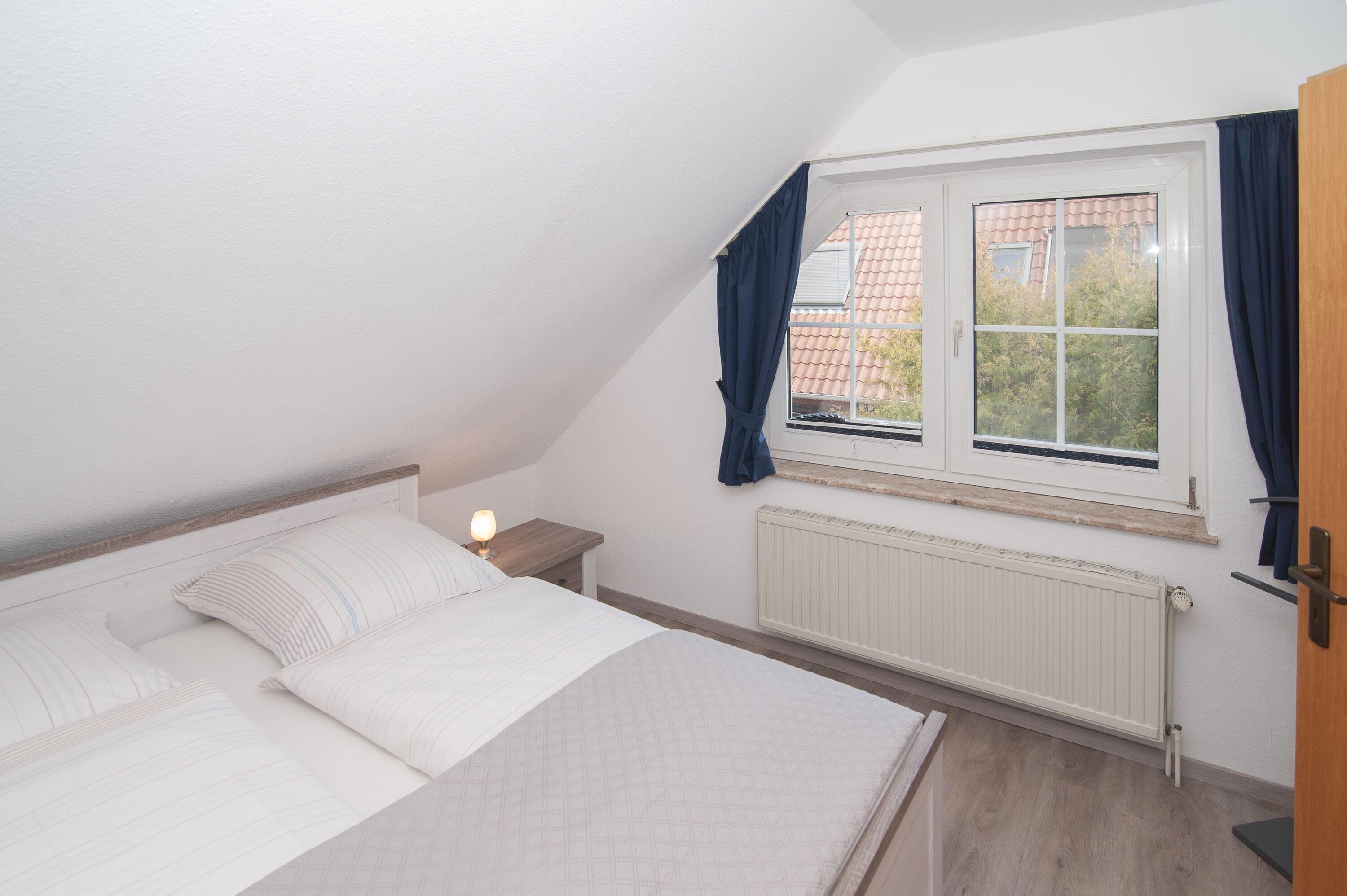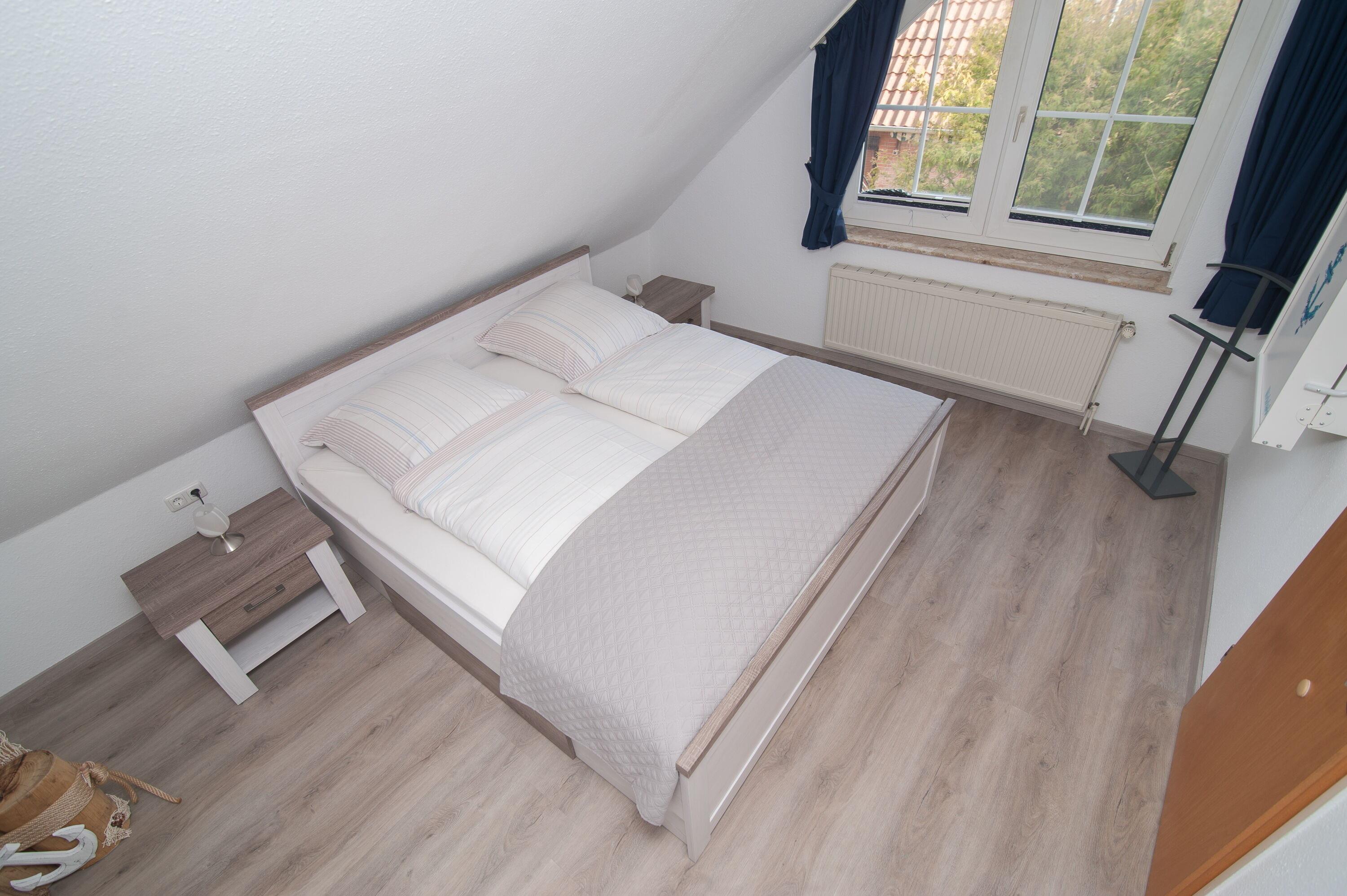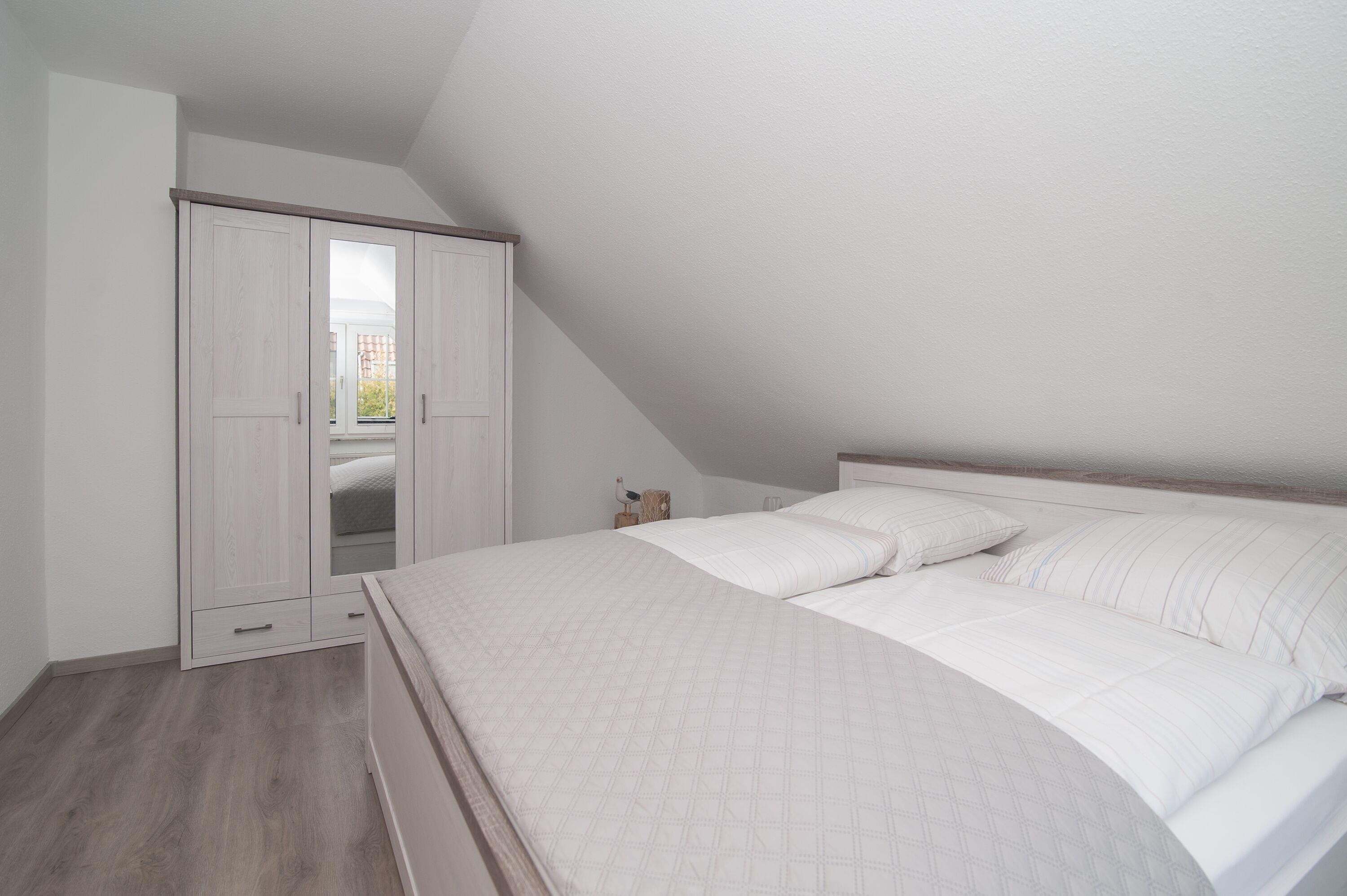 Im Obergeschoss befinden sich das Badezimmer mit Dusche, Waschbecken und WC, ein Schlafzimmer mit einem Doppelbett (2 x 100 x 200 cm) und ein Schlafzimmer mit zwei Einzelbetten (90 x 200 cm), jeweils mit Verdunkelungsplissees und Vorhang.