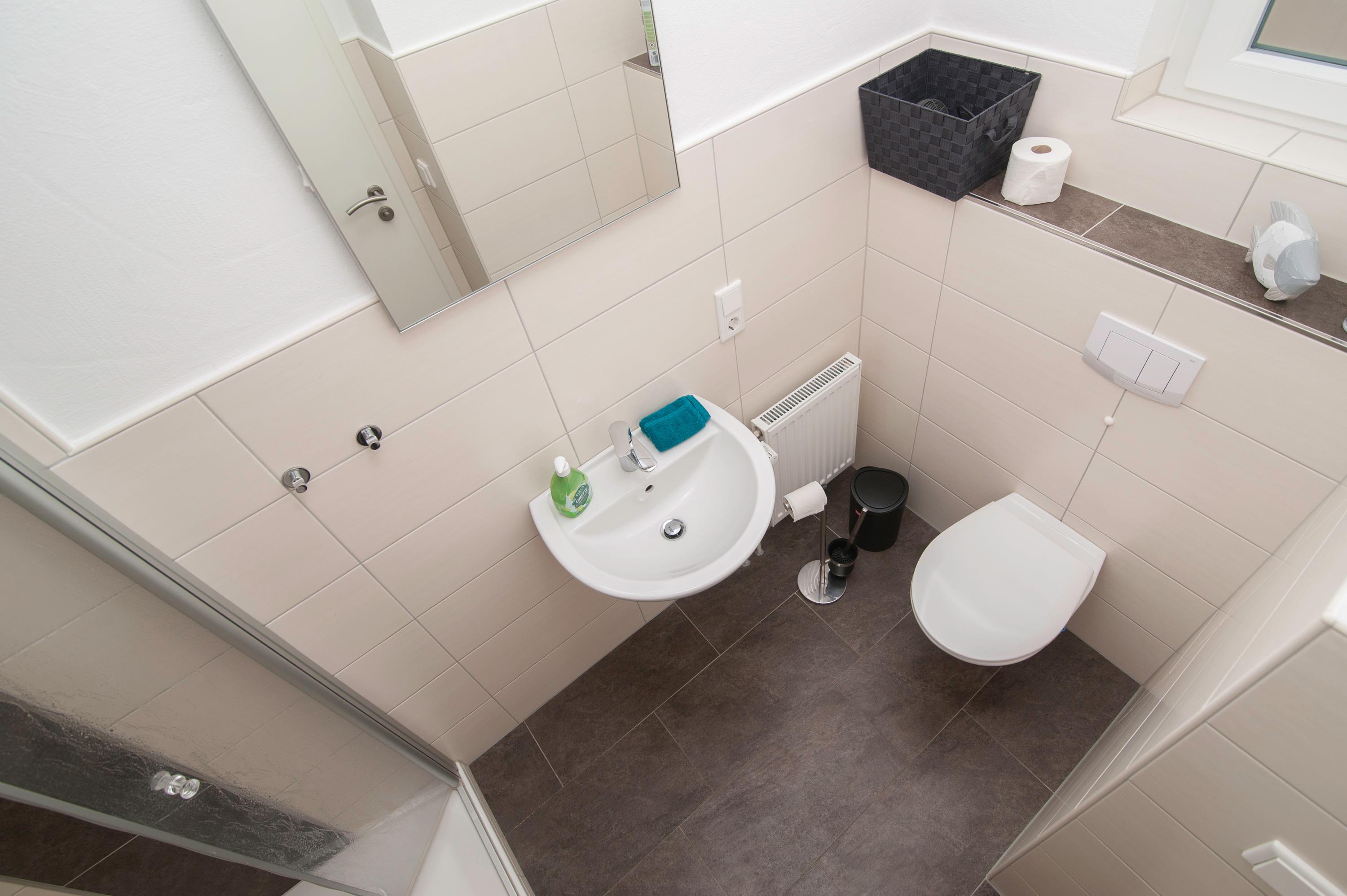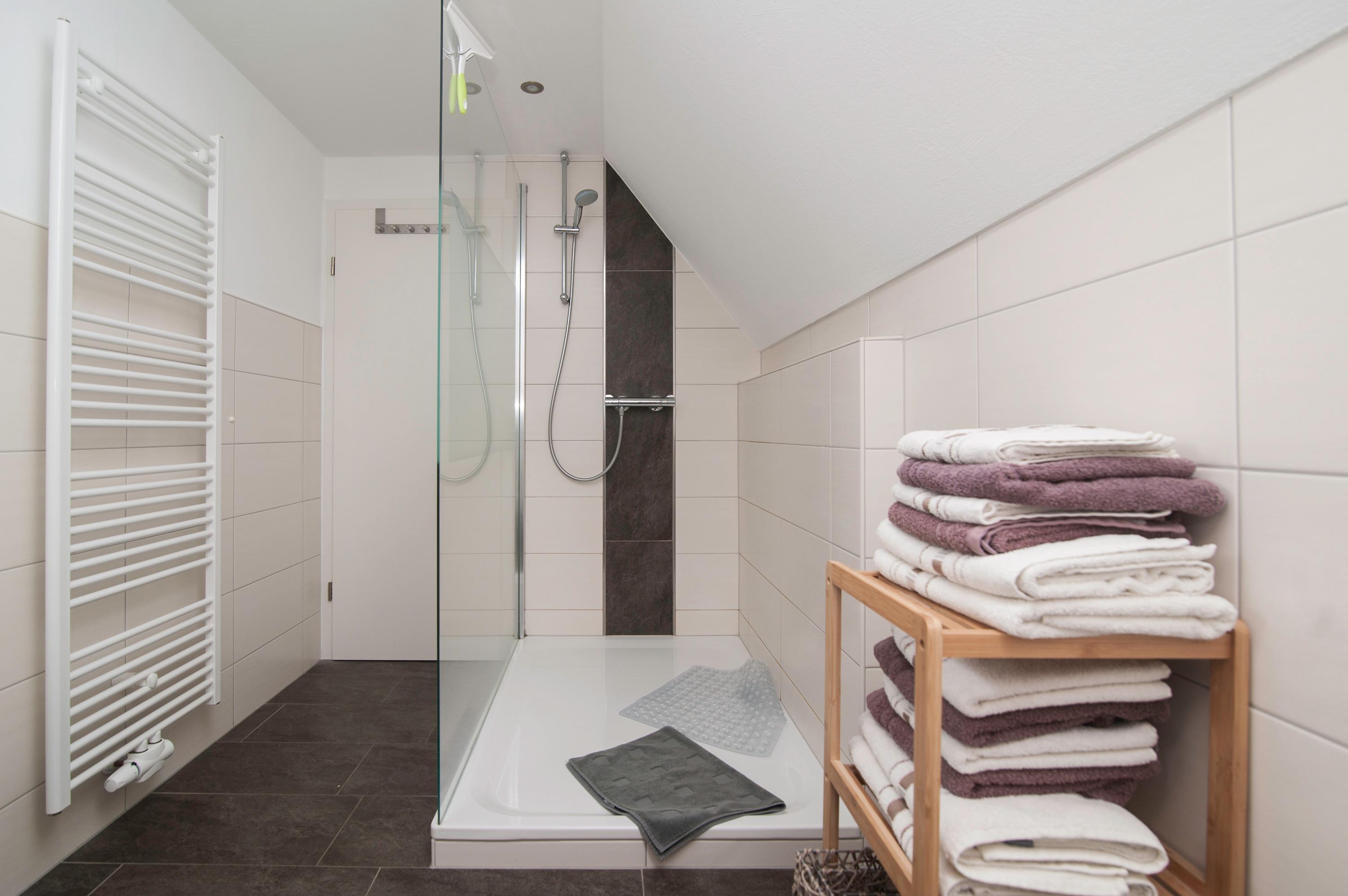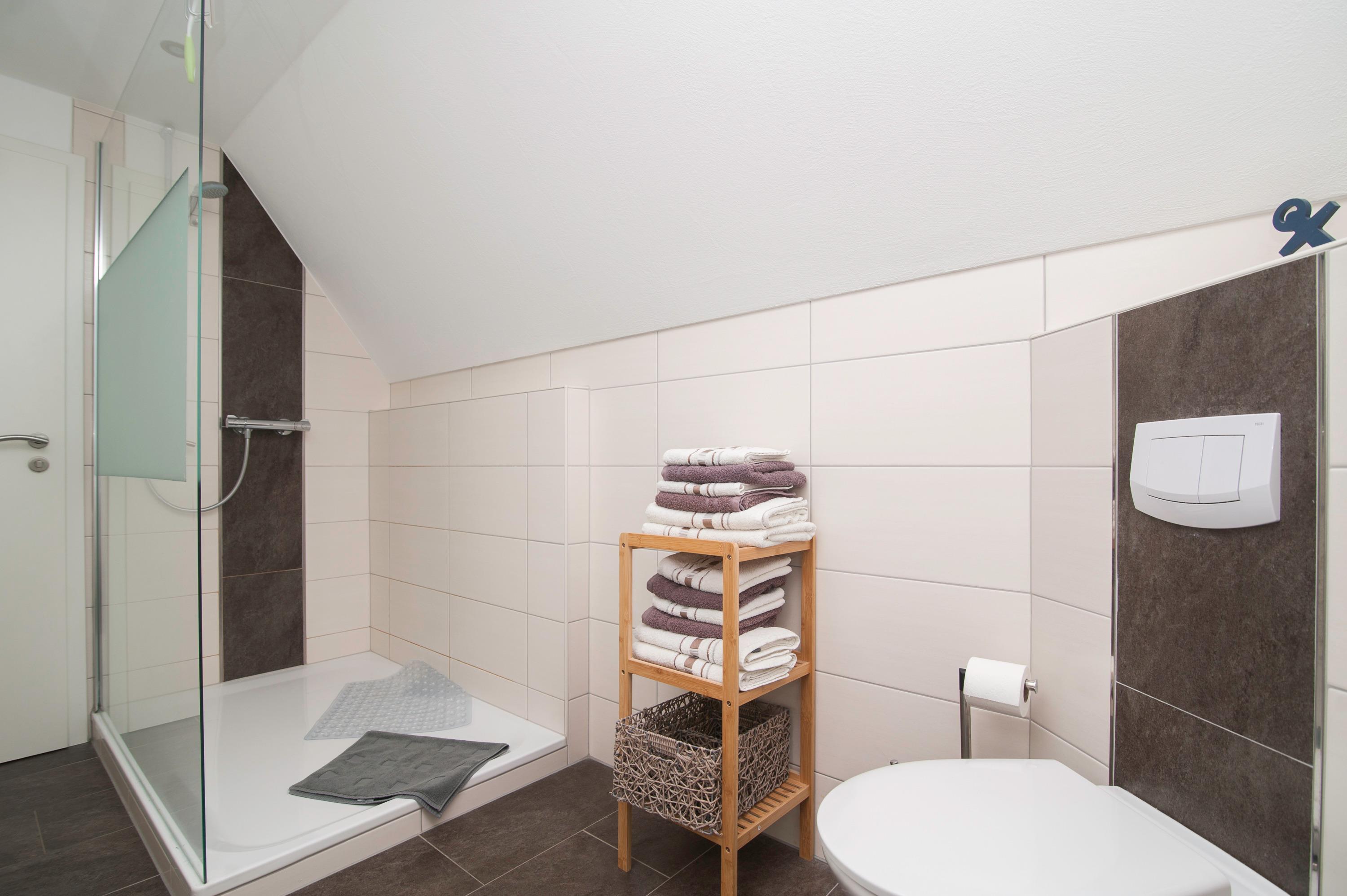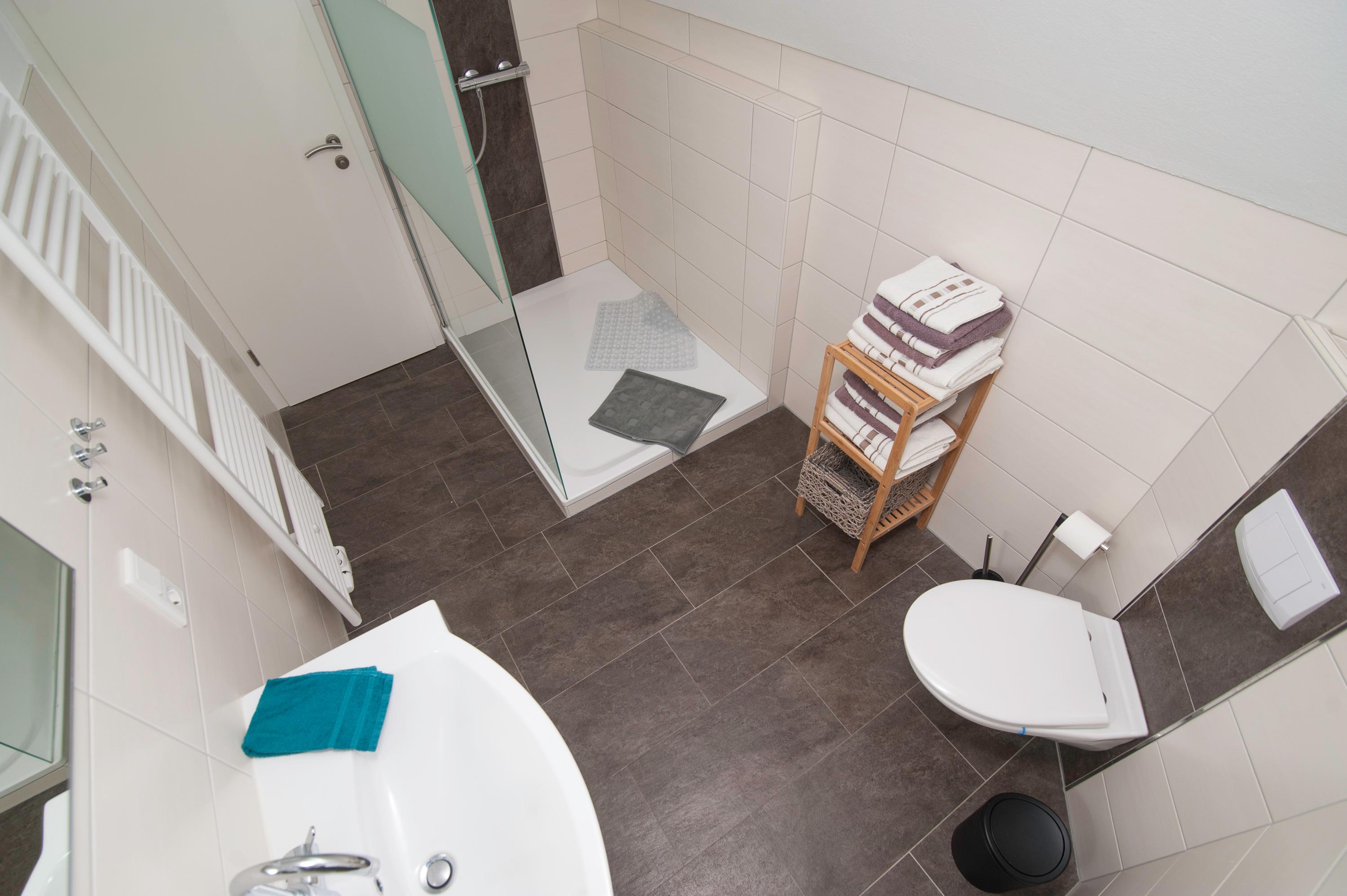 Die beiden Badezimmer im Erdgeschoss und Obergeschoss mit fast bodengleicher Dusche und WC sind hochwertig, modern und elegant eingerichtet (inkl. Haartrockner). Zudem verfügen die beiden Badezimmer sowie das gesamte Erdgeschoss über eine zusätzliche Fußbodenheizung. Für unsere kleinen Gäste sind ein Kinderbett, ein Kinderhochstuhl sowie ein Treppenschutzgitter vorhanden. Das gesamte Haus ist mit Insektenschutzgittern und Außenrolläden (im EG elektrisch) ausgestattet.