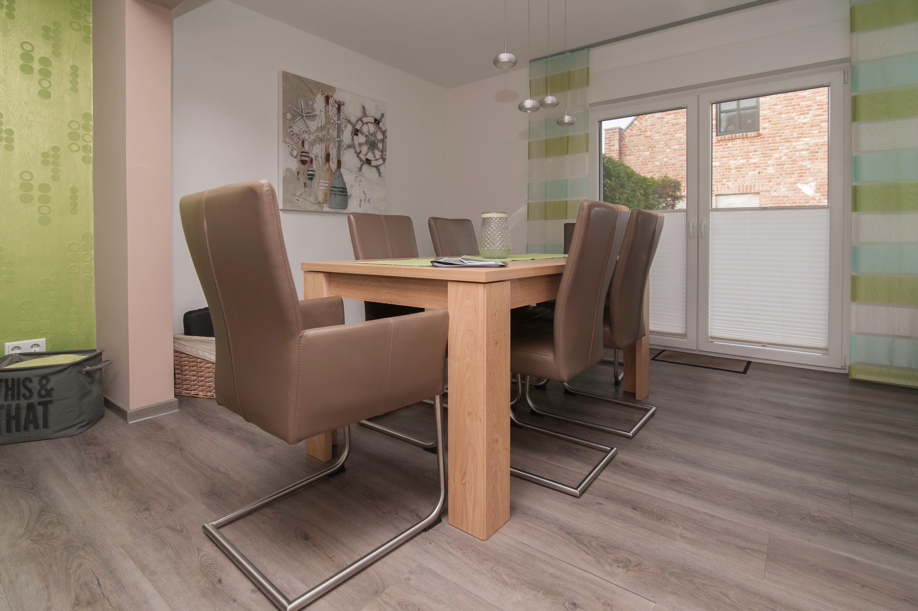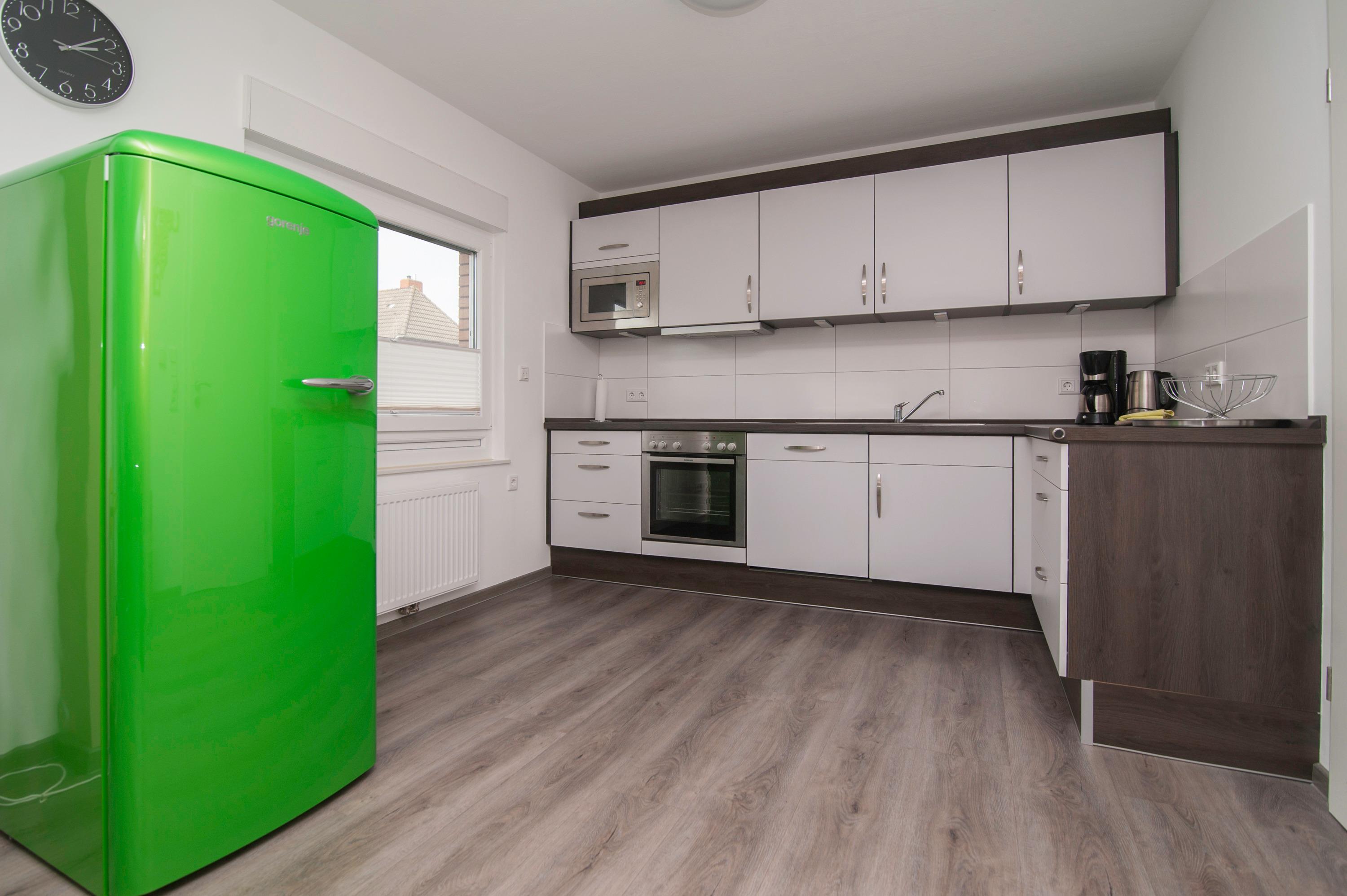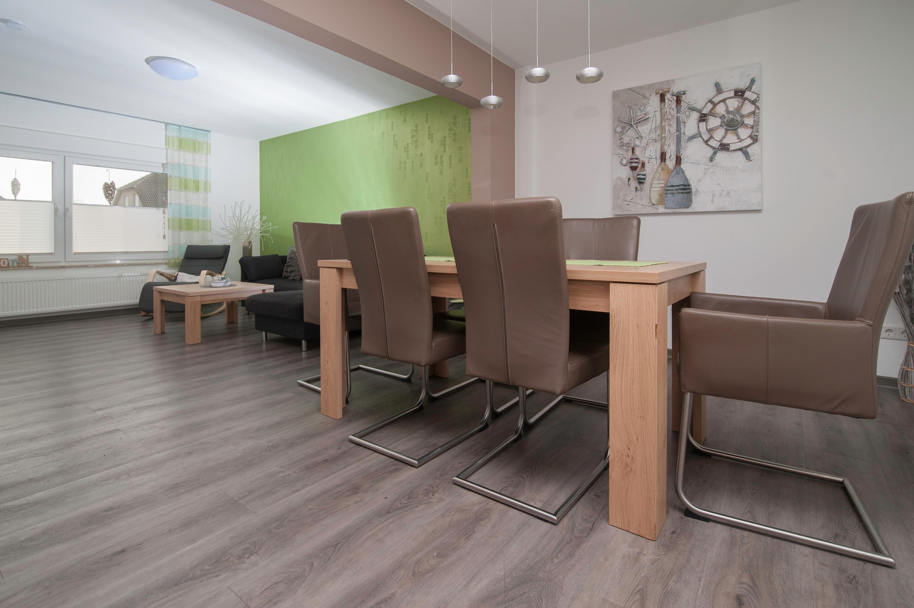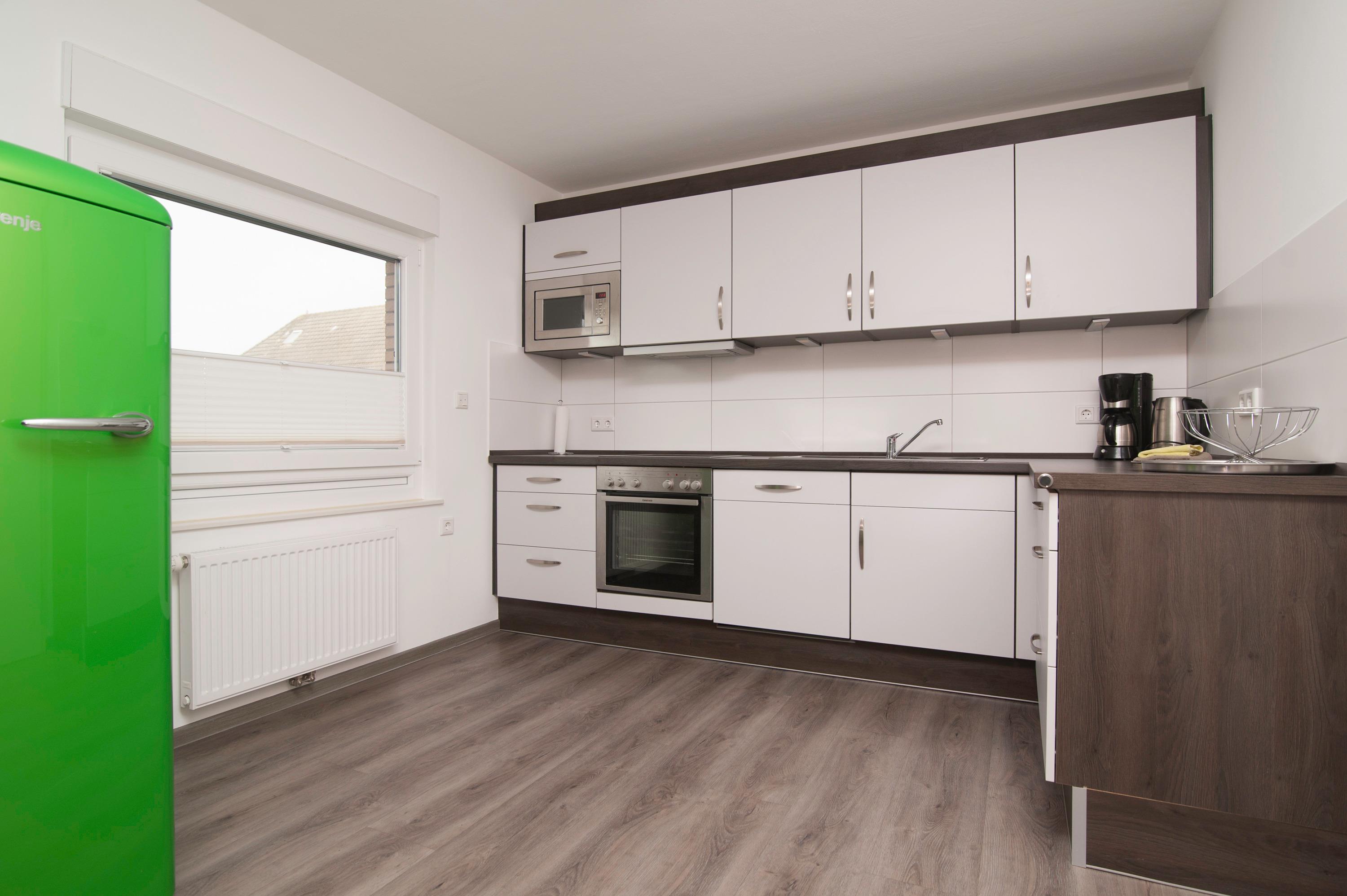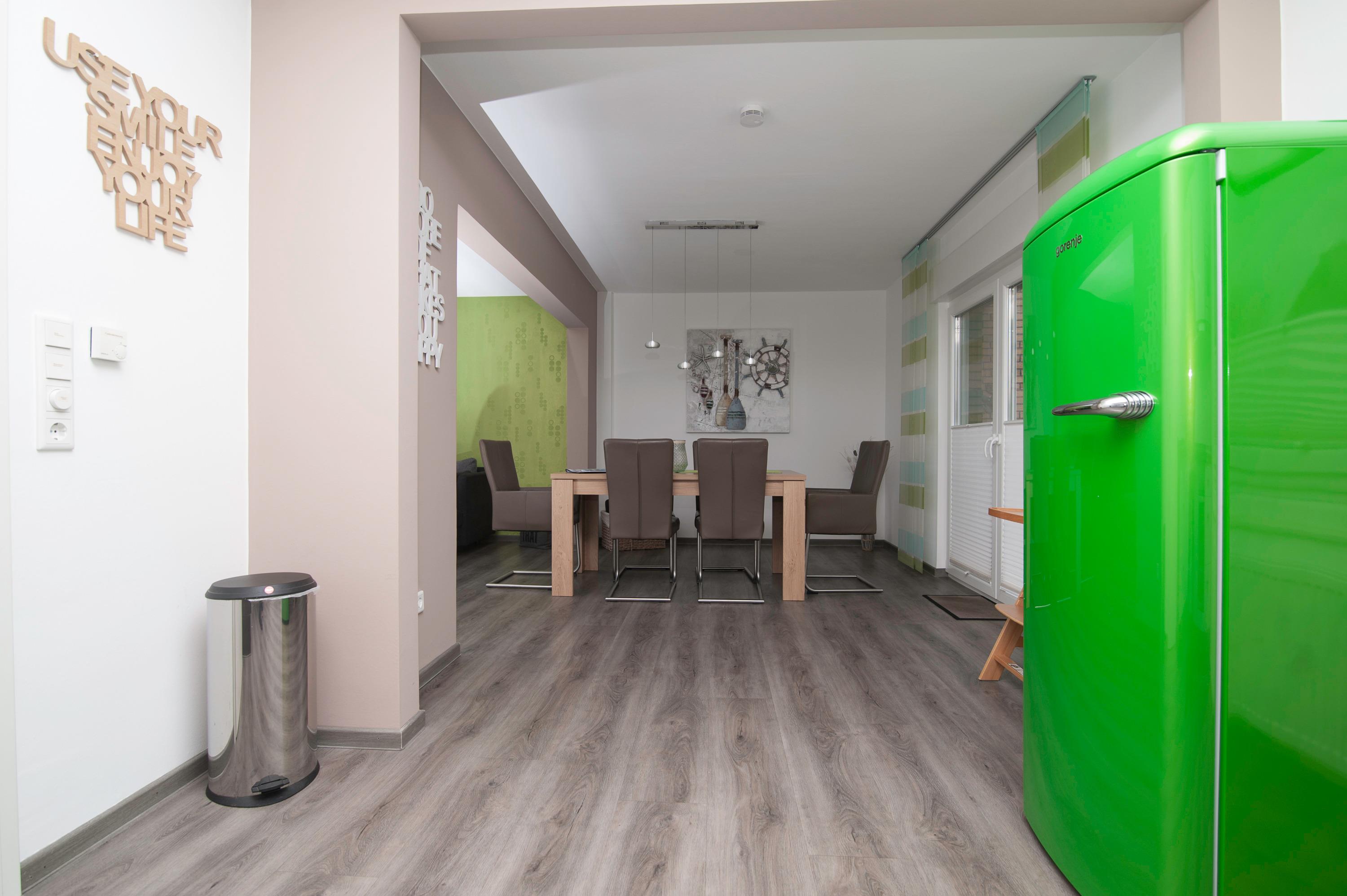Im Erdgeschoss befindet sich ein offener Wohnbereich mit Ledermöbeln, 50"Philips FullHD-TV, kleiner Stereoanlage, sowie ein Essbereich für 6 Personen mit großem Esstisch. Eine angrenzende, komplett eingerichtete Küche mit Geschirrspülmaschine, Mikrowelle, Herd mit Cerankochfeld, eine freistehende Kühl-/Gefrierkombination sowie alle benötigten Küchenutensilien wie Wasserkocher, Toaster, Filterkaffeemaschine, Handrührgerät, Pürierstab u.v.m stehen Ihnen zur Verfügung.