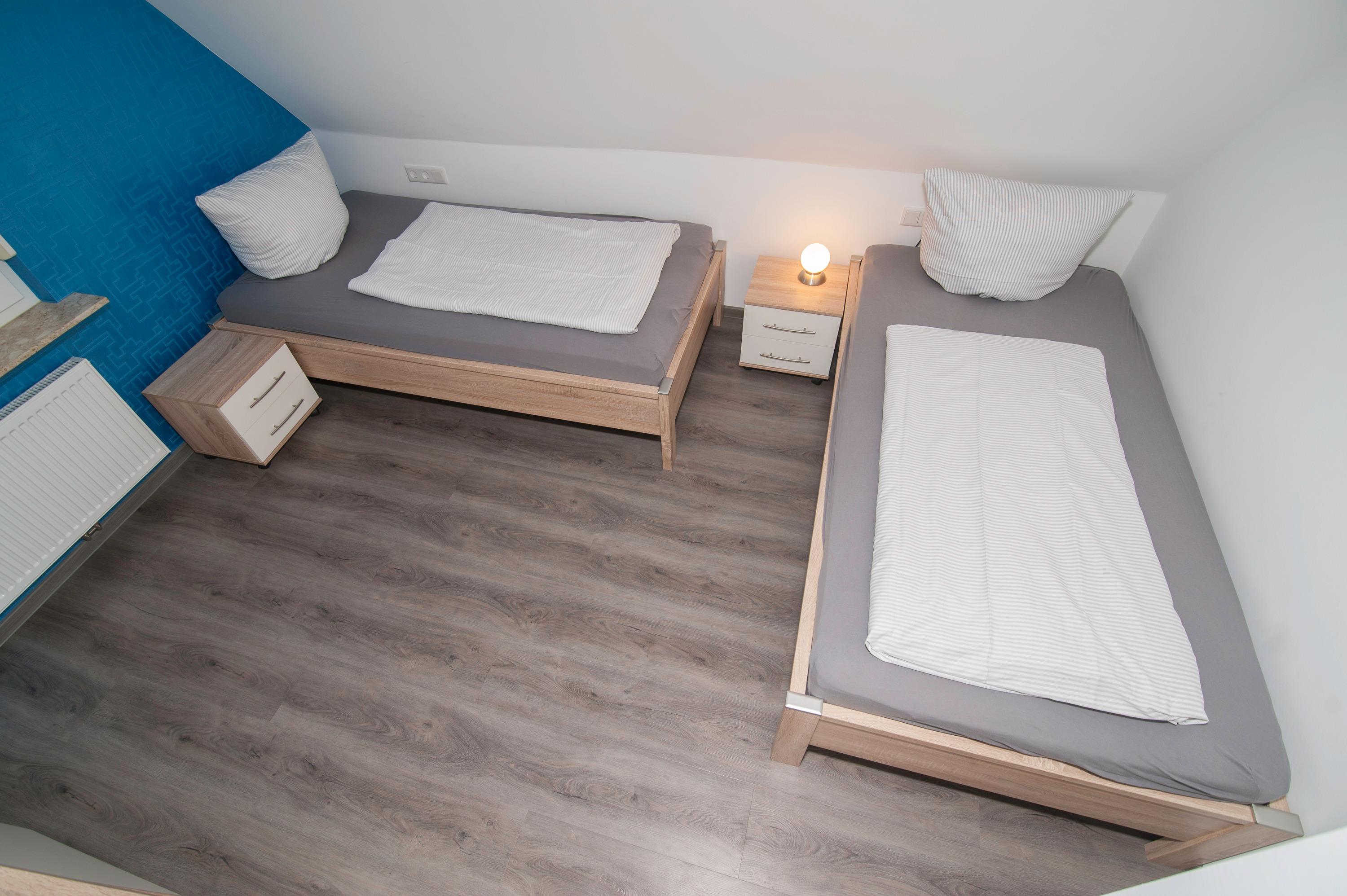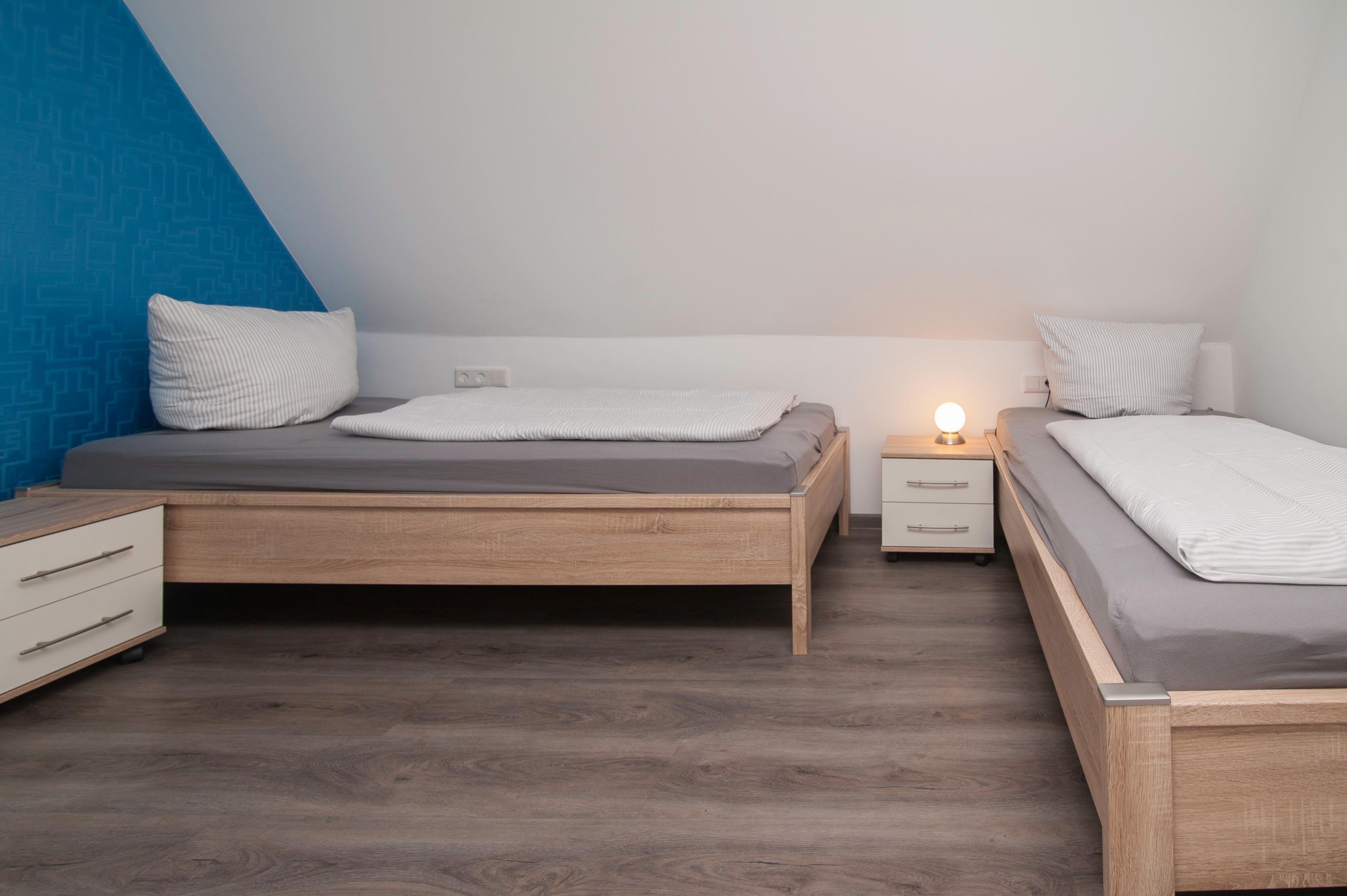 Das Haus verfügt über 2 Schlafzimmer im Obergeschoss, davon ein Schlafzimmer mit einem 2,00 m x 2,00 m großen Box-Spring-Bett und 32"Sony LCD-TV und ein Zimmer mit zwei Einzelbetten (1,00 m x 2,00 m) und einem 28" Grundig FullHD LED-TV.