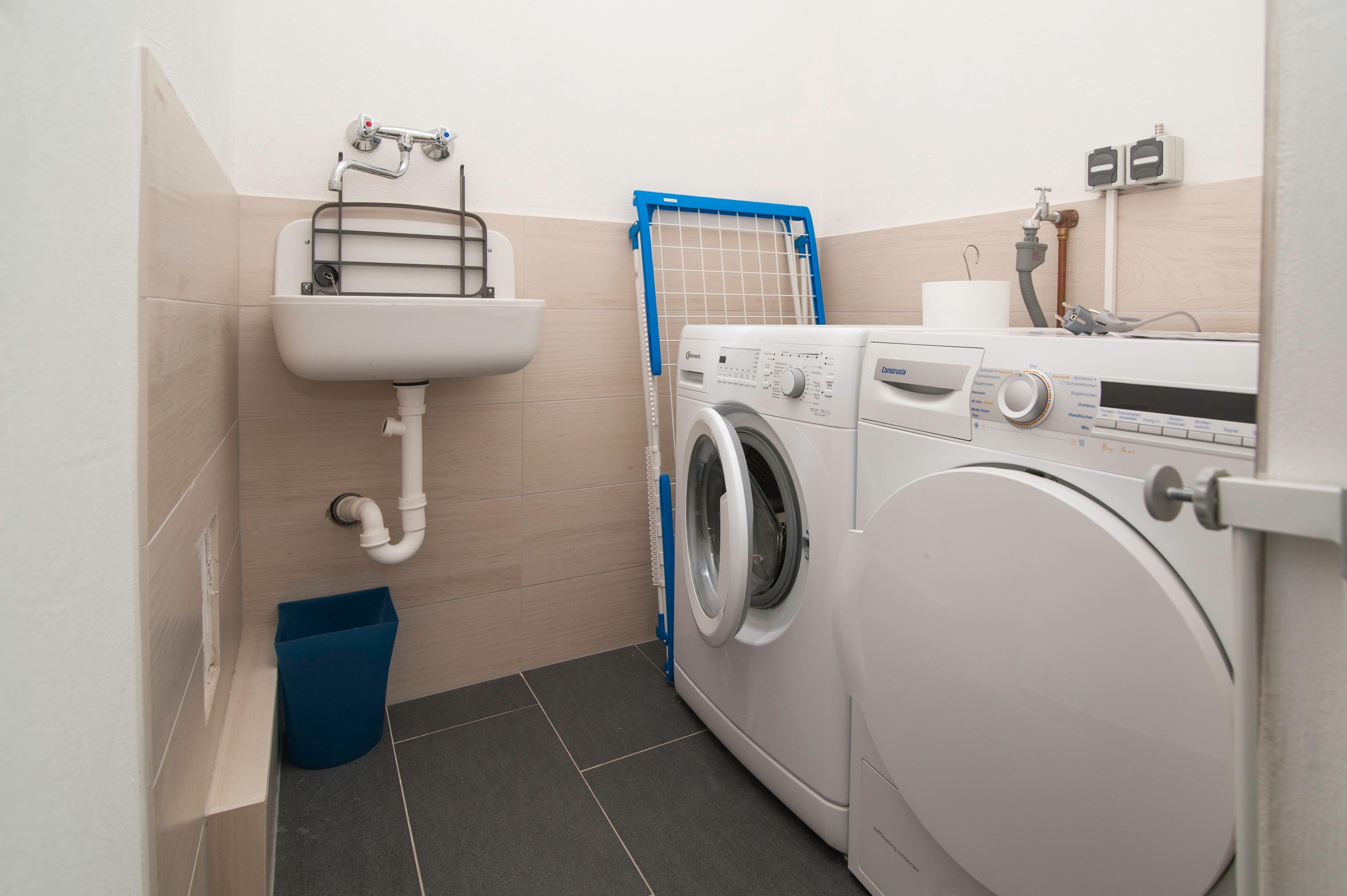 Waschmaschine (8kg), Wäschetrockner und ein Bügeleisen mit Bügelbrett in einem separaten Raum im Erdgeschoss komplettieren dieses Ferienobjekt.