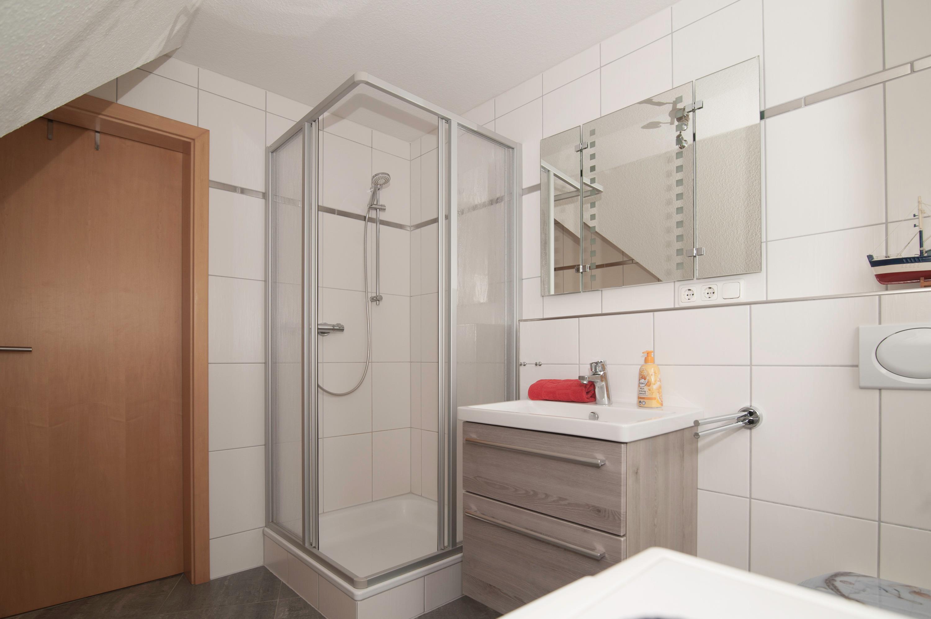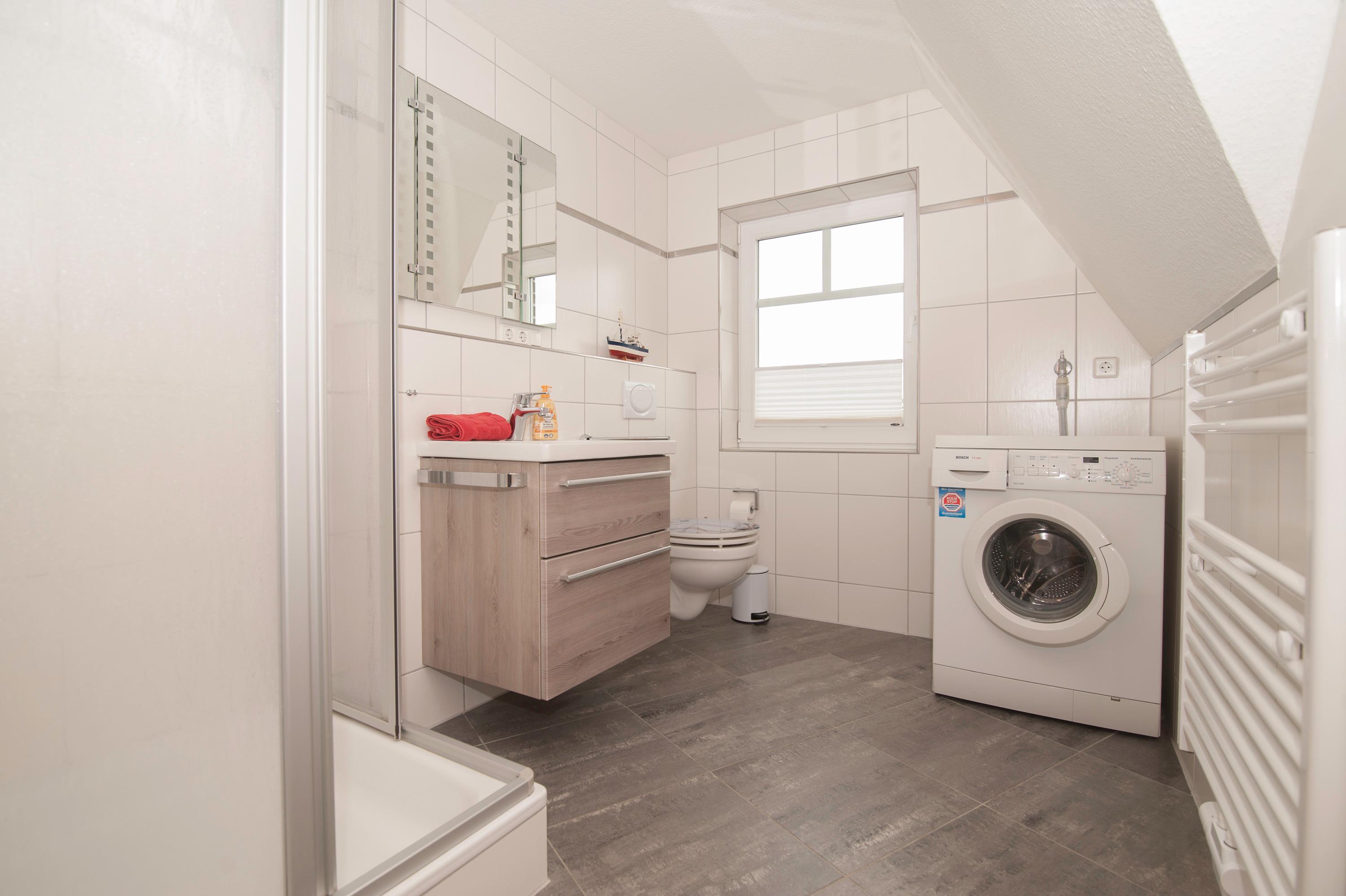 Auch das Badezimmer ist im Obergeschoß mit Dusche, Fußbodenerwärmungsanlage und Waschmaschine. Im Abstellraum finden sie u.a. Kinderreisebett, Hochstuhl, Wäscheständer, Bügelbrett und Bügeleisen.