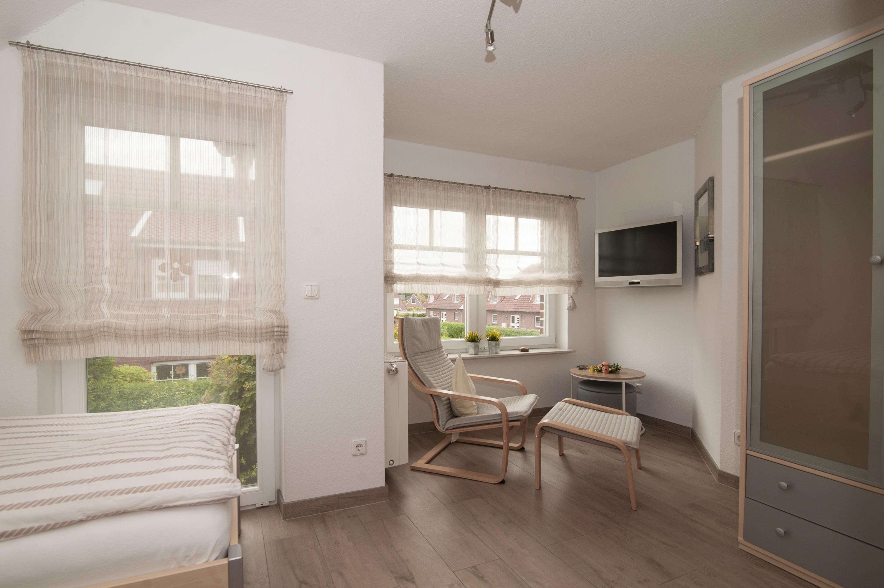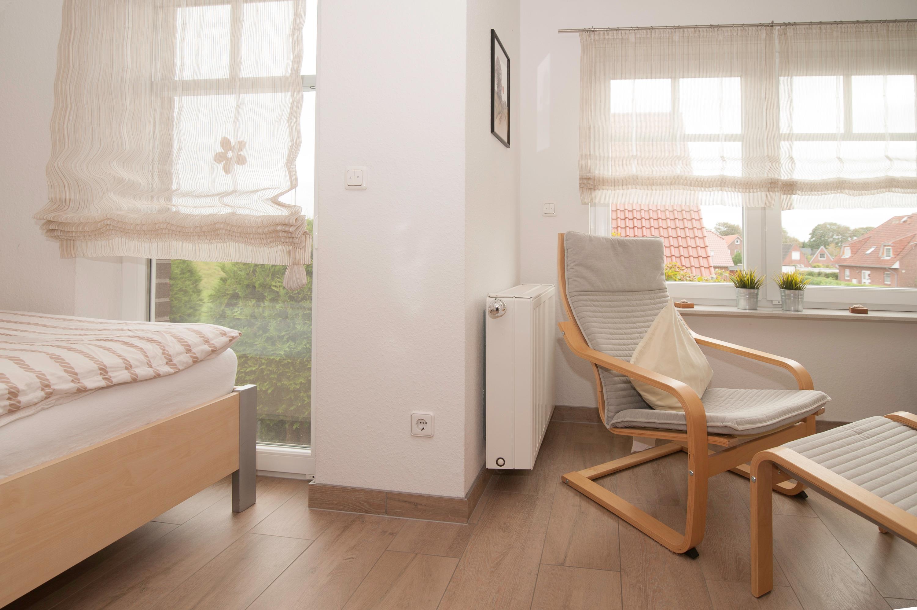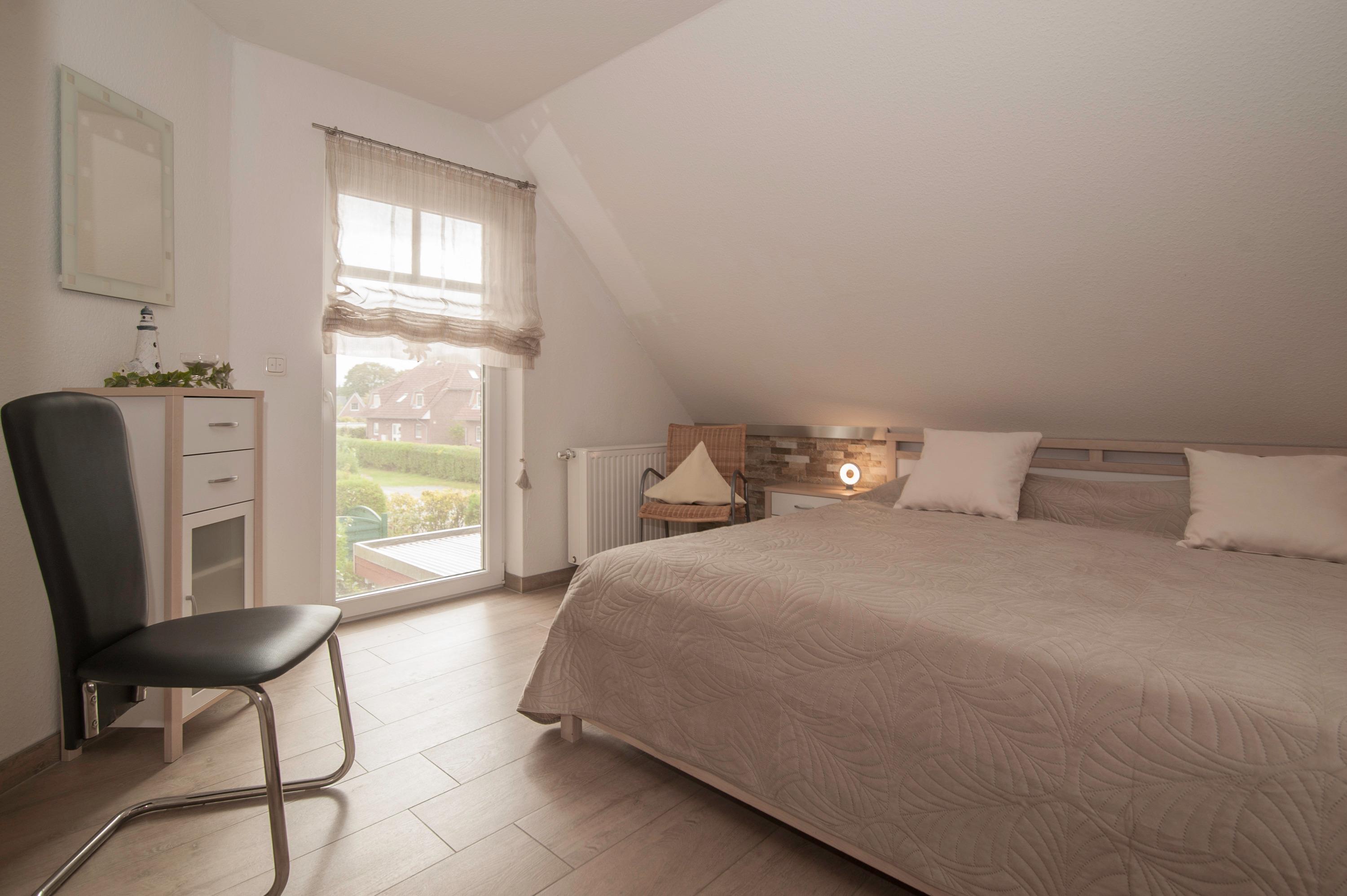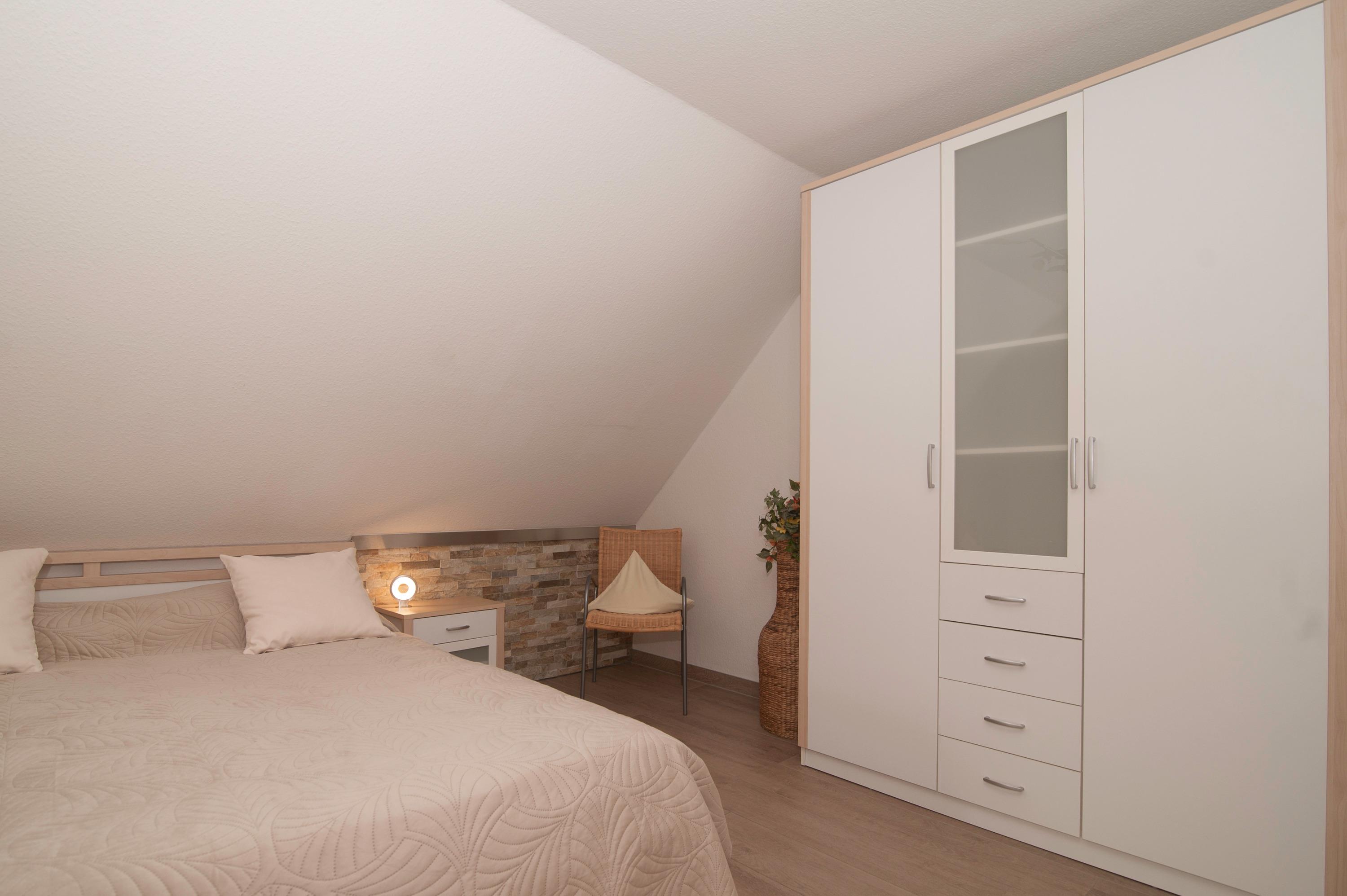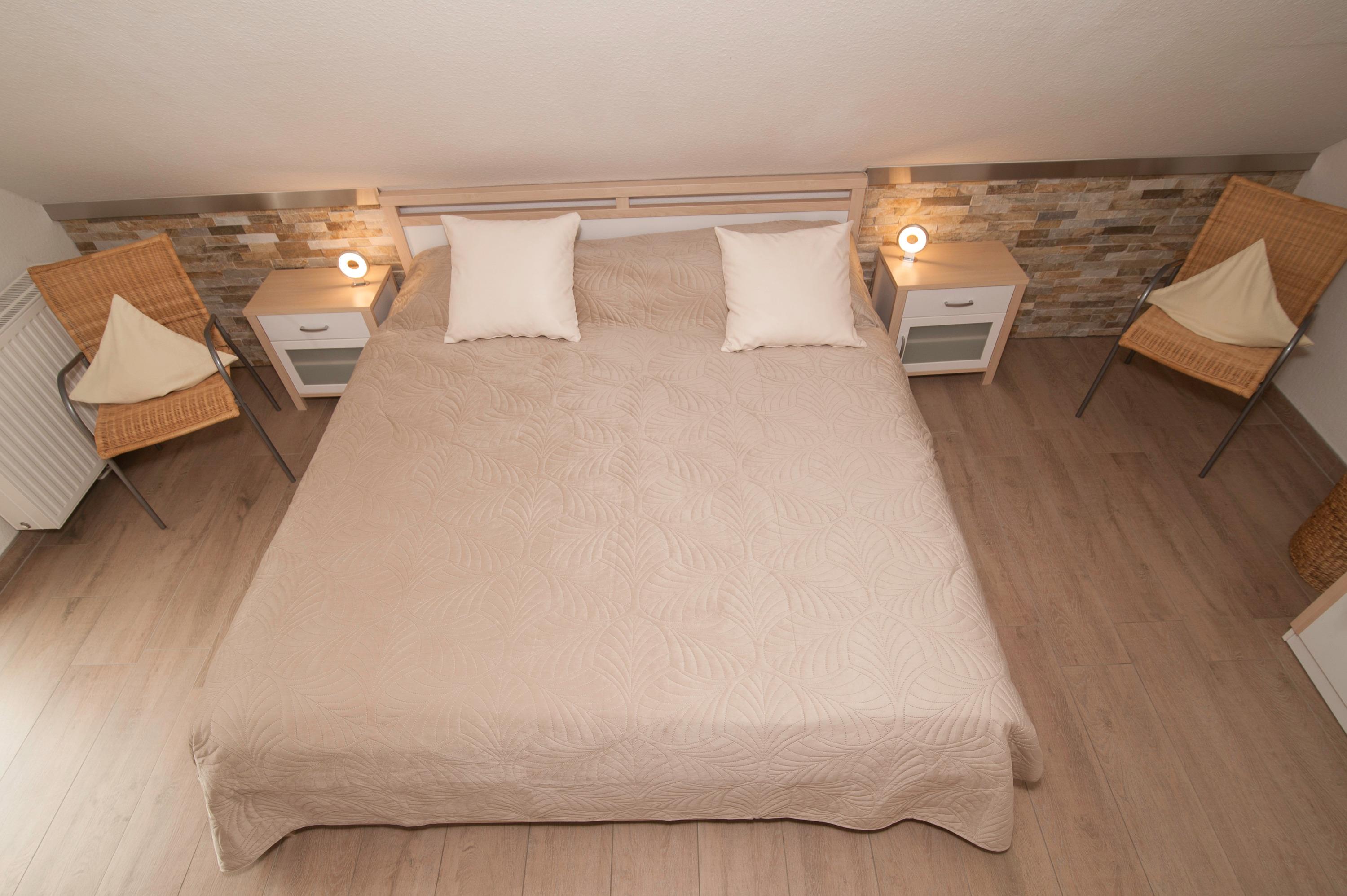 Im Obergeschoss befinden sich 2 modern eingerichtete Schlafräume, einmal mit Doppelbett, einmal mit 2 Einzelbetten. Hier steht ein zweites 32"TechniSat LCD-TV zur Verfügung. Die Bettdecken haben ein Maß von 1,55 x 2,20 m.