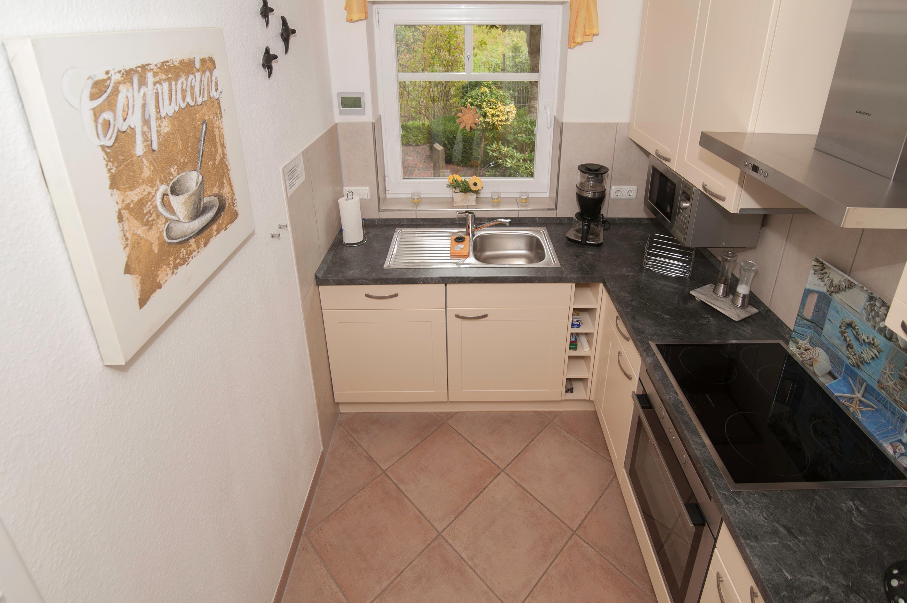 Die komfortable Einbauküche ist mit Herd und Induktionskochfeld, Mikrowelle, Dunstabzugshaube, Kühlschrank mit Gefrierfach, Geschirrspüler, Filterkaffee + Kaffee-Padmaschine und weiterem komplett ausgestattet. Ein Gäste-WC, Abstellraum, und Fußbodenerwärmungsanlage befinden sich hier ebenfalls.