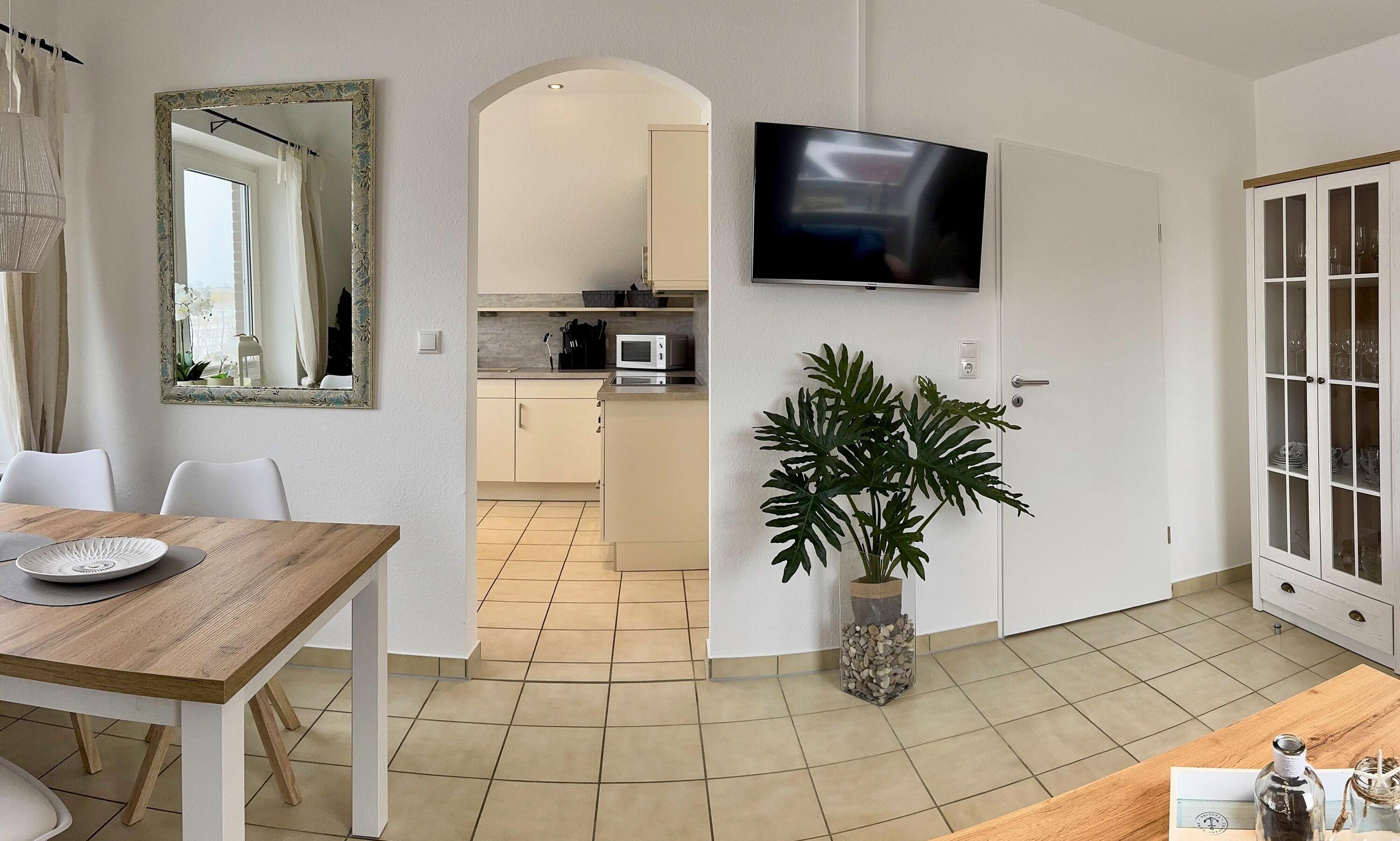 Der großzügige Wohnraum verfügt über eine Polstersitzgruppe mit einem 32" Panasonic Full HD LCD-TV, Internetradio und einem Essplatz für 4 Personen. Die Einbauküche ist komplett ausgestattet mit einem Herd inklusive Cerankochfeld, Mikrowelle, Geschirrspüler, Kühlschrank mit Gefrierfach, Filterkaffeemaschine, Senseo Pad-Maschine, Wasserkocher, Toaster, Eierkocher und vielem mehr. Wer Lust hat im Urlaub zu Backen findet hier Backutensilien.