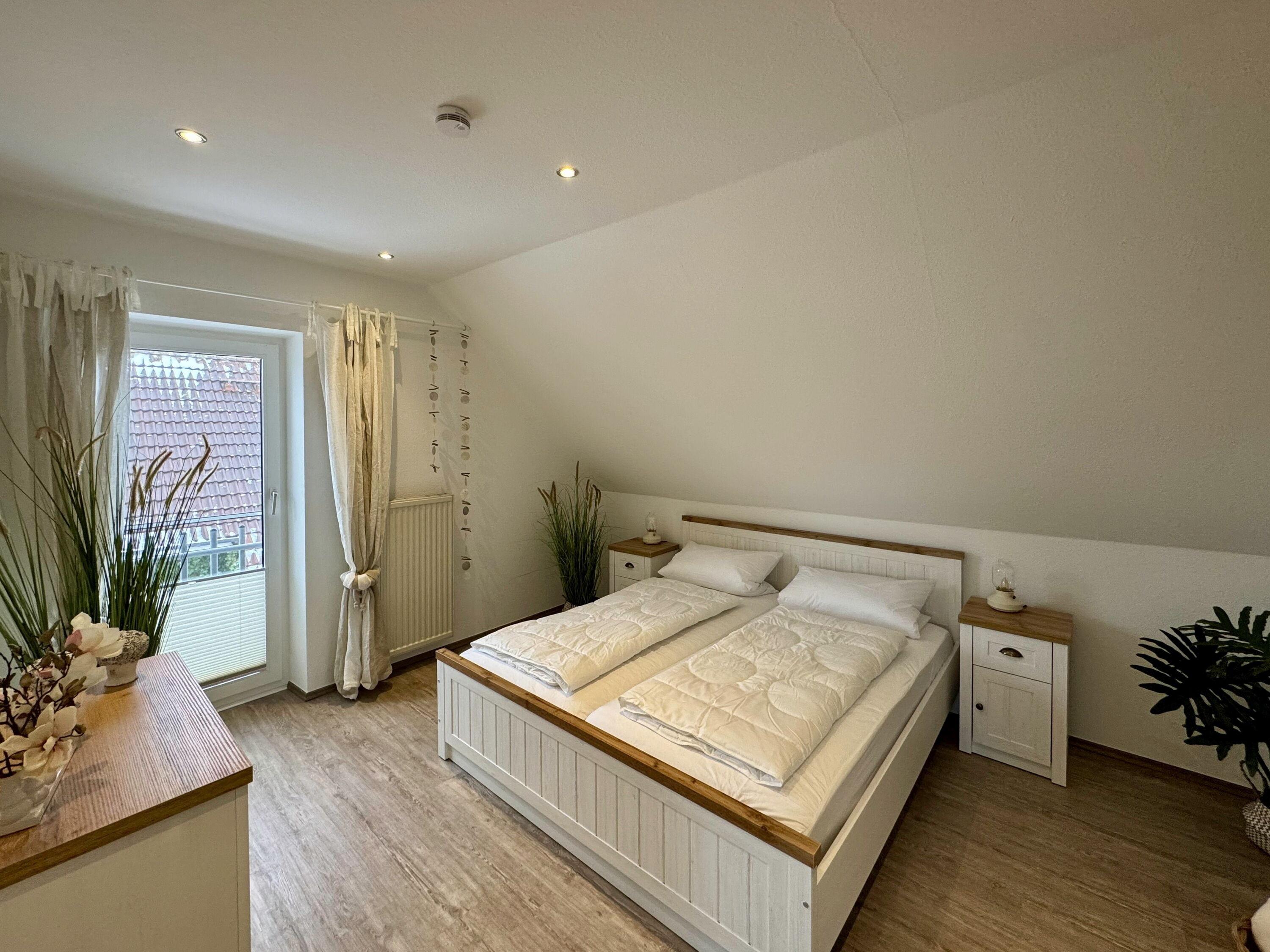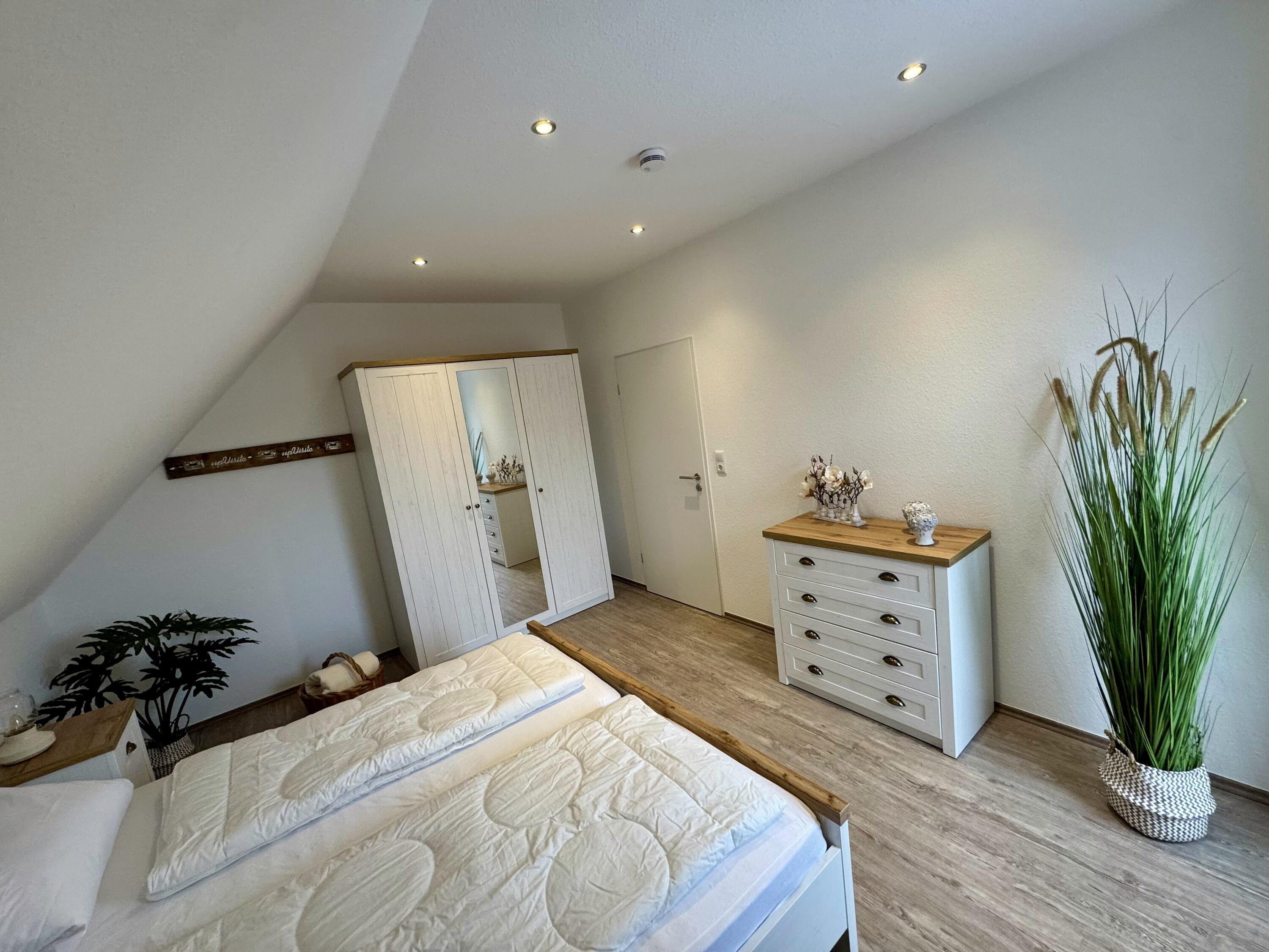 In der Wohnung gibt es zwei Schlafzimmer: eins mit einem Doppelbett, Kommode sowie Kleiderschrank und eins mit einem Einzelbett mit Lattenrost und Kleiderschrank. Im zweiten Schlafzimmer gibt es außerdem einen 26" Sony LCD-TV. Die Diele und das Badezimmer mit einer tiefgelegten Badewanne, die auch zum Duschen genutzt werden kann, bietet ausreichend Platz und eine behagliche Atmosphäre. Ein Föhn ist vorhanden. Bügelbrett, Bügeleisen und ein Wäscheständer stehen ebenfalls zur Verfügung. An den Fenstern befinden sich Insektenschutzgitter.