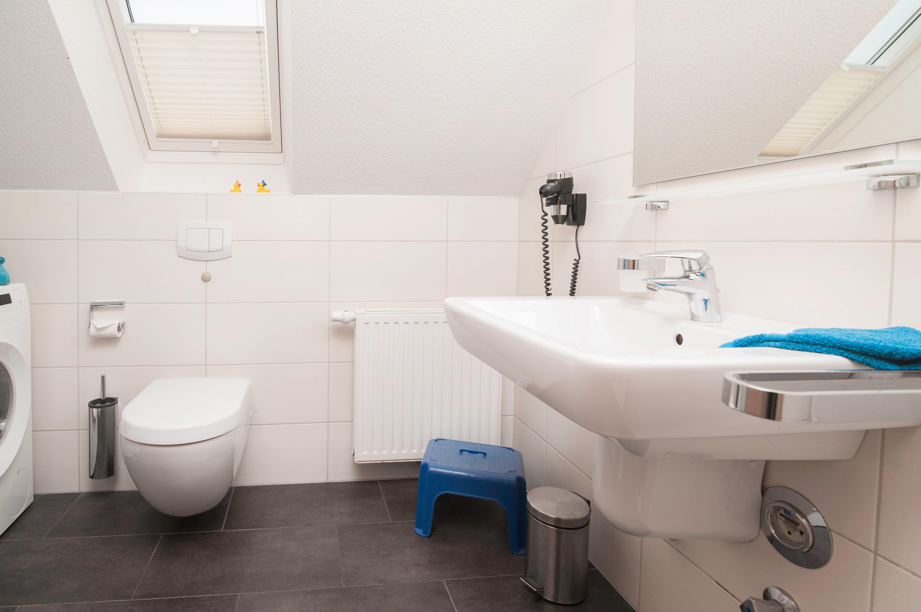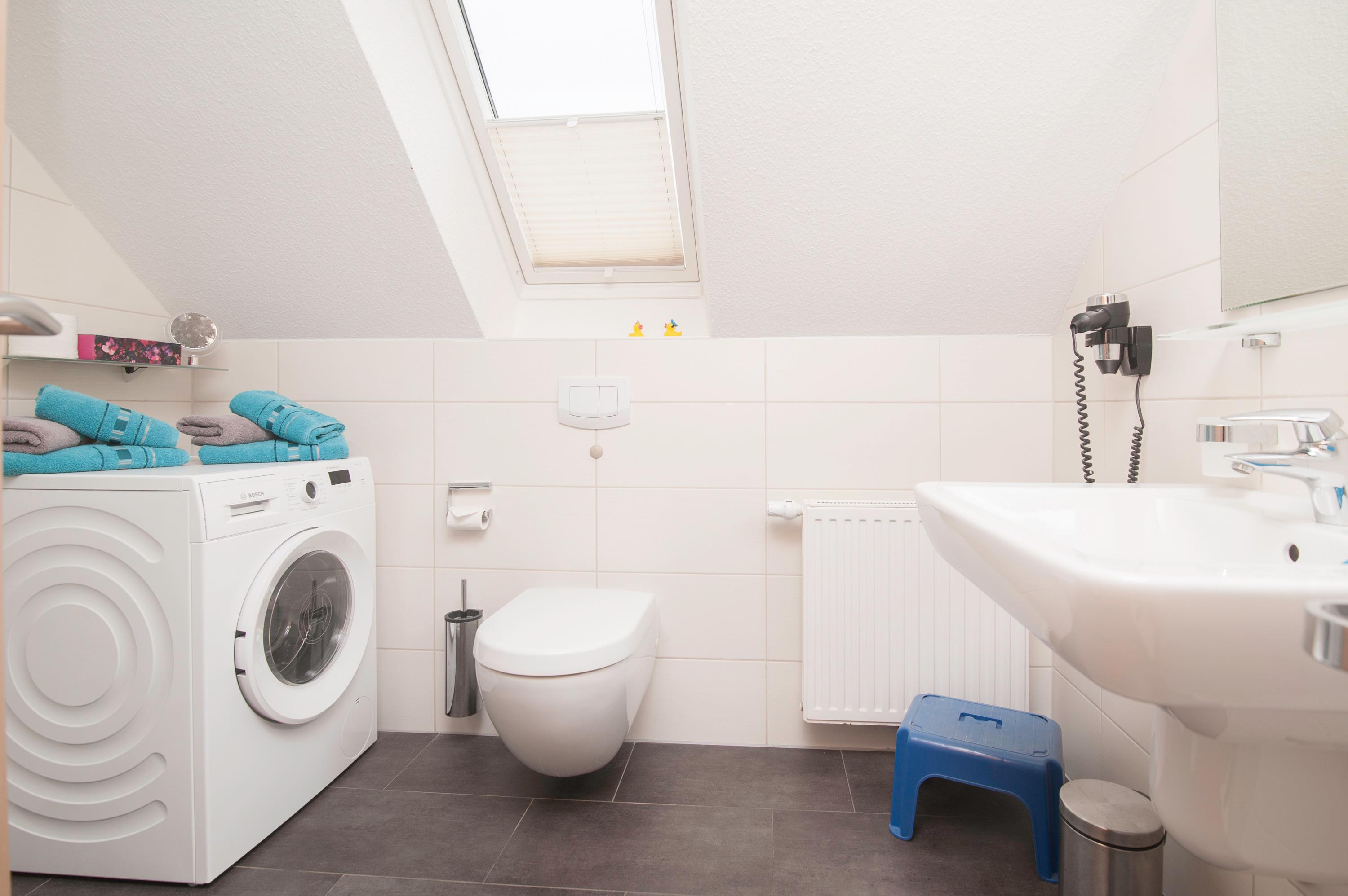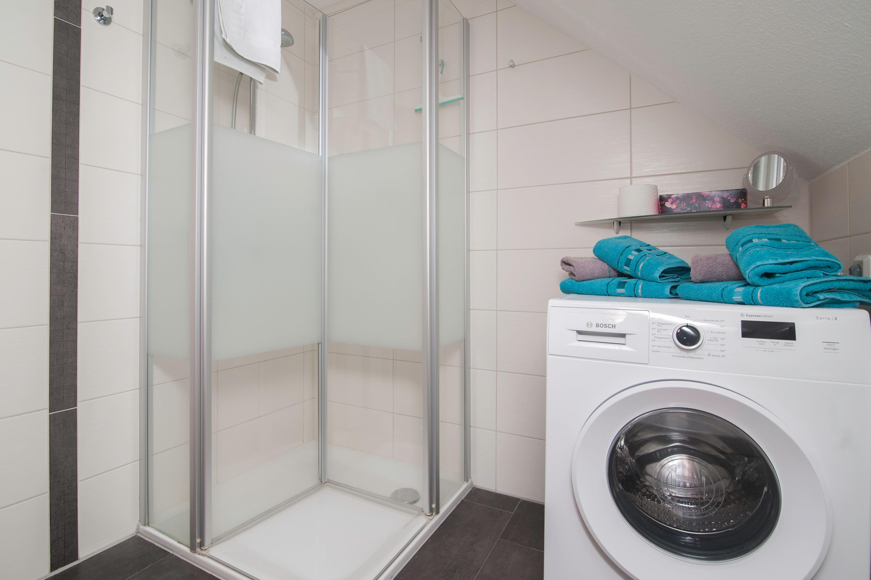 Das Tageslichtbad verfügt über Glasduschkabine mit flachem Einstieg und einem Hänge-WC. Eine Waschmaschine (7 kg) steht kostenlos zur Verfügung. Ein fest installierter Föhn ist ebenfalls vorhanden.