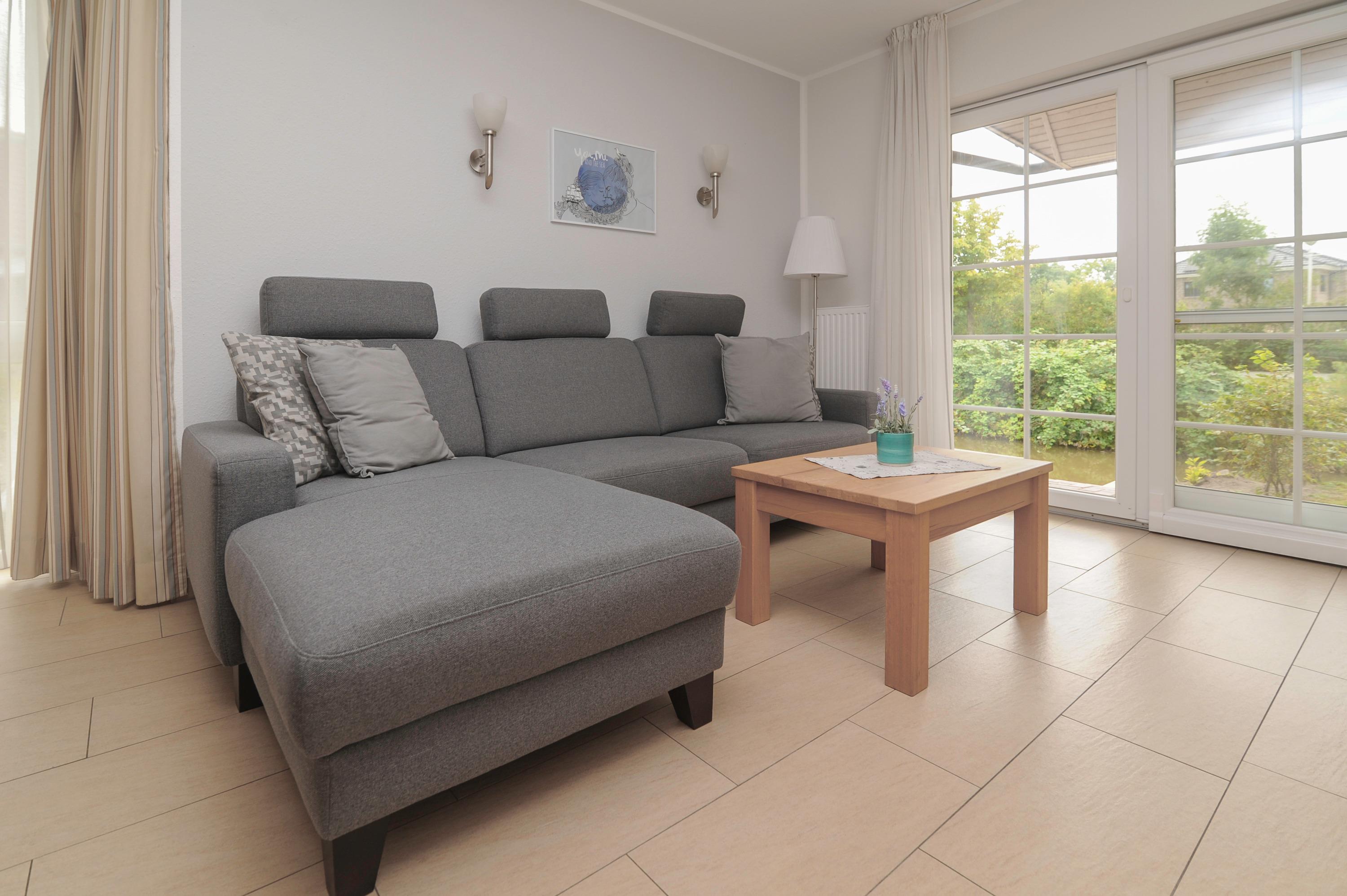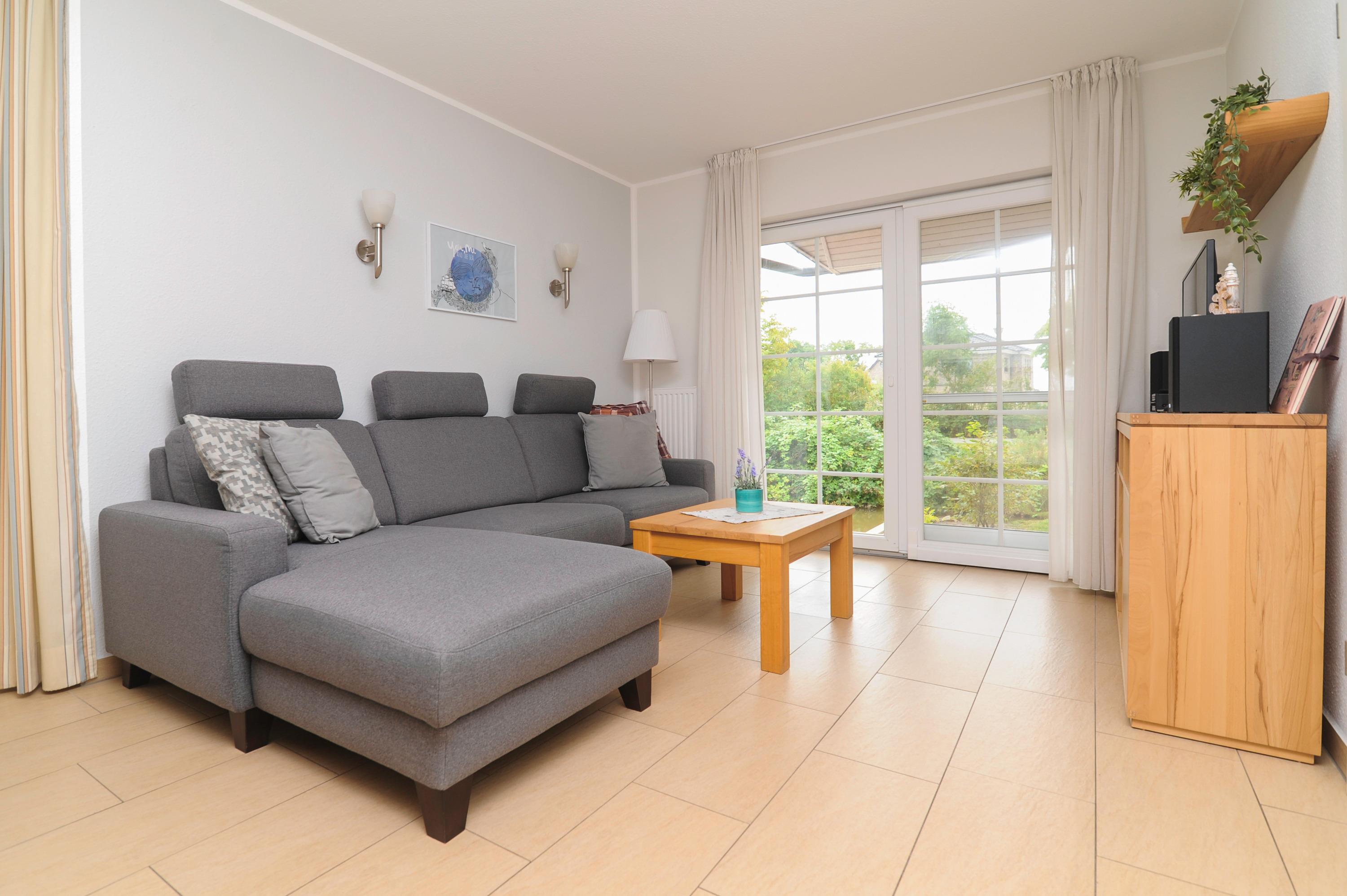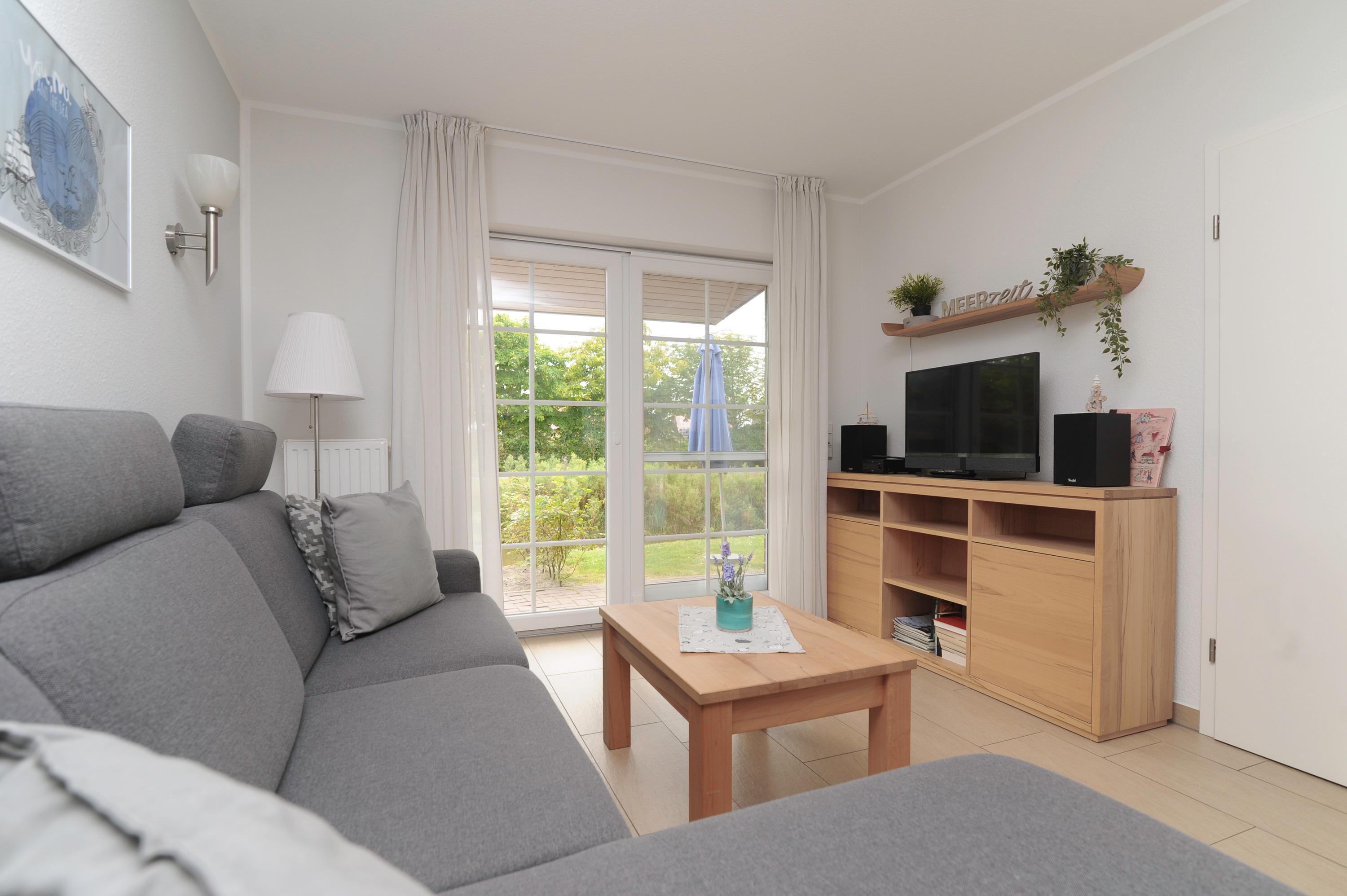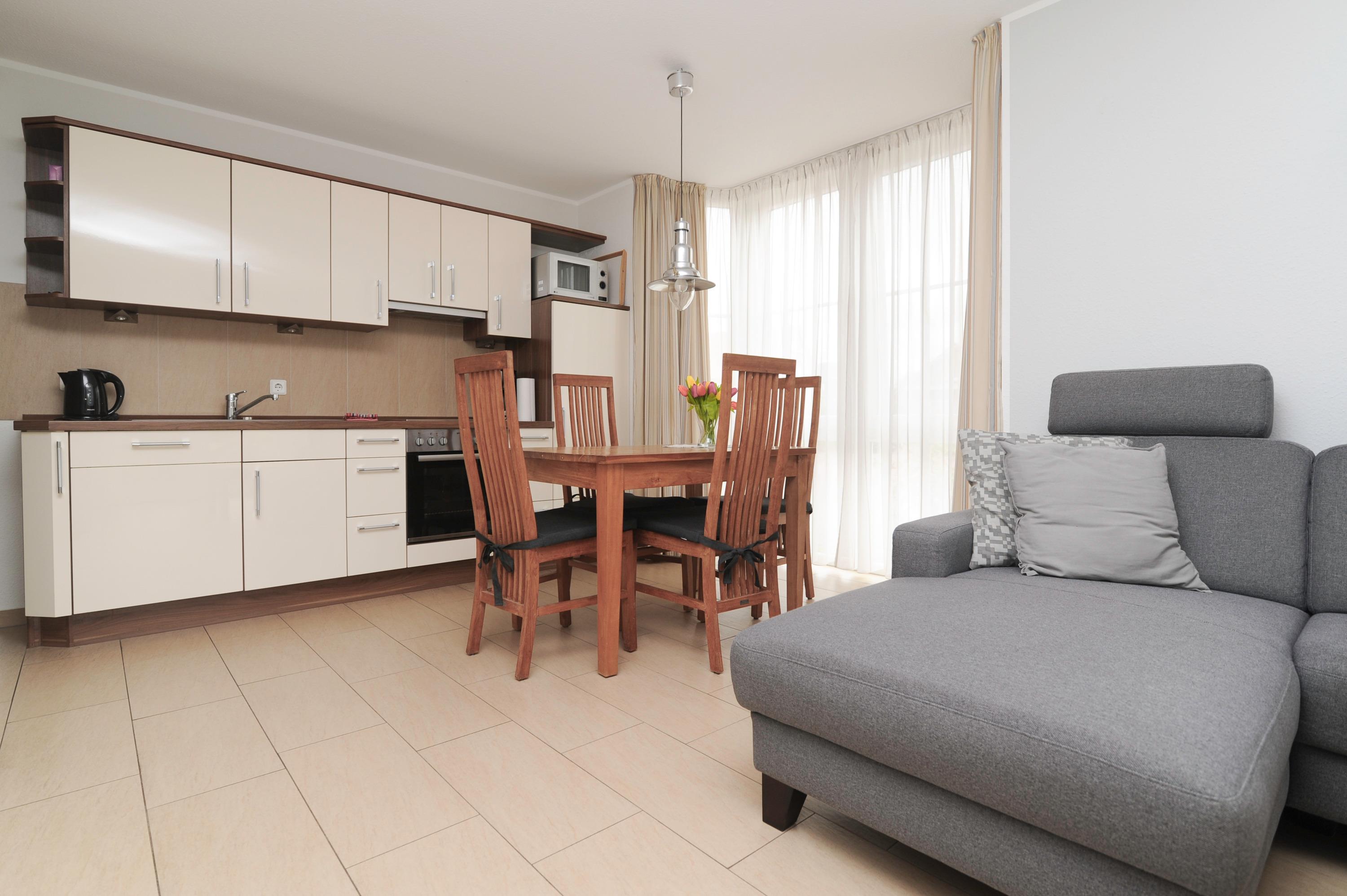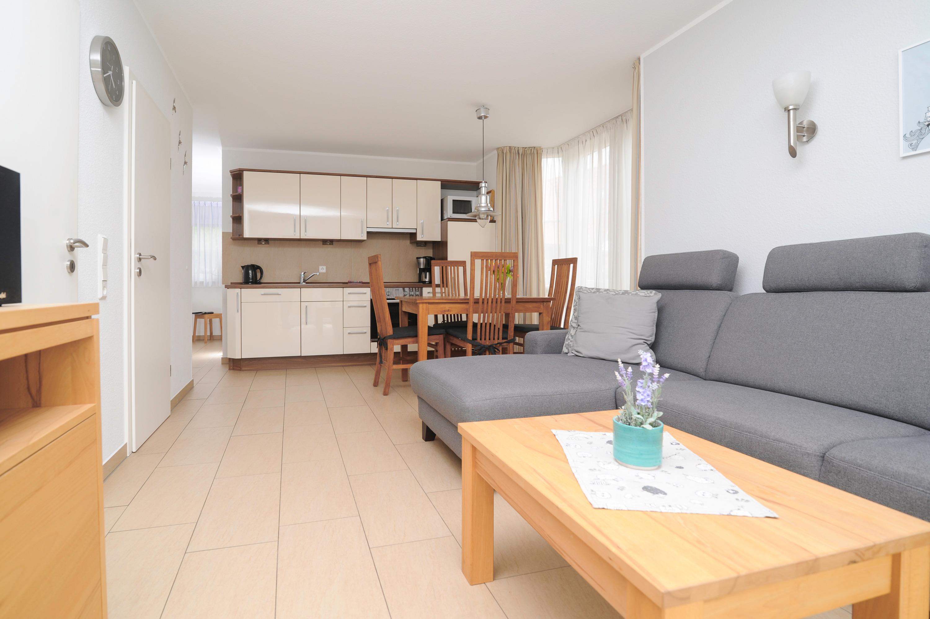 Der moderne Wohnraum ist mit einem 32"Metz LCD-TV, internetfähiges Radio mit Bluetooth-Funktion, DSL WLAN-Gastzugang, Polstersitzgruppe und einem Essplatz für 4 Personen eingerichtet. Für einen besonderen Komfort sorgt die Fußbodenerwärmung im offenen Wohn- Essbereich. Die Einbauküche ist in den Wohnraum integriert und gut ausgestattet, u.a. mit Herd und Cerankochfeld, Geschirrspüler, Mikrowelle, Kühlschrank (ohne Gefrierfach), Filterkaffeemaschine und vielem mehr...