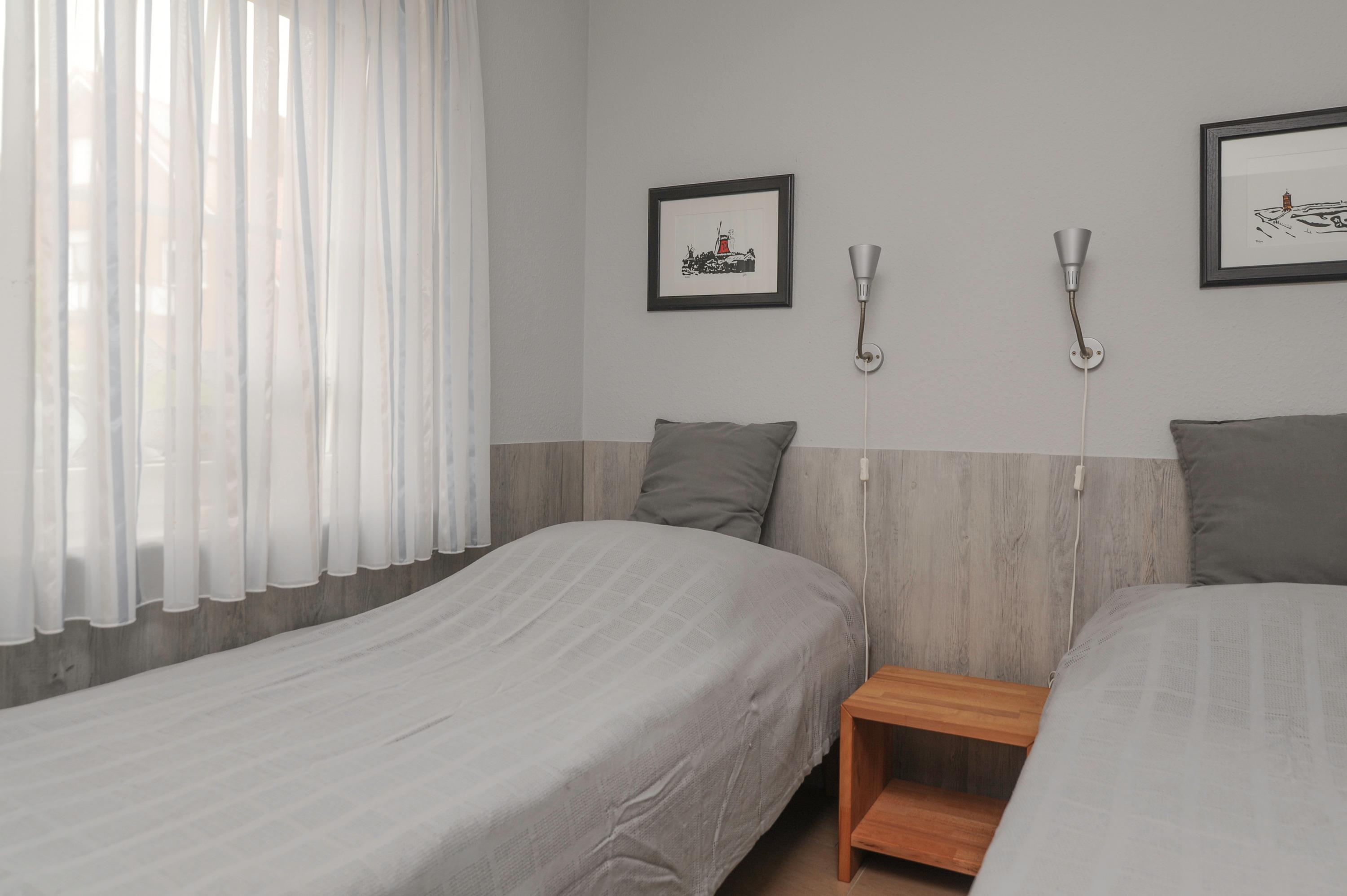 2 Schlafräume: einmal mit einem Doppelbett (160 x 200 cm) und einmal mit zwei Einzelbetten (90 x 200 cm). Bad mit Dusche, WC, Föhn, Waschtisch, Waschmaschine (7 kg) und Wäscheständer. Alle Räume sind gefliest. Vor den Fenstern befinden sich Insektenschutzgitter.