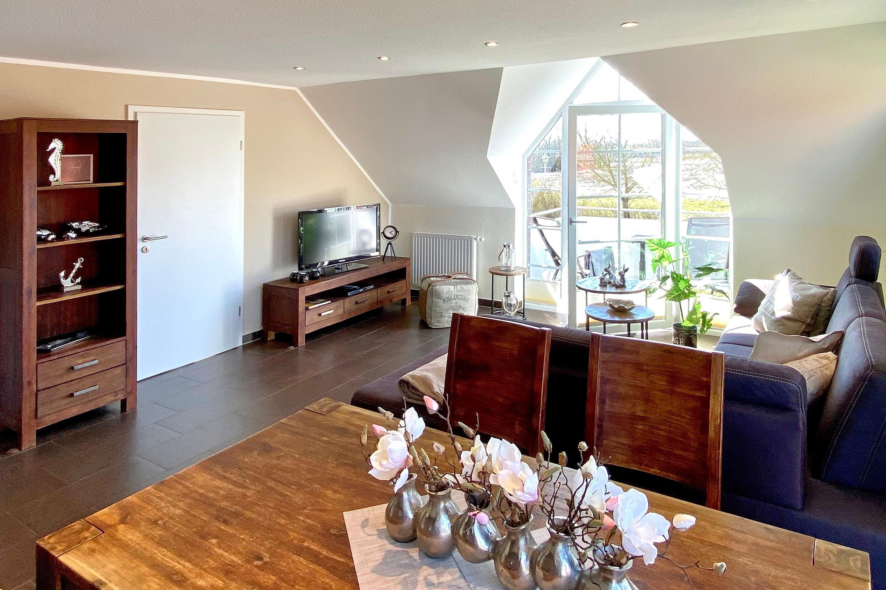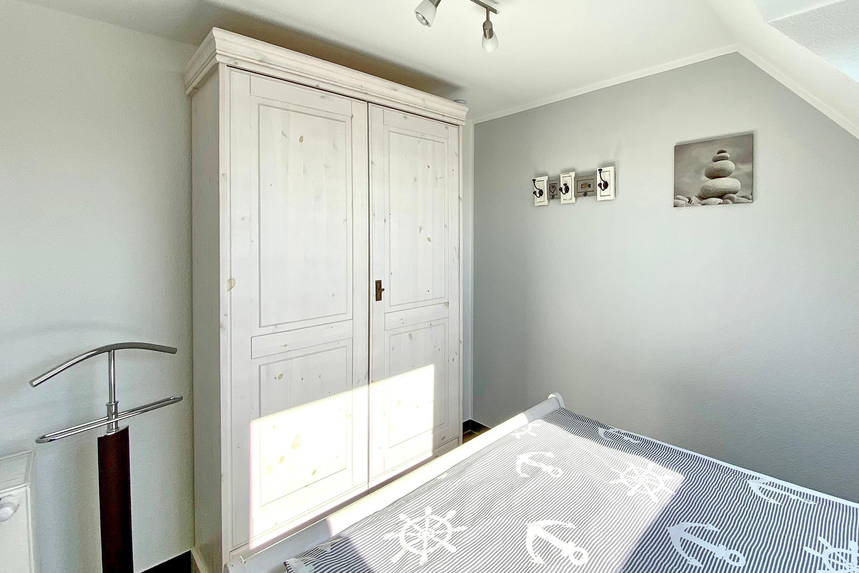 Es gibt ein Schlafzimmer mit einem Doppelbett (Matratzengröße 140 x 200 cm) Kleiderschrank und ein weiteres Schlafzimmer im großzügigen Studio unterm Dach mit einem Doppelbett (Matratzen je 90 x 200 cm ), einer Kommode und einem zweiten TV-Gerät. In beiden Schlafzimmern sind Verdunklungsplissees vorhanden.