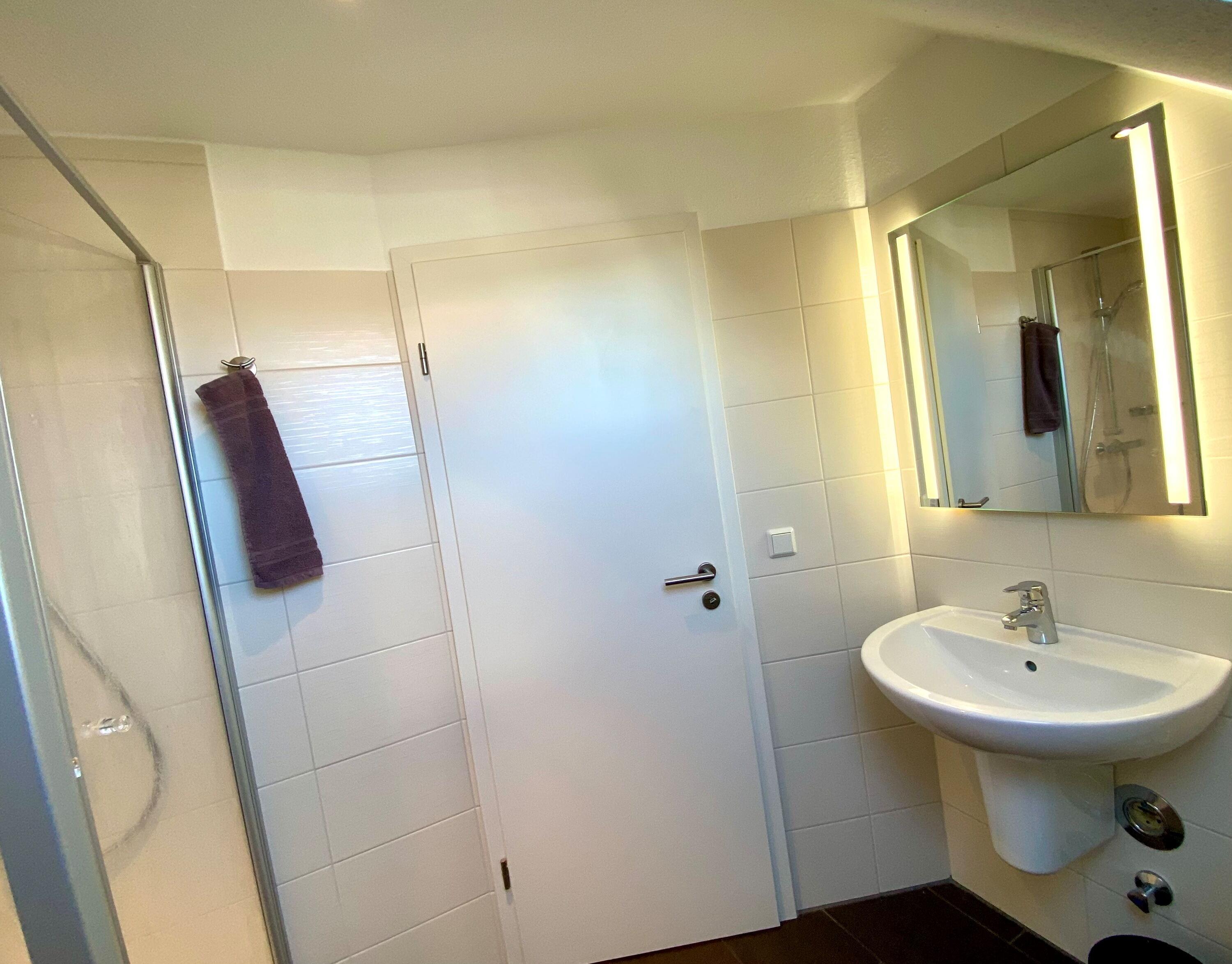 Die Wohnung verfügt über zwei Bäder mit Fußbodenheizung. Das erste Bad ist ausgestattet mit einer Eckbadewanne, einem Bidet, WC und Waschtisch. Das zweite Bad verfügt über eine Dusche, WC und Waschtisch. Eine Waschmaschine und ein Trockner sind ebenfalls vorhanden. Für Fahrräder steht ein separater Abstellraum zur Verfügung und ein PKW-Stellplatz befindet sich direkt am Haus. Bettwäsche und Handtücher werden auf Wunsch gegen Entgelt gestellt.