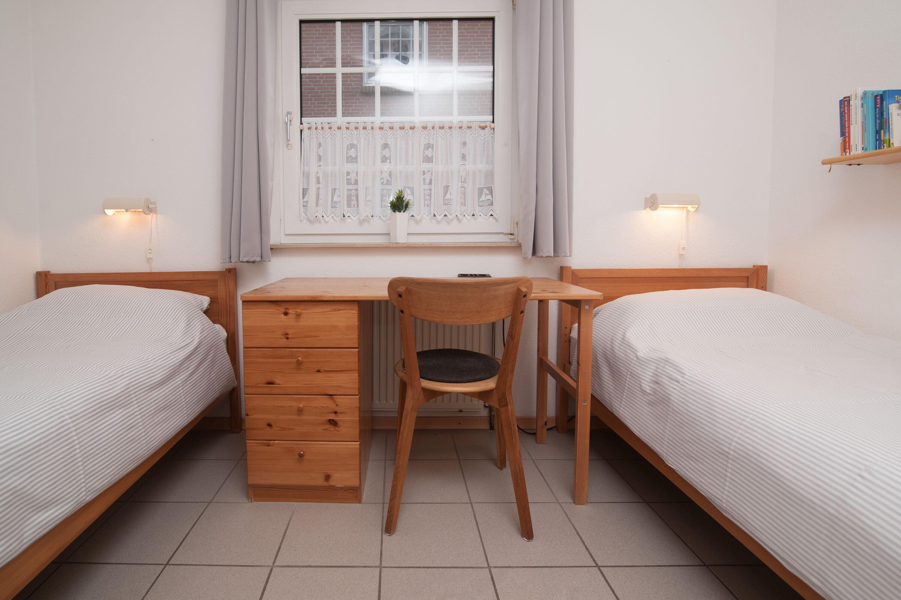 2 Schlafräume: Ein Schlafzimmer mit Doppelbett (2 x 90 x 200cm), zweites Schlafzimmer mit 2 Einzelbetten (90 x 200cm) und Schreibtisch.