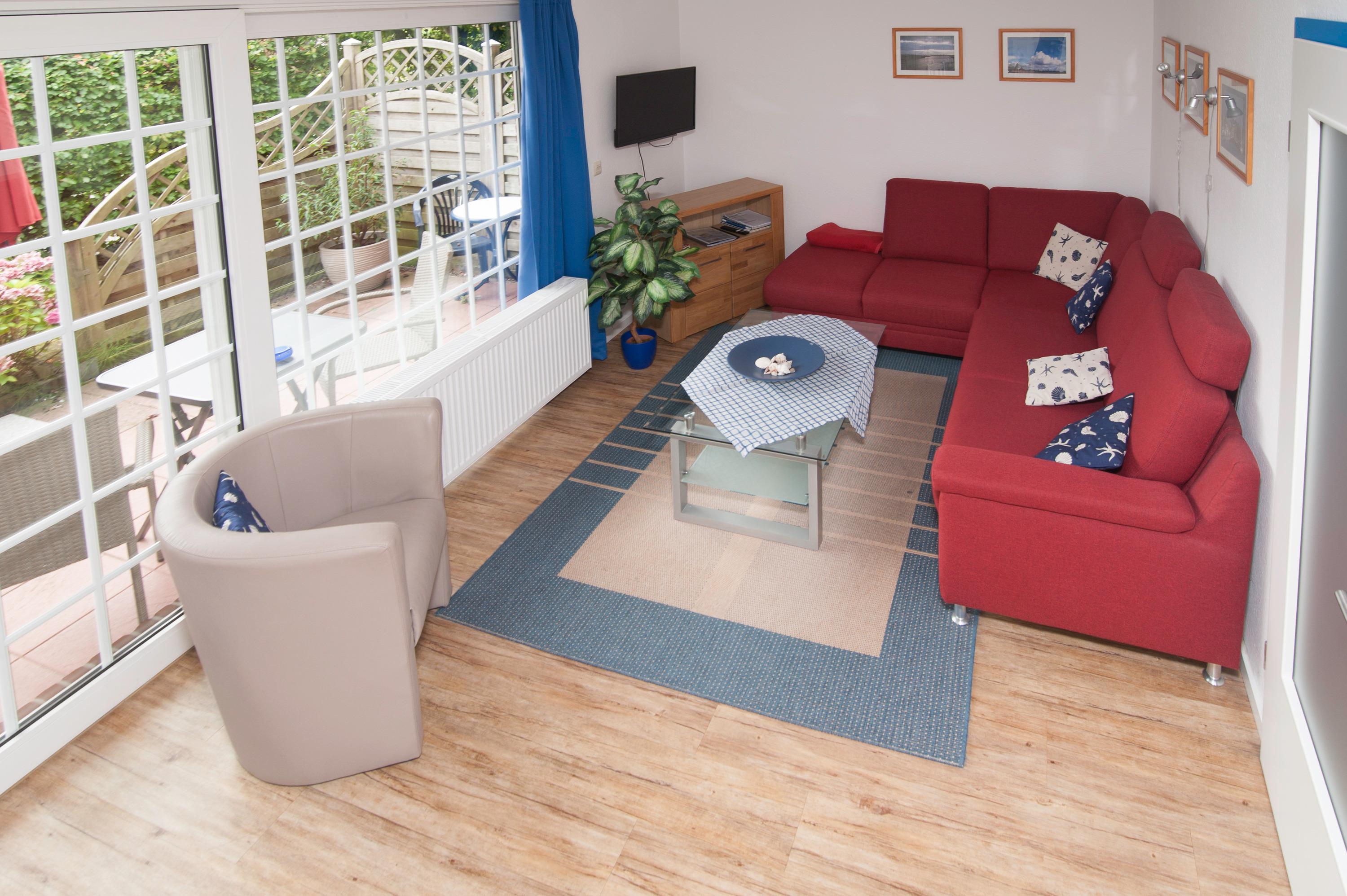 Ein großzügiges und helles Wohnzimmer mit bequemem Ecksofa lassen den Tag bei einem gemütlichen Fernsehabend ausklingen. Es gibt außerdem einen Essplatz neben der Einbauküche, die mit einem Geschirrspüler, Induktionskochfeld, Mikrowelle, Kühlschrank mit Gefrierfach, Filterkaffeemaschine, Toaster, Wasserkocher und weiteren Küchenutensilien keine Wünsche offen lässt. Vom Wohnzimmer aus gelangen Sie direkt auf die eigene Terrasse mit Sitzmöbeln - kurze Wege für einen nachmittags Tee auf der Terrasse.