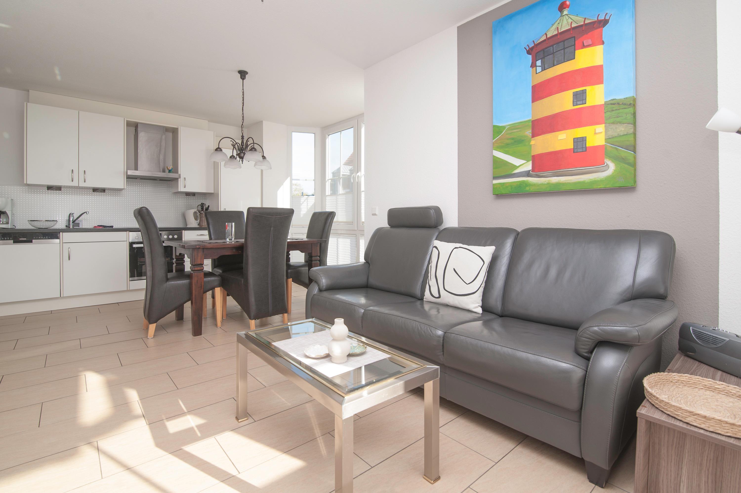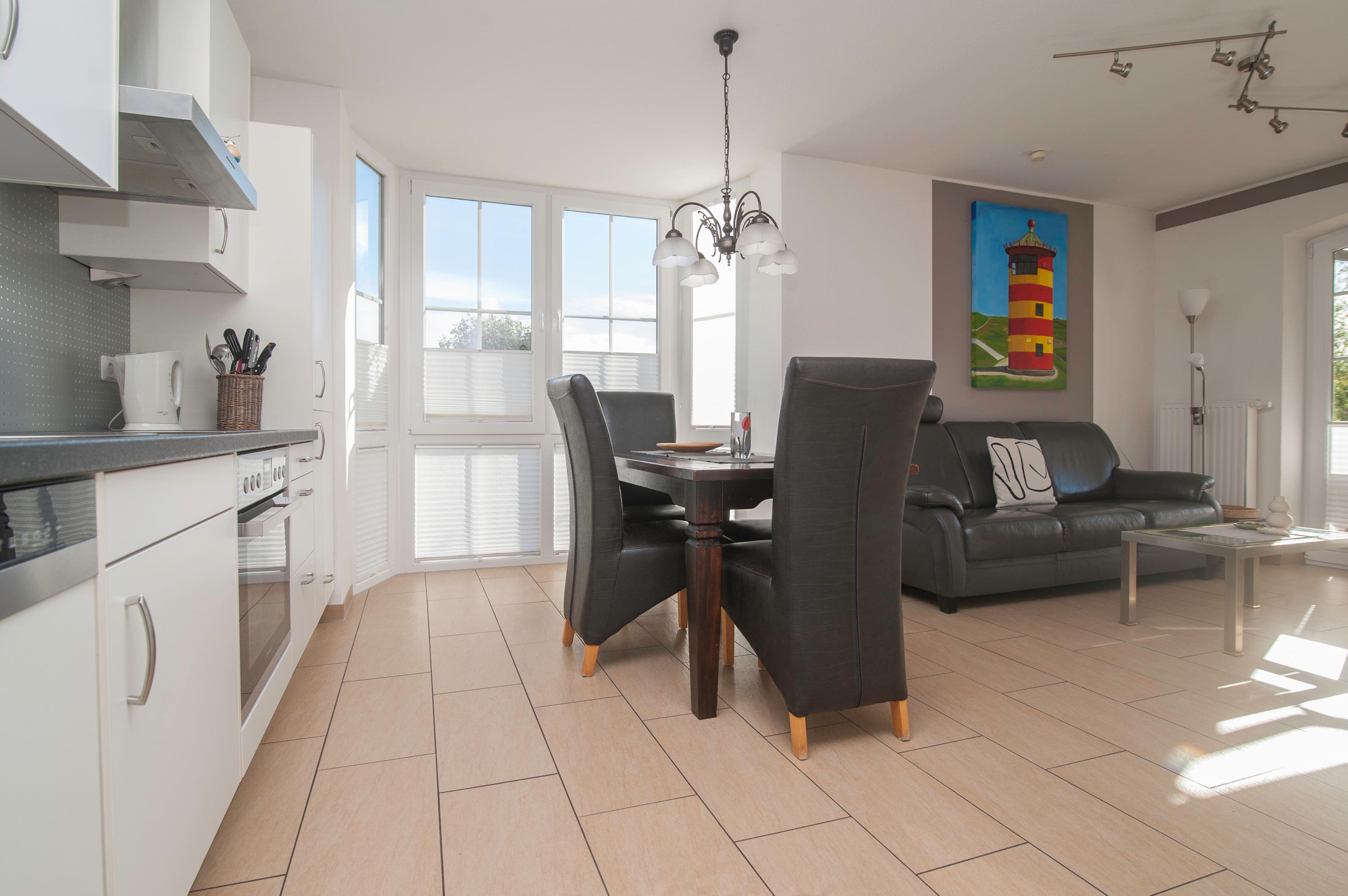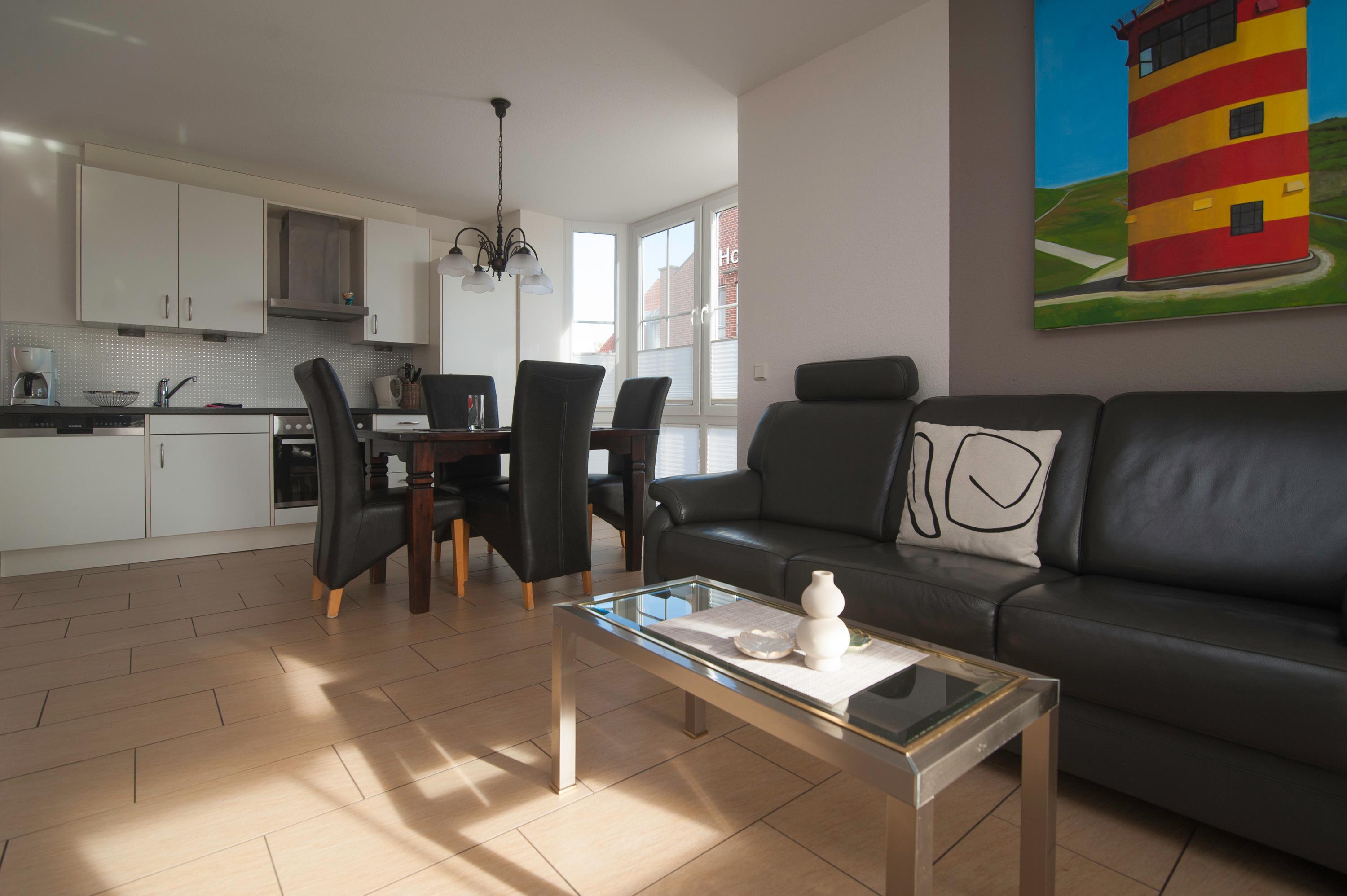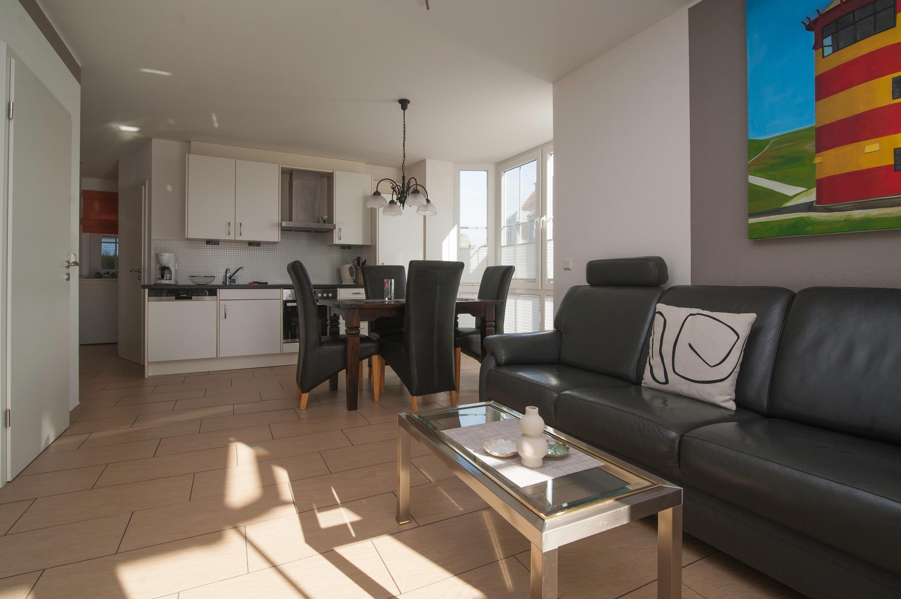 Der Wohnraum ist besonders schön und modern gestaltet und verfügt über einen 37"Metz LCD-TV, DSL WLAN und eine gemütliche Ledersitzgruppe. In einem lichtdurchfluteten Erker befindet sich außerdem ein Essplatz. Die Einbauküche ist in den Wohnraum integriert und ist komplett ausgestattet mit Herd, Cerankochfeld, Kühlschrank mit Gefrierfach, Geschirrspüler, Filterkaffeemaschine und mehr.