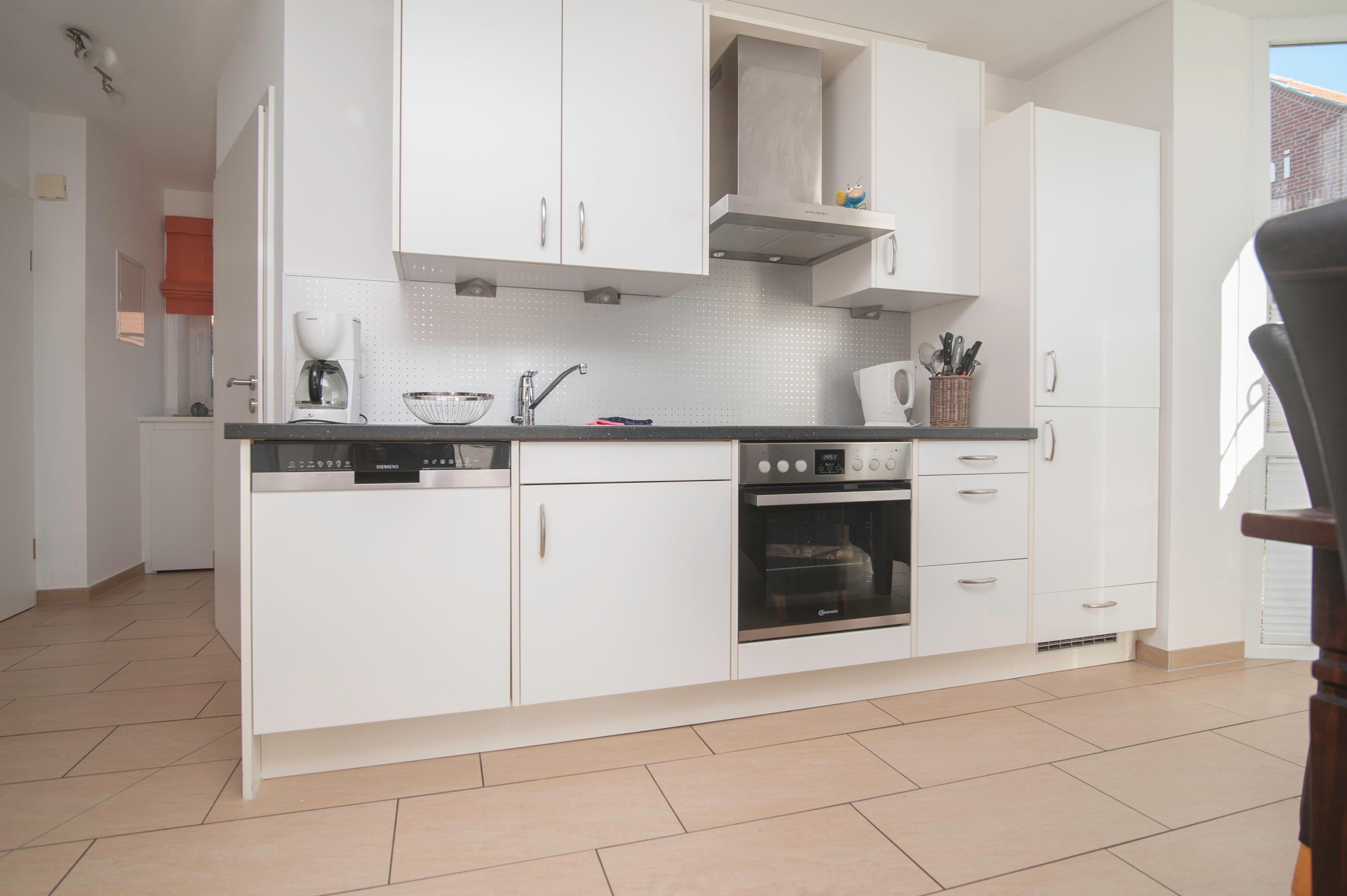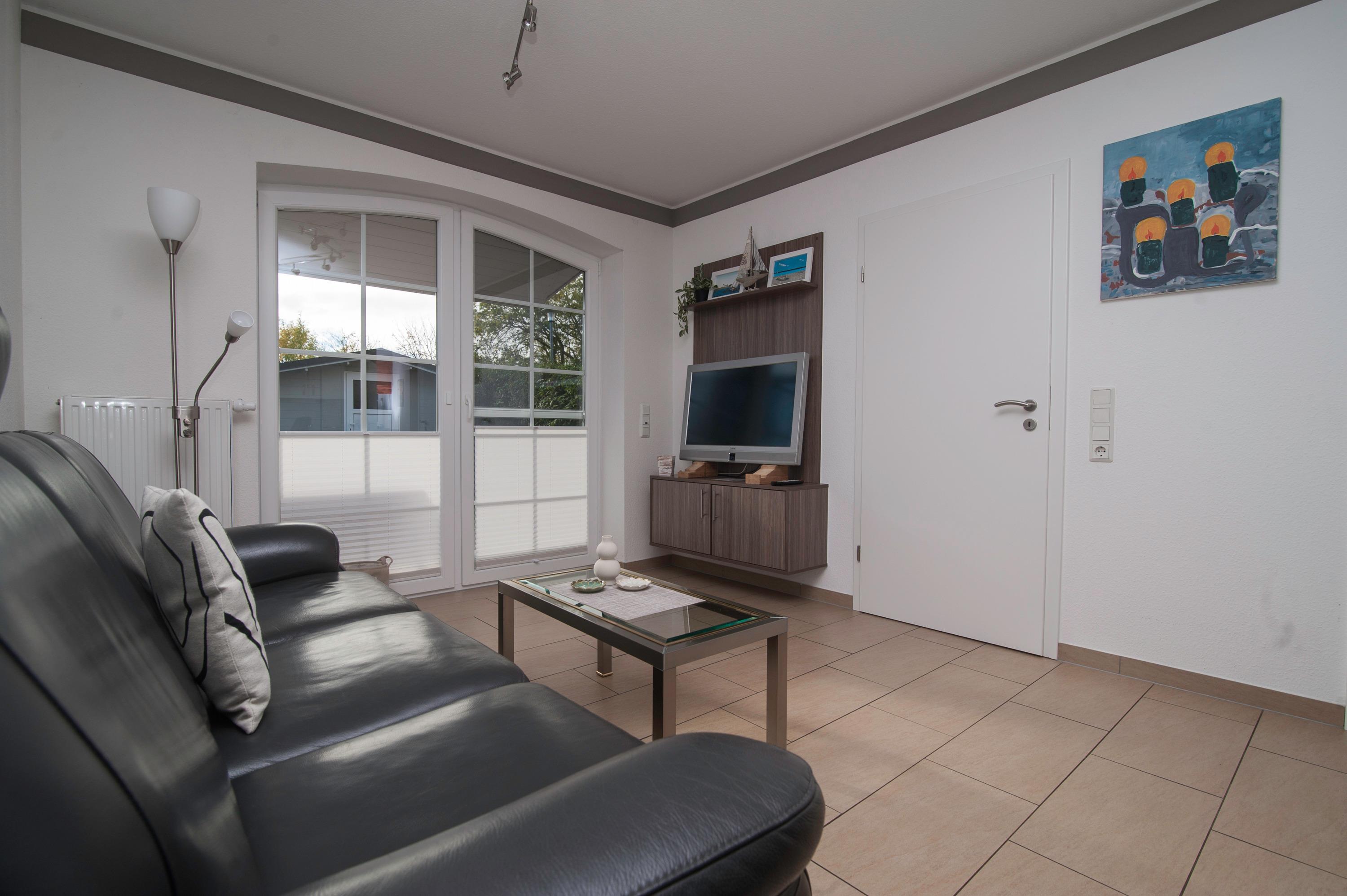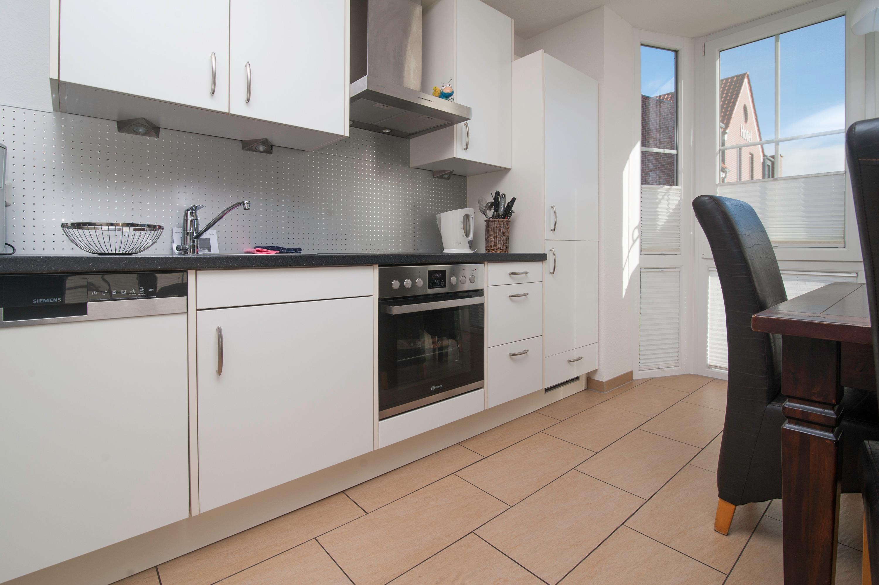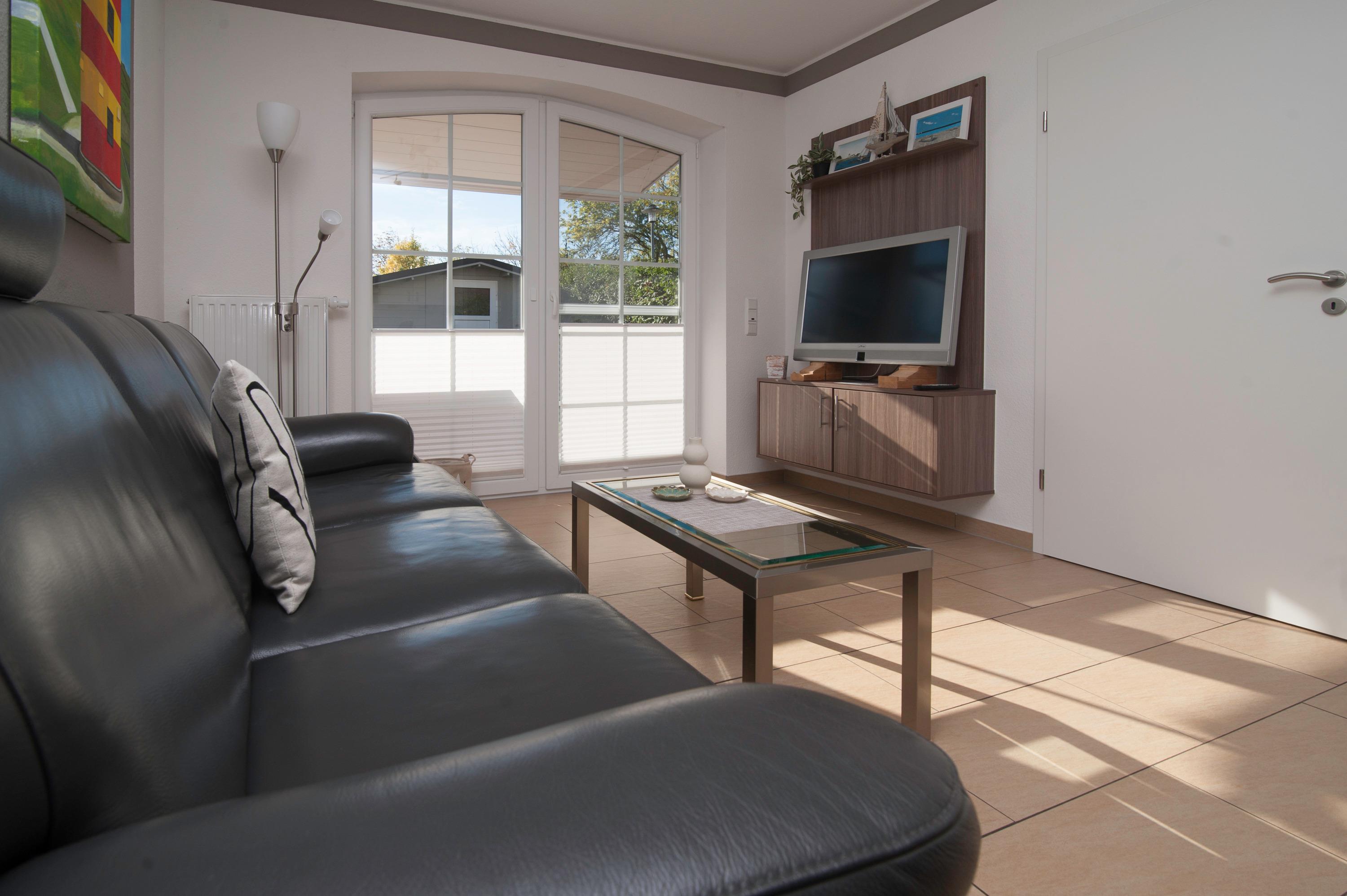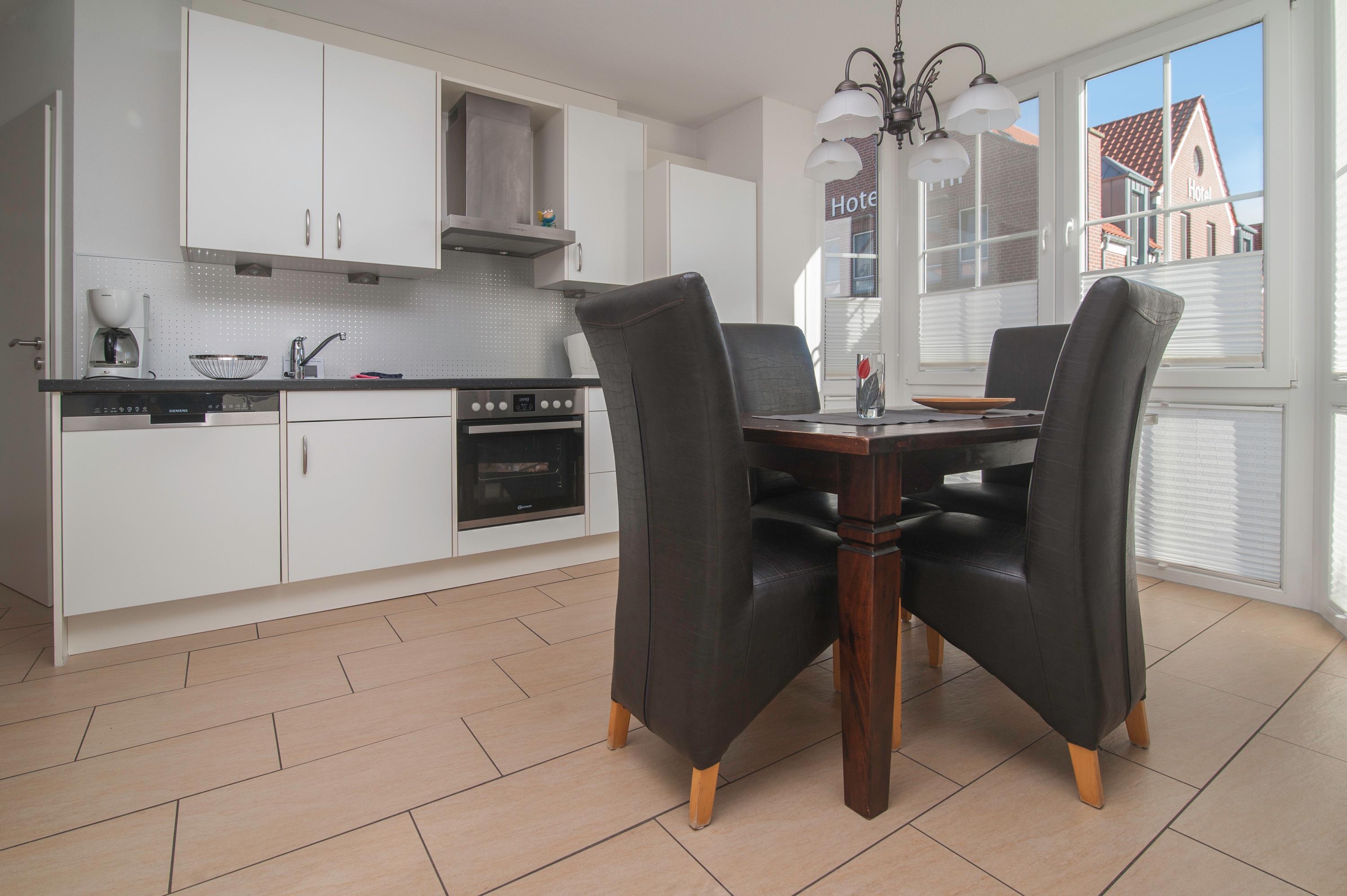 Der Wohnraum ist besonders schön und modern gestaltet und verfügt über einen 37"Metz LCD-TV, DSL WLAN und eine gemütliche Ledersitzgruppe. In einem lichtdurchfluteten Erker befindet sich außerdem ein Essplatz. Die Einbauküche ist in den Wohnraum integriert und ist komplett ausgestattet mit Herd, Cerankochfeld, Kühlschrank mit Gefrierfach, Geschirrspüler, Filterkaffeemaschine und mehr.
