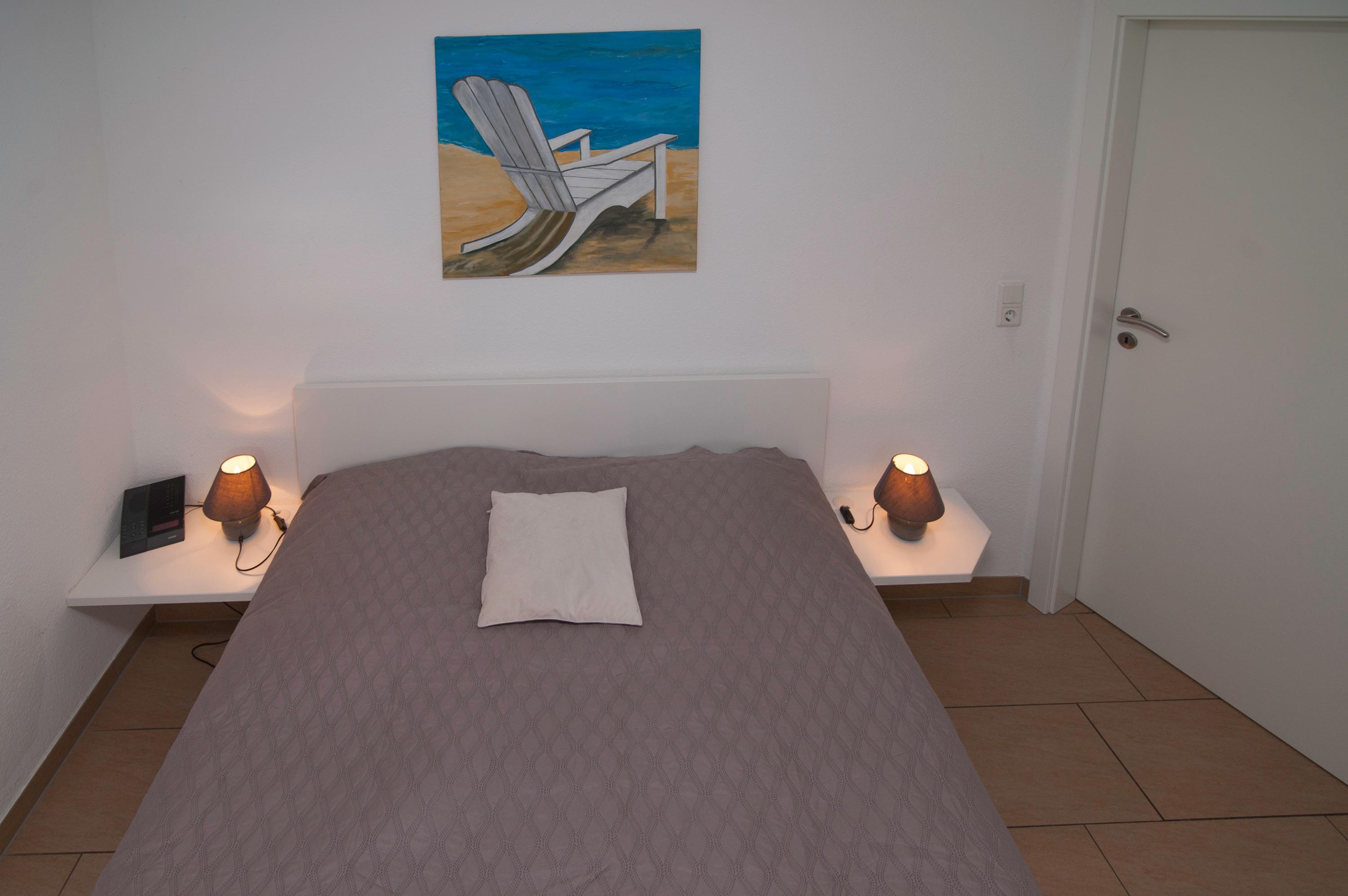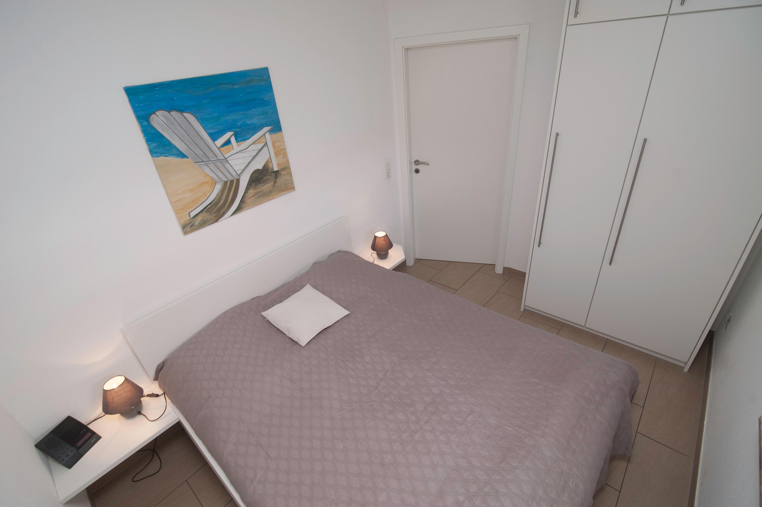 Die Ferienwohnung verfügt über zwei Schlafzimmer, eines mit einem Doppelbett (160 x 200 cm) und manuell verstellbaren Lattenrosten und das andere mit einem Einzelbett (100 x 200 cm) und einem elektrisch verstellbaren Lattenrost. Das barrierefreie Badezimmer ist mit einer ebenerdigen Dusche, WC und Waschtisch ausgestattet. Alle Räume sind gefliest und im Flur, Wohn- und Essbereich sorgt die Fußbodenerwärmung für einen besonderen Komfort. Vor den Fenstern befinden sich Insektenschutzgitter.