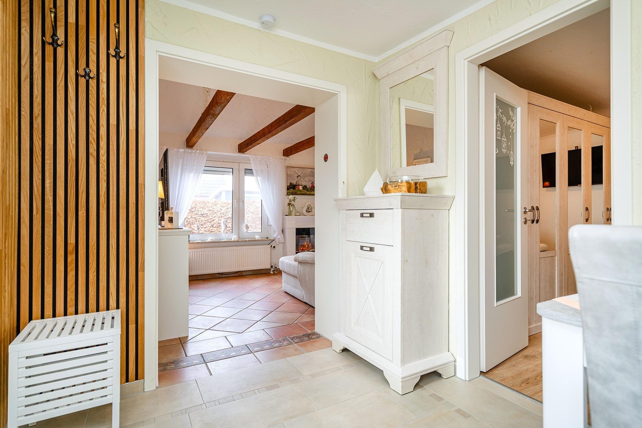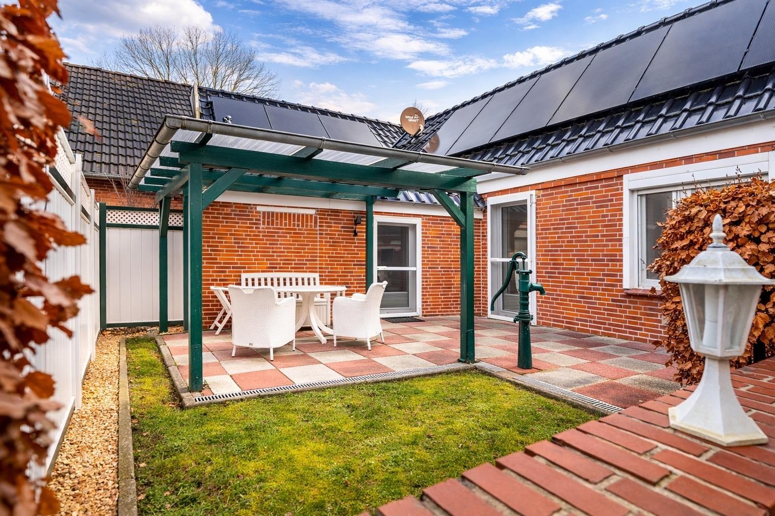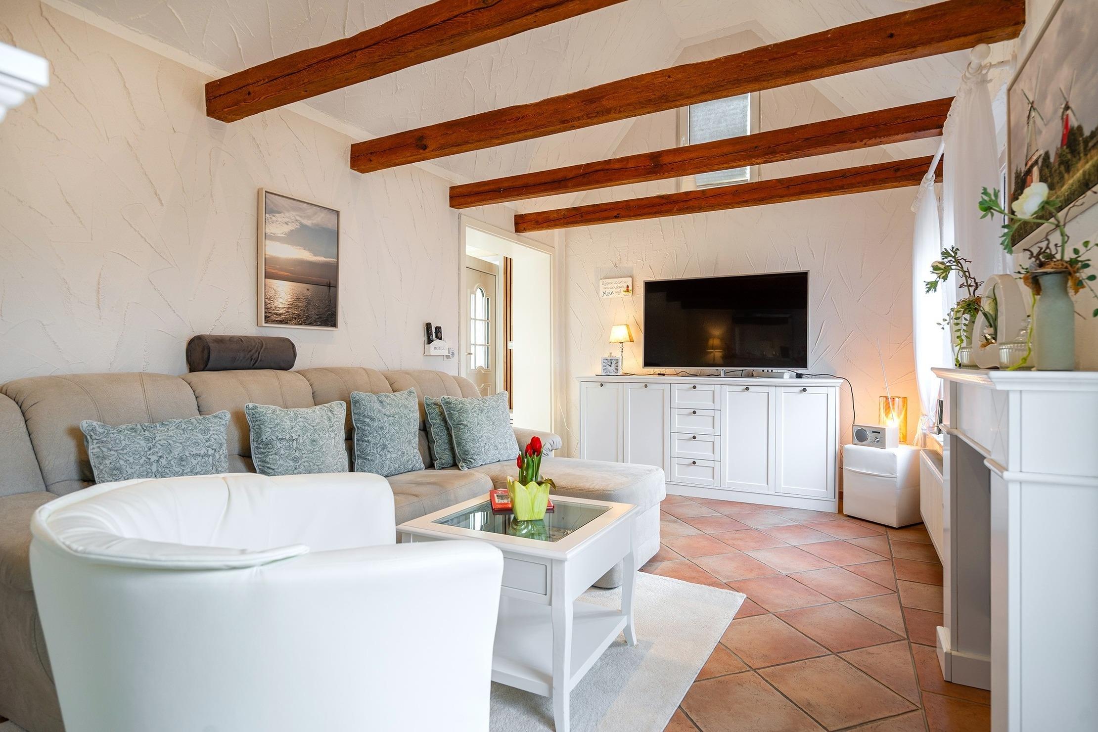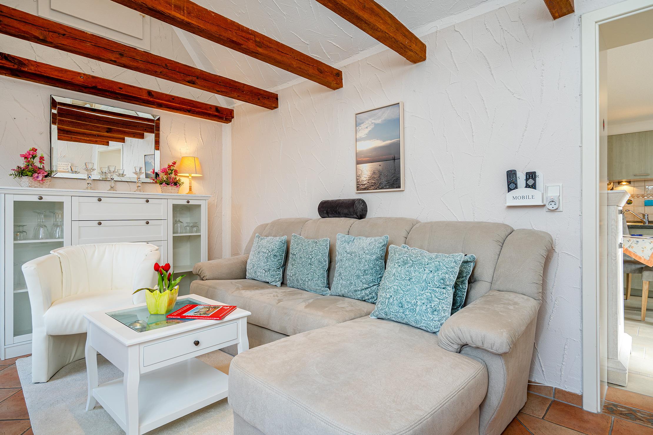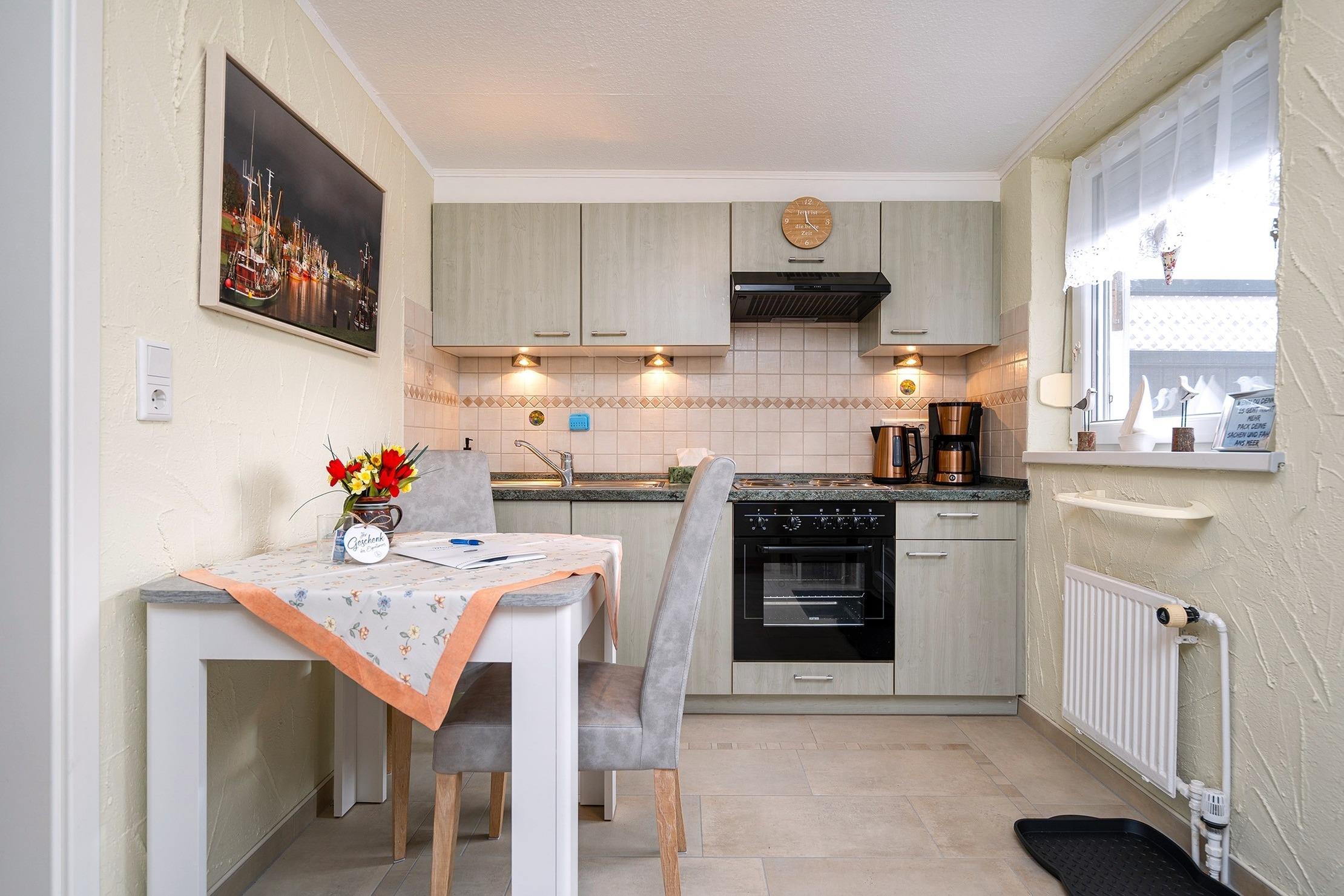 Die Ferienwohnung "Emskate" in Greetsiel überzeugt nicht nur durch ihre gemütliche und traditionelle Ausstattung, sondern vor allem durch ihre besonders attraktive Lage. In der Edzard-Cirksena-Straße 24, ruhig und dennoch zentral gelegen, erreichen Sie den historischen Ortskern mit den bekannten Zwillingsmühlen und seinen charakteristischen Gassen, kleinen Geschäften und gemütlichen Cafés bequem in wenigen Minuten.[nbsp] Die Wohnung selbst befindet sich im Erdgeschoss, ist für zwei Personen ausgelegt und traditionell ostfriesisch und mit viel Liebe zum Detail eingerichtet. Die Holzbalken an der Decke strahlen eine warme und behagliche Atmosphäre aus. Der helle Wohnbereich mit großem Sofa und Blick ins Grüne lädt zum Entspannen ein, während die abgeschlossene Küche ausreichend Platz und Ausstattung für gemeinsame Kochmomente bietet. Das großzügige Tageslichtbad sorgt für eine angenehme Atmosphäre. Im separaten Schlafzimmer erwartet Sie ein komfortables Boxspringbett. Ein weiteres Highlight ist der Außenbereich mit der goßen und teilweise überdachten Terrasse sowie einer Rasenfläche. Hier genießen Sie Privatsphäre und Ruhe – perfekt für ein Frühstück im Freien oder entspannte Stunden an der frischen Nordseeluft. Auch ein Fahrradabstellraum sowie ein reservierter und überdachter Parkplatz direkt vor der Wohnung stehen zur Verfügung. Die Ferienwohnung "Emskate" verbindet eine hervorragende, ruhige und dennoch zentrale Lage mit traditionellem ostfriesischem Charme – die ideale Kombination für eine erholsame Auszeit an der Küste.