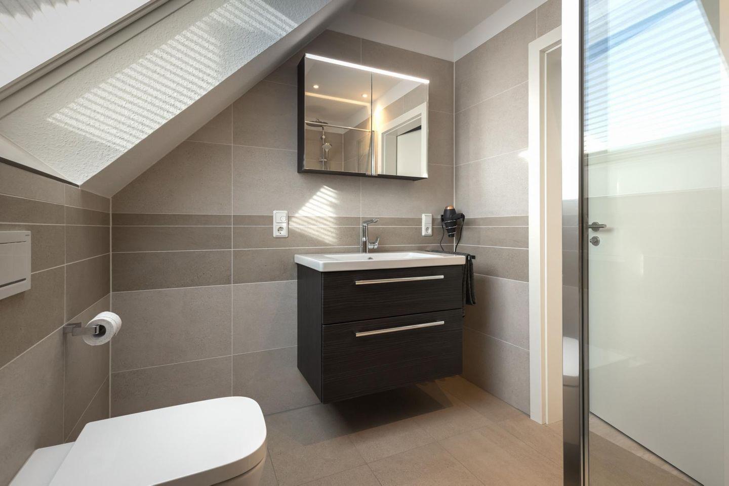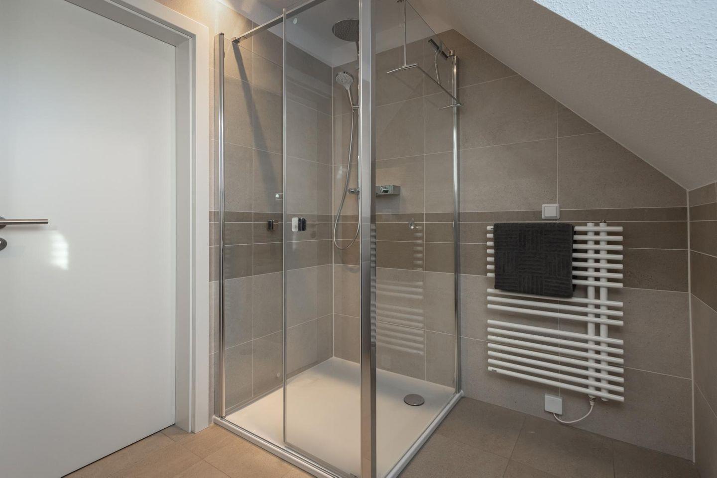 Weiterhin findet sich auf der OG-Ebene ein Schlafzimmer mit Doppelbett, Kleiderschrank und ein HD-TV. Direkt neben an befindet sich das trendige Bad mit verglaster Duschkabine, Handtuchheizkörper sowie Fön.