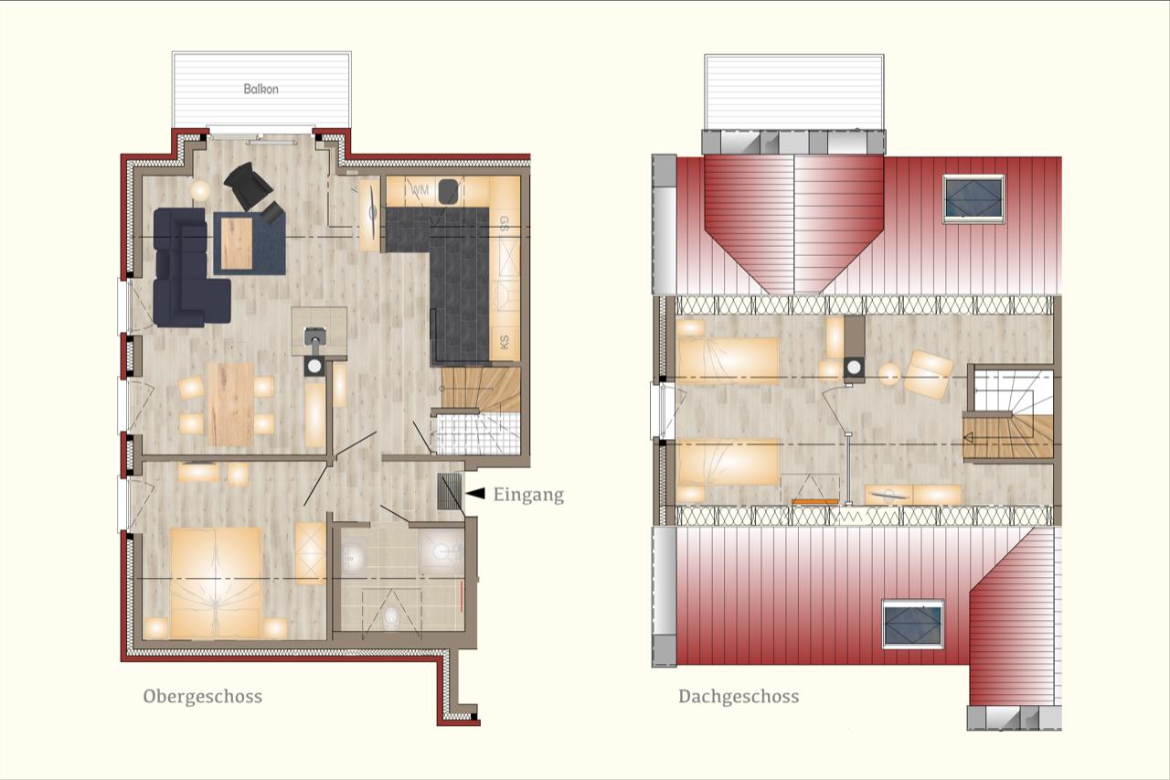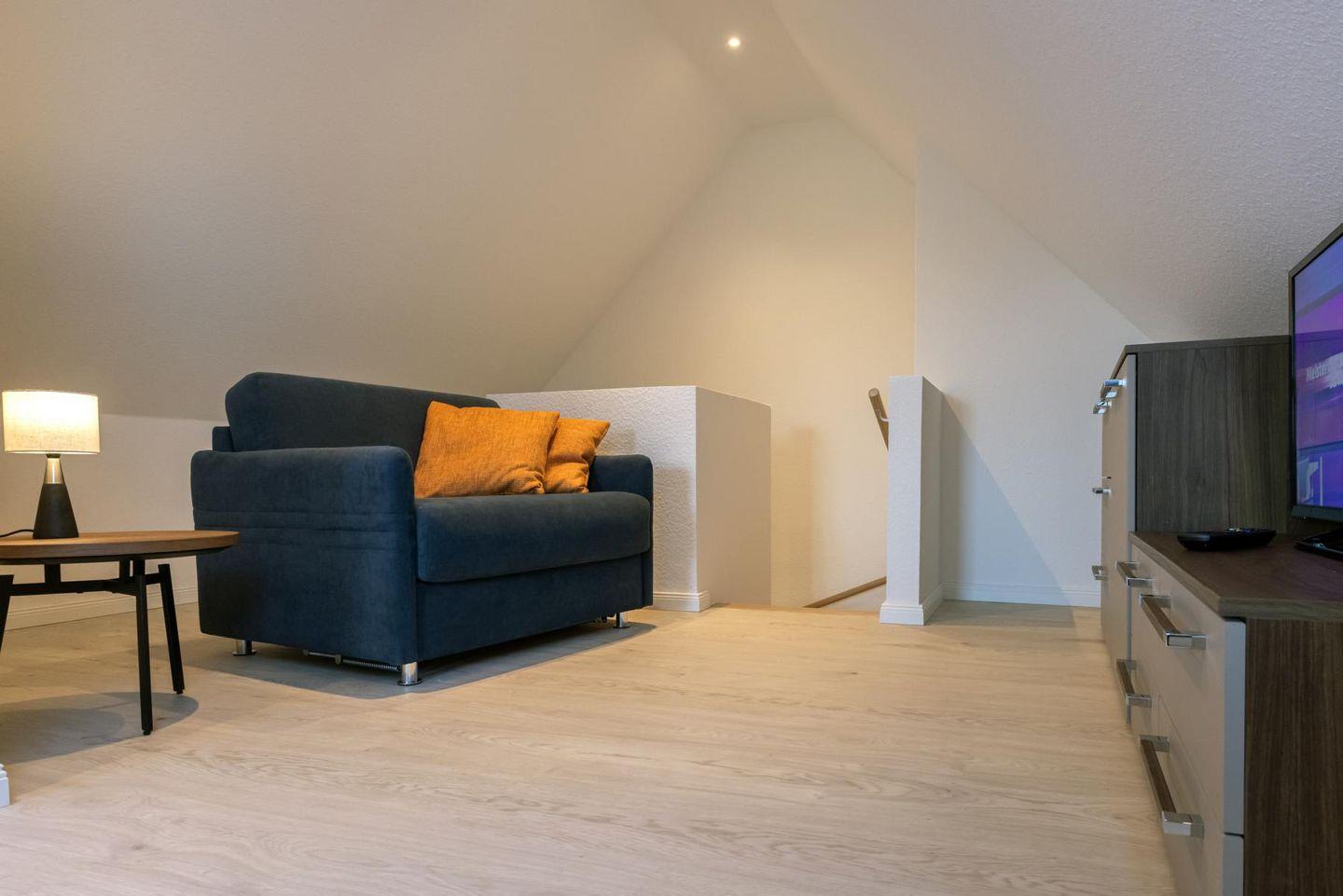 Das Dachgeschoss erreicht Ihr über eine Treppe aus dem Wohnbereich. Hier befindet sich ein weiterer, kleinerer Wohnbereich mit eigenem HD-TV sowie das einem zweite Schlafzimmer mit zwei Einzelbetten und Schränken.
