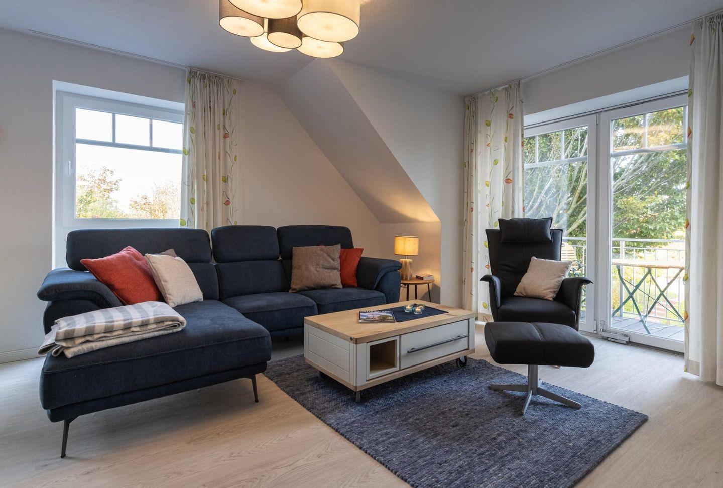 Unsere neue OG-Ferienwohnung „binnen un´ buten“ mit Balkon und Wasserblick liegt im 2021 erbauten Grachtenpark. Im hellen Wohn- und Essbereich mit einladender Sofaecke und einem gemütlichen Ledersessel mit Hocker fühlt man sich gleich wohl. Neben einem Fernseher findet Ihr hier eine kleine Auswahl an Lesestoff sowie Gesellschaftsspiele. Der zentrale Kamin zaubert besonders in der kalten Jahreszeit zusätzlich einen wohligen Charakter in die Wohnung.
