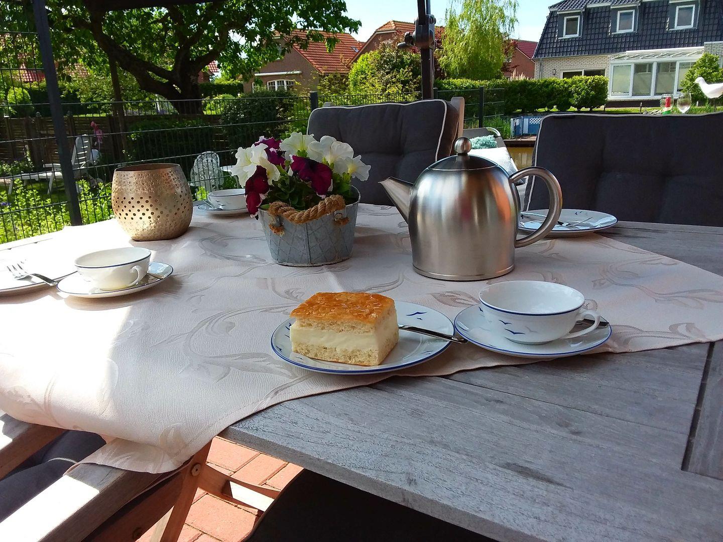 eine moderne Küche mit reichhaltiger Ausstattung, z. B. Backofen, Mikrowelle, Kühlschrank mit Gefrierfach, Geschirrspülmaschine, Kaffeemaschine, Eierkocher, Wasserkocher, Toaster u. v. m. lassen keine Wünsche offen. Ein ostfriesisches Teeservice lädt Sie zu einem gemütlichen ostfriesischen 'Koppke Tee' ein.